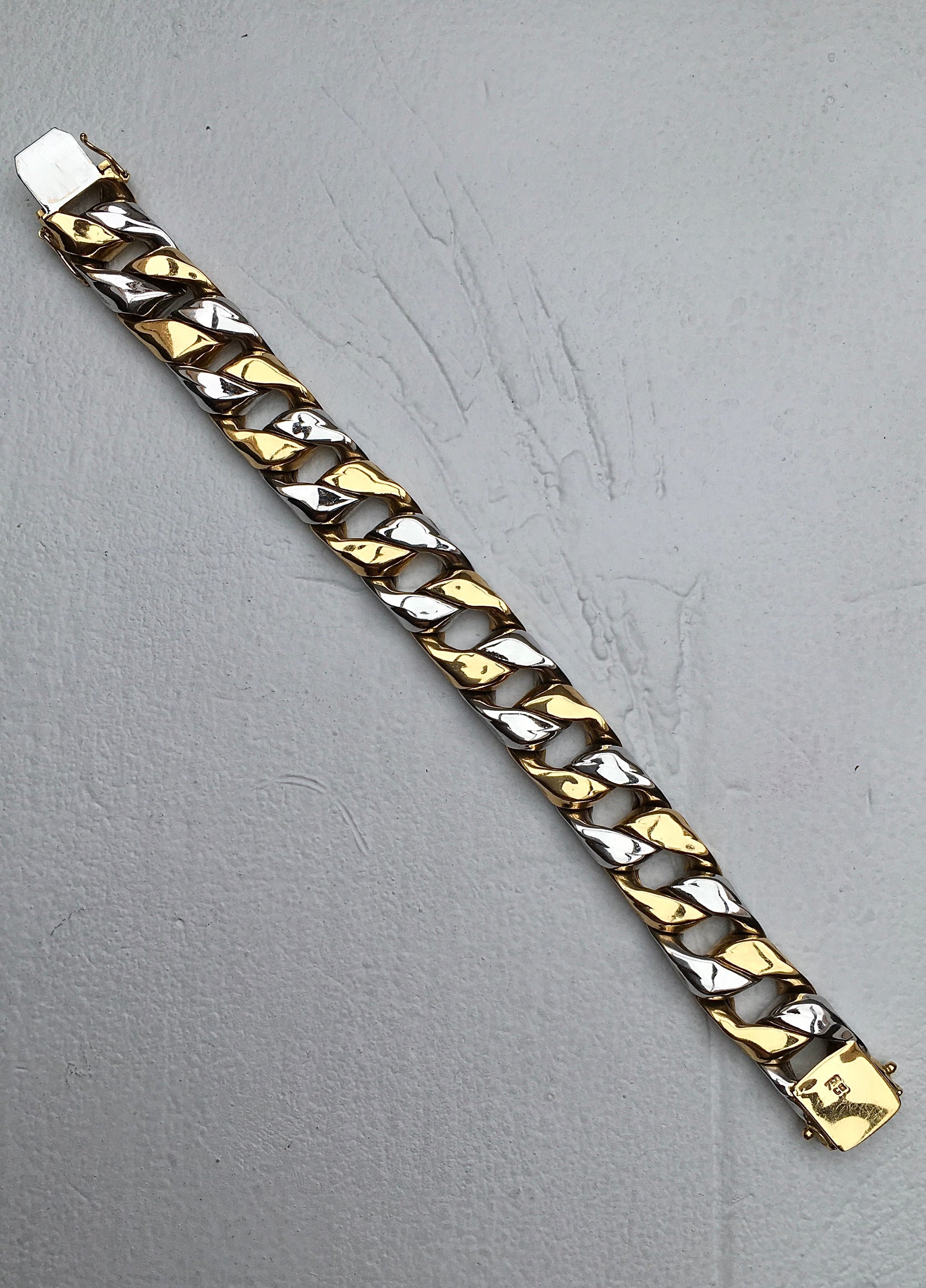 This sensational piece is formed of alternating white and yellow gold hollow Curb links, masterfully finished on one side to mimic silk/satin and expertly polished on the other