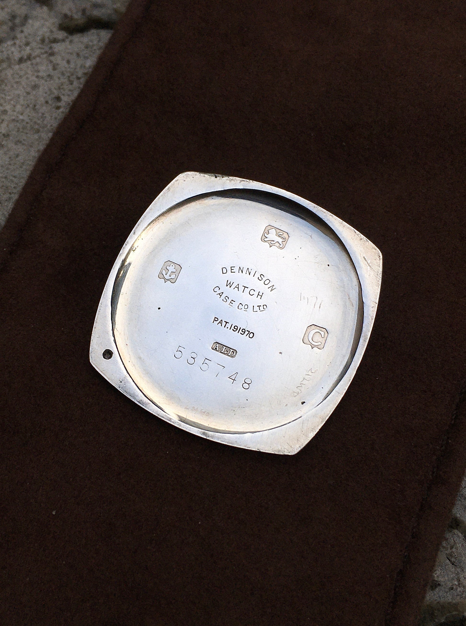 The Dennison case, assayed in Birmingham in 1927, houses an Omega signed 15 jewel manual wind movement