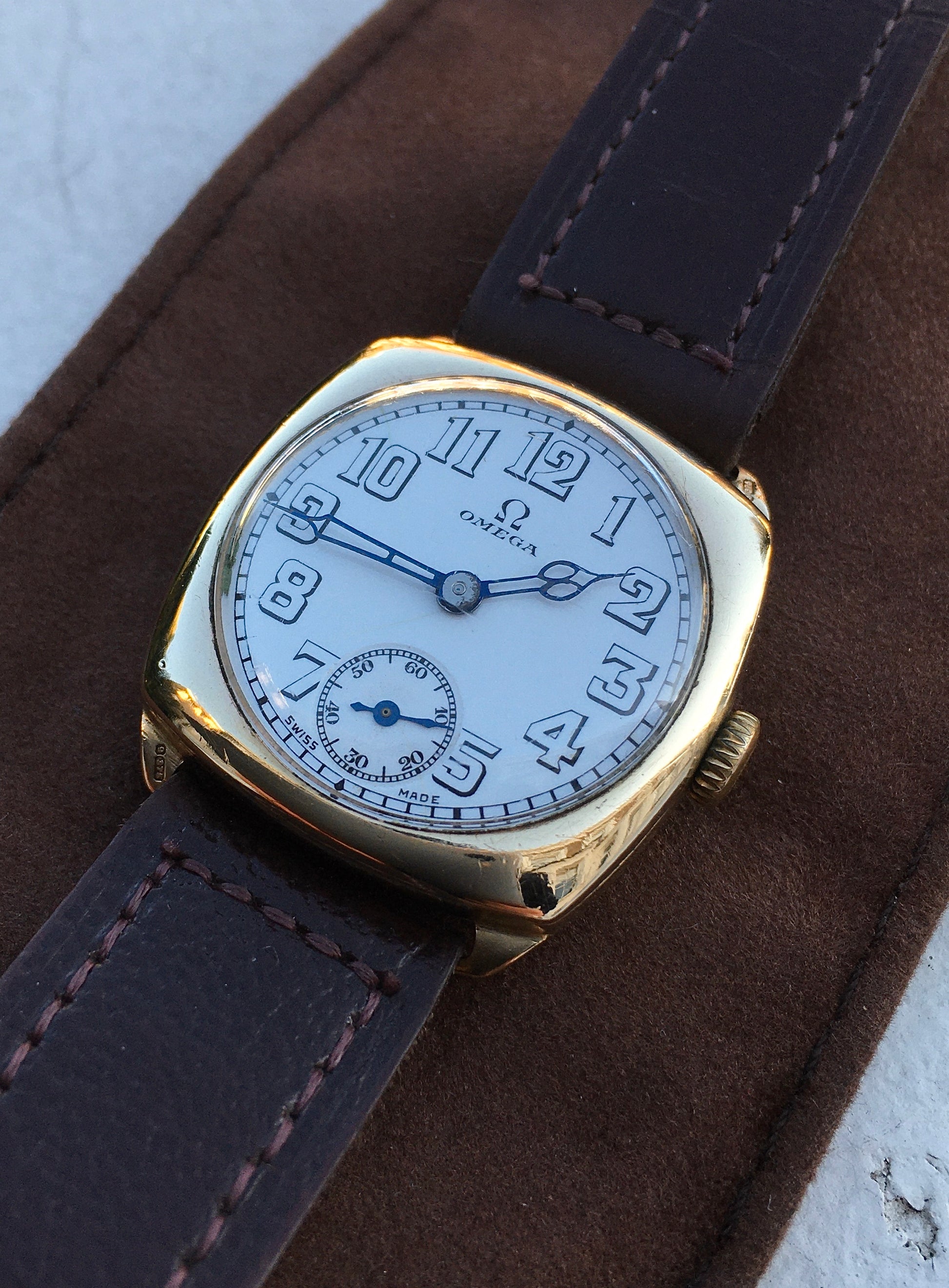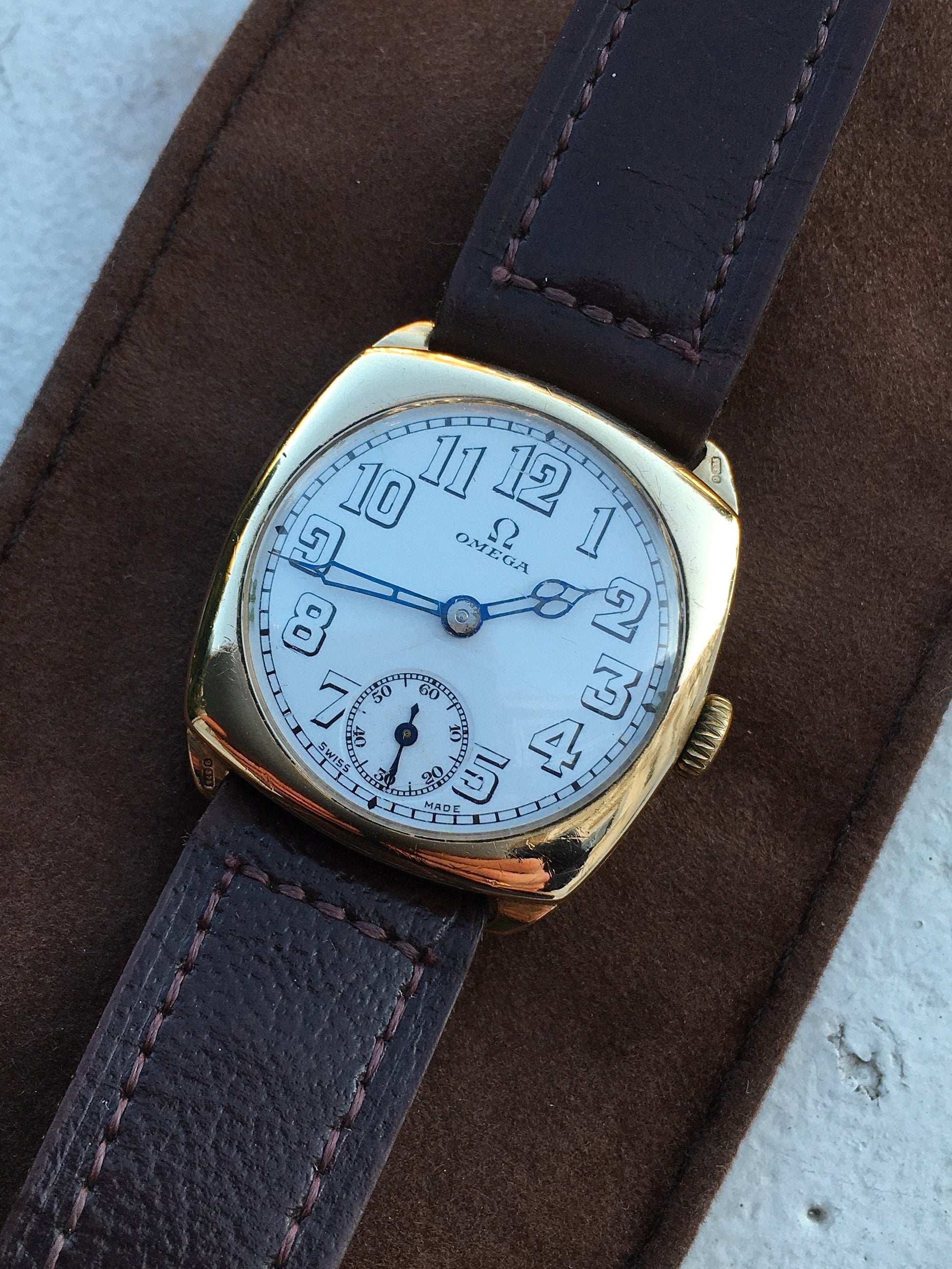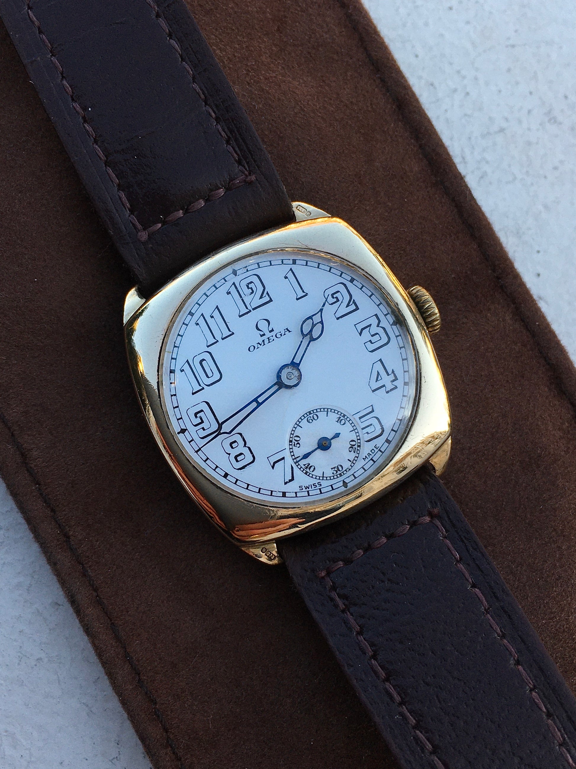 1930s solid 9 carat gold cushion case Omega wristwatch