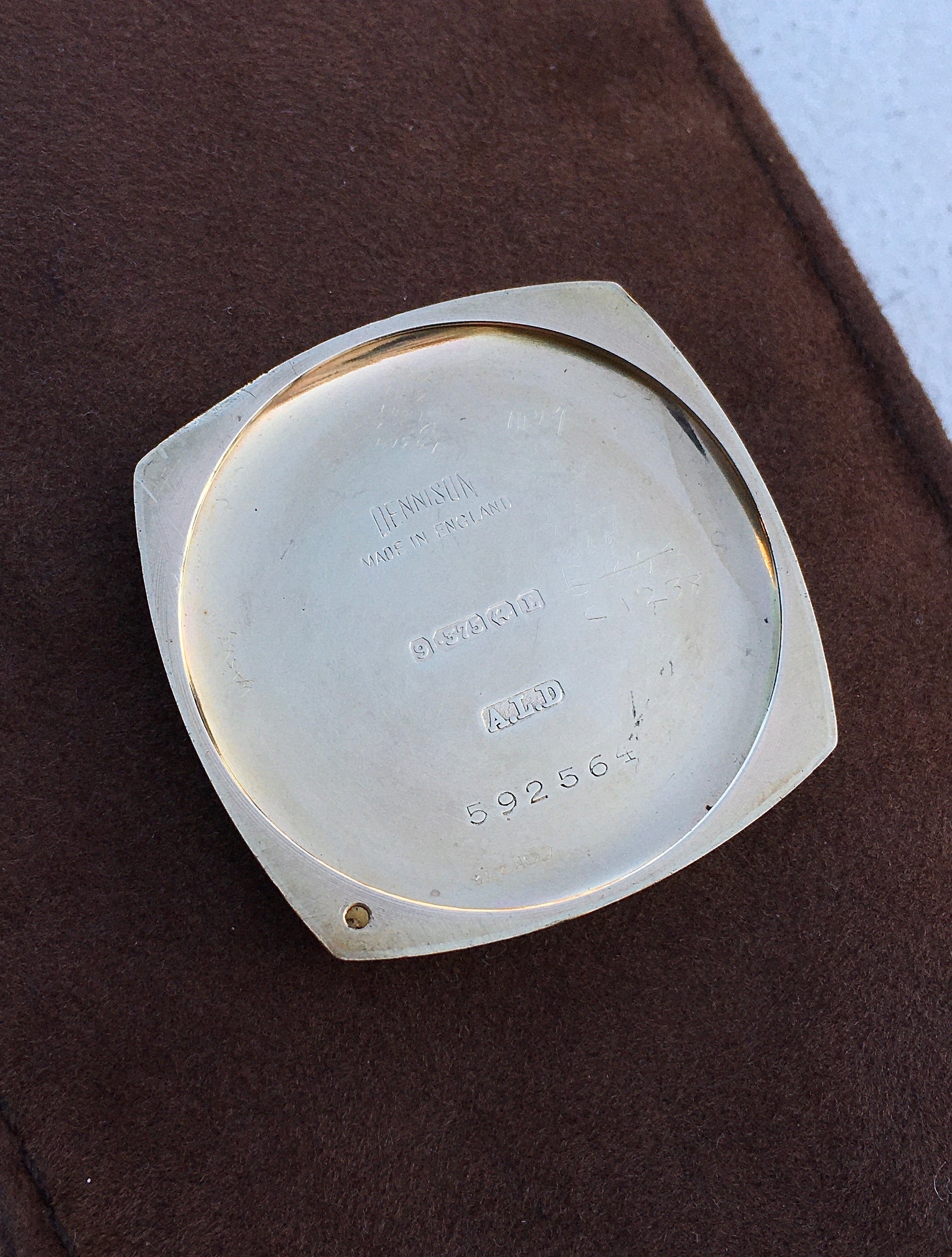 The gold Dennison case is in superb condition and, as well as being hallmarked on the inside of the case back, is uniquely marked ‘9 375’ on the lugs. The case back shows periodic service markings