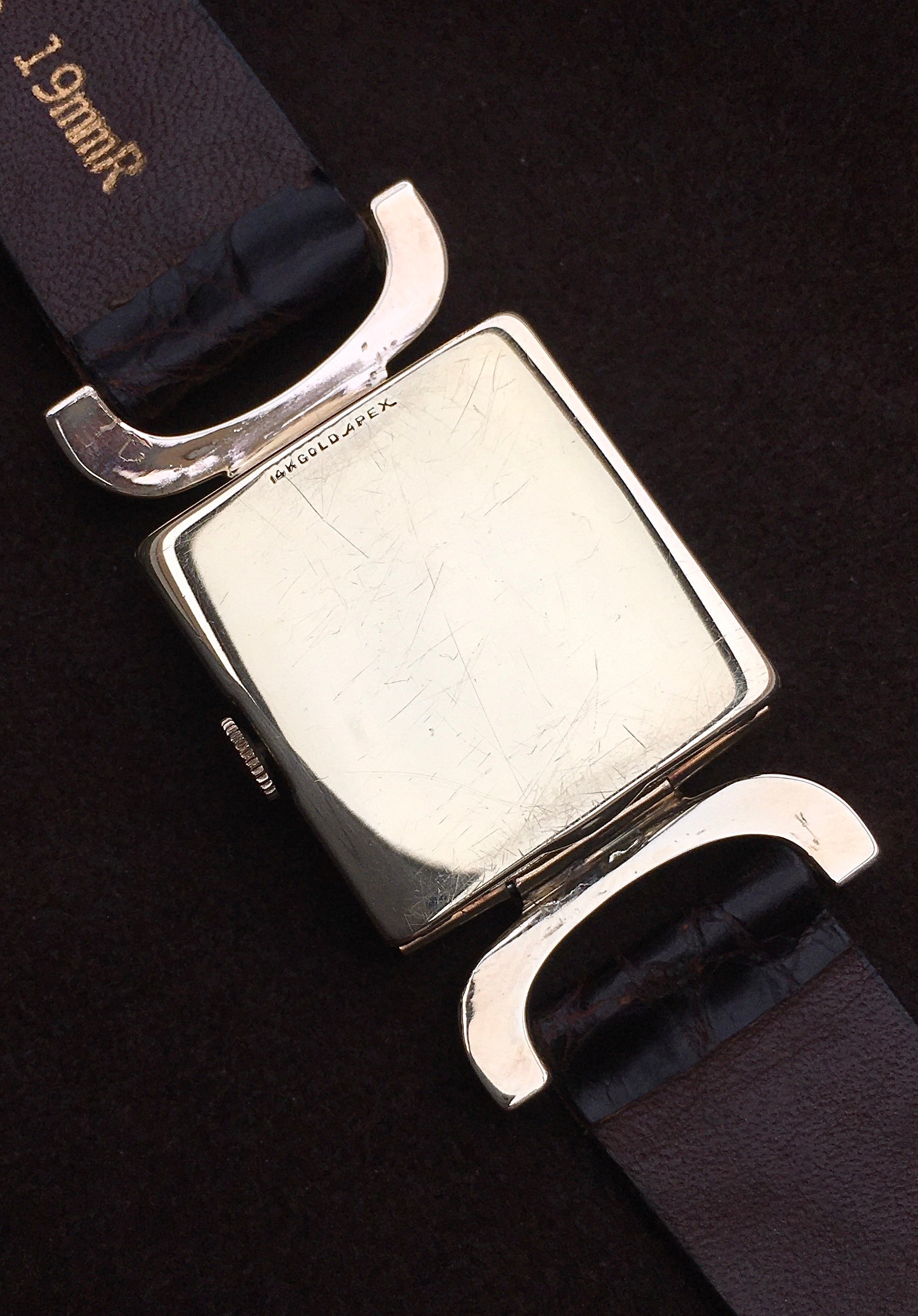 The solid gold case was made by American case maker Apex, a company that made for US brands such a Waltham and Illinois and later fashioned cases for Swiss brands that imported dials and movements to the States, thus saving on high import duties