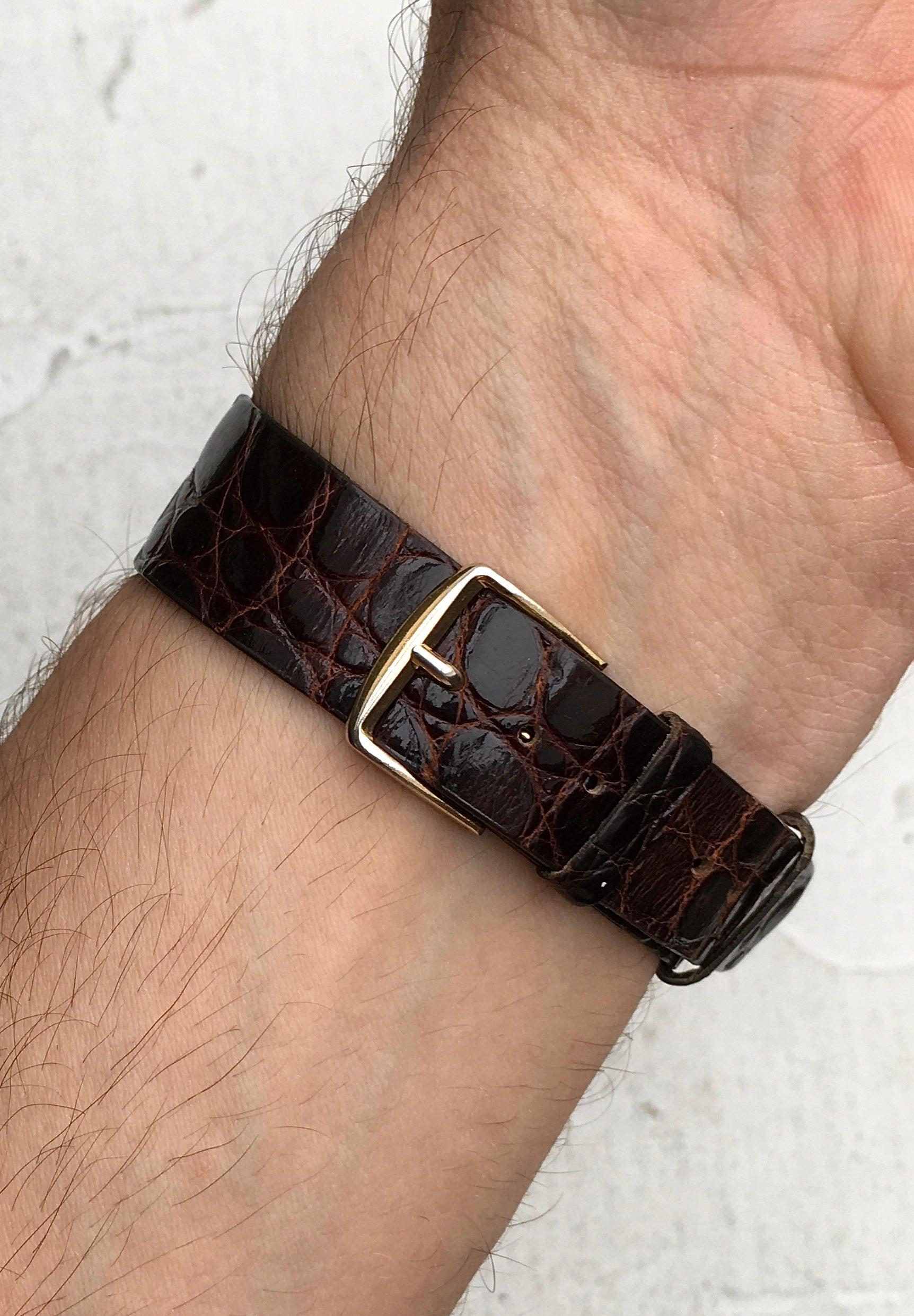 The associated brown genuine alligator strap remains in excellent condition, as does the gold tone buckle