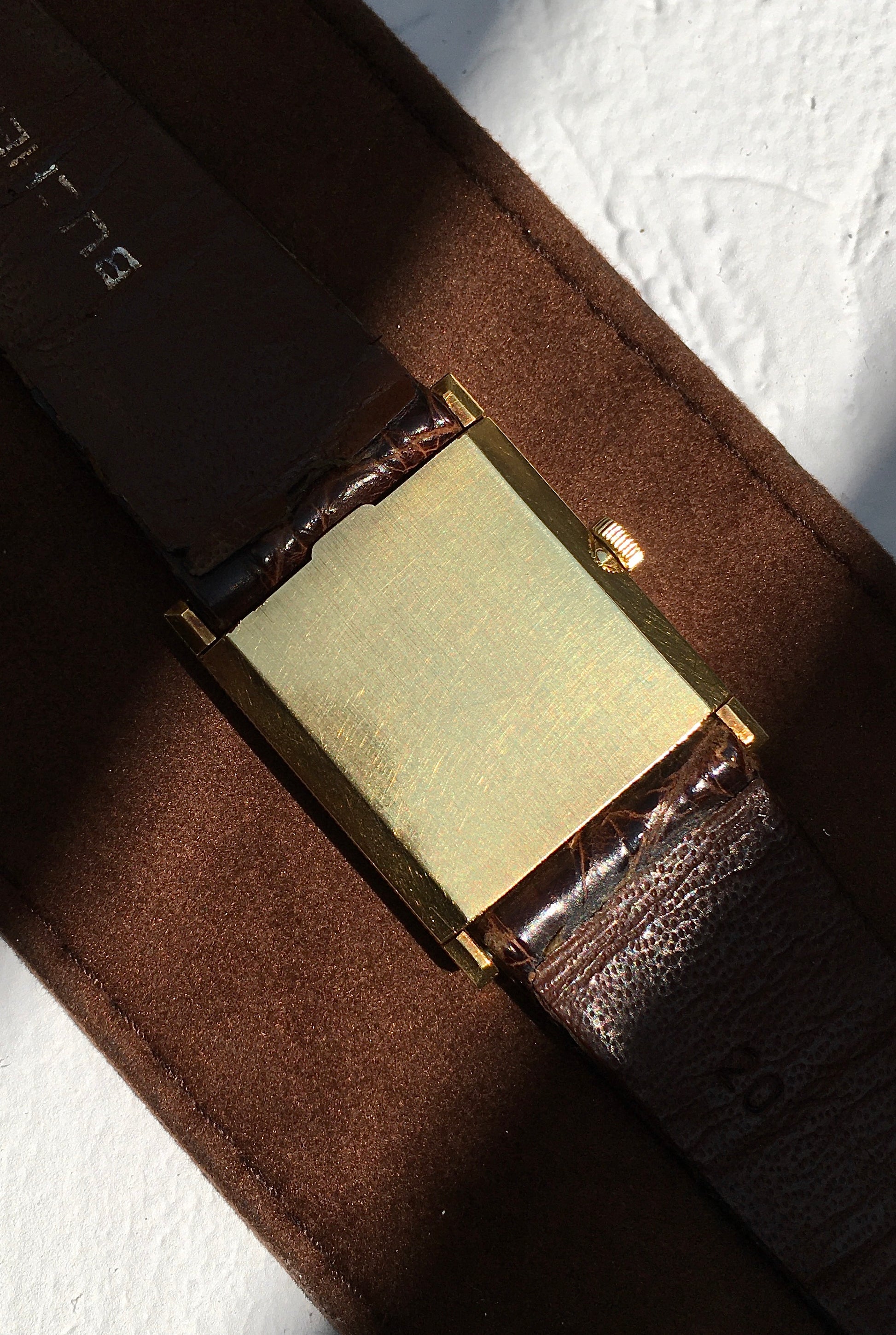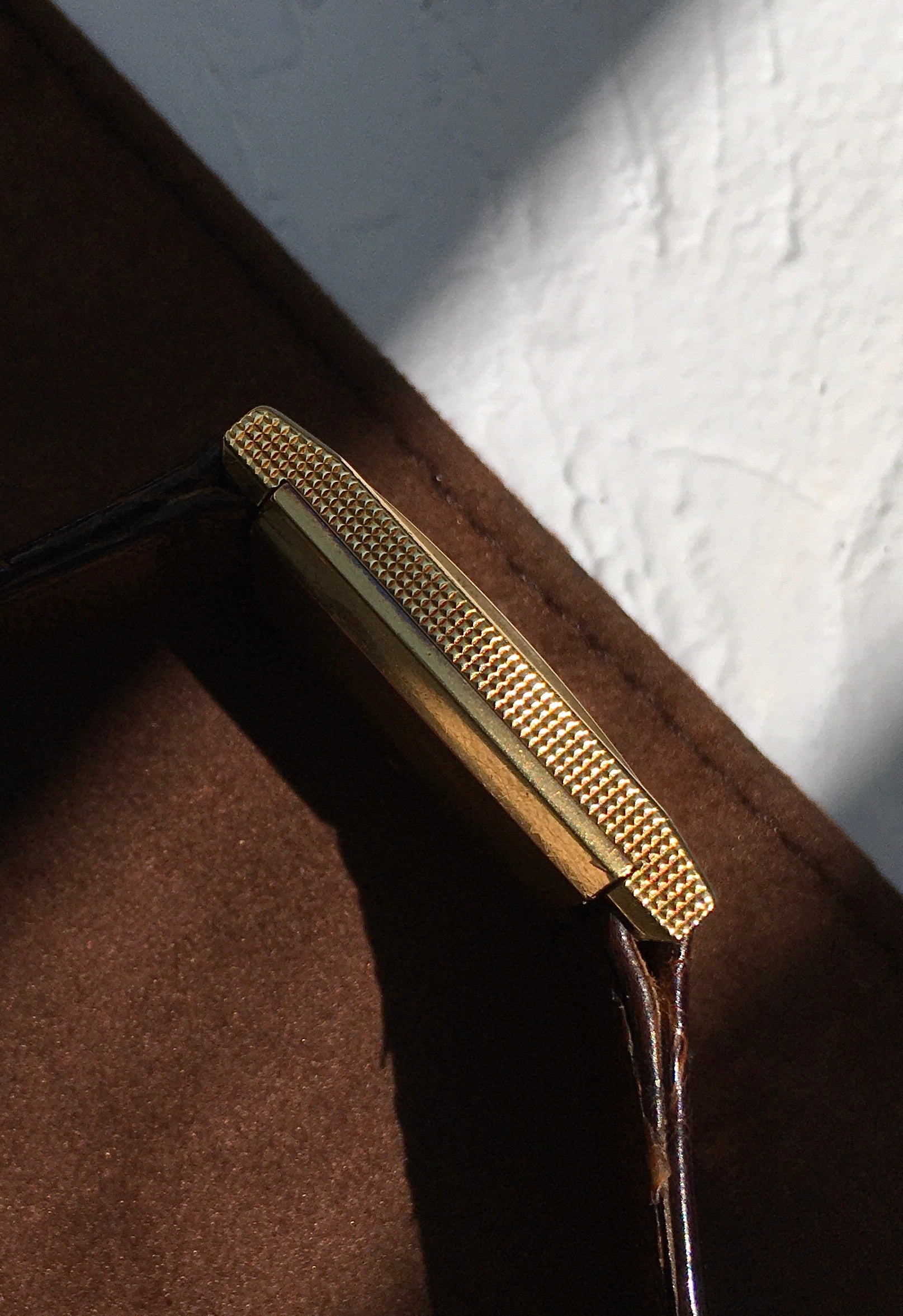 The solid gold case matches the finish of the dial and remains in wonderful condition. The hooded lugs lend themselves to the elegant nature of the piece