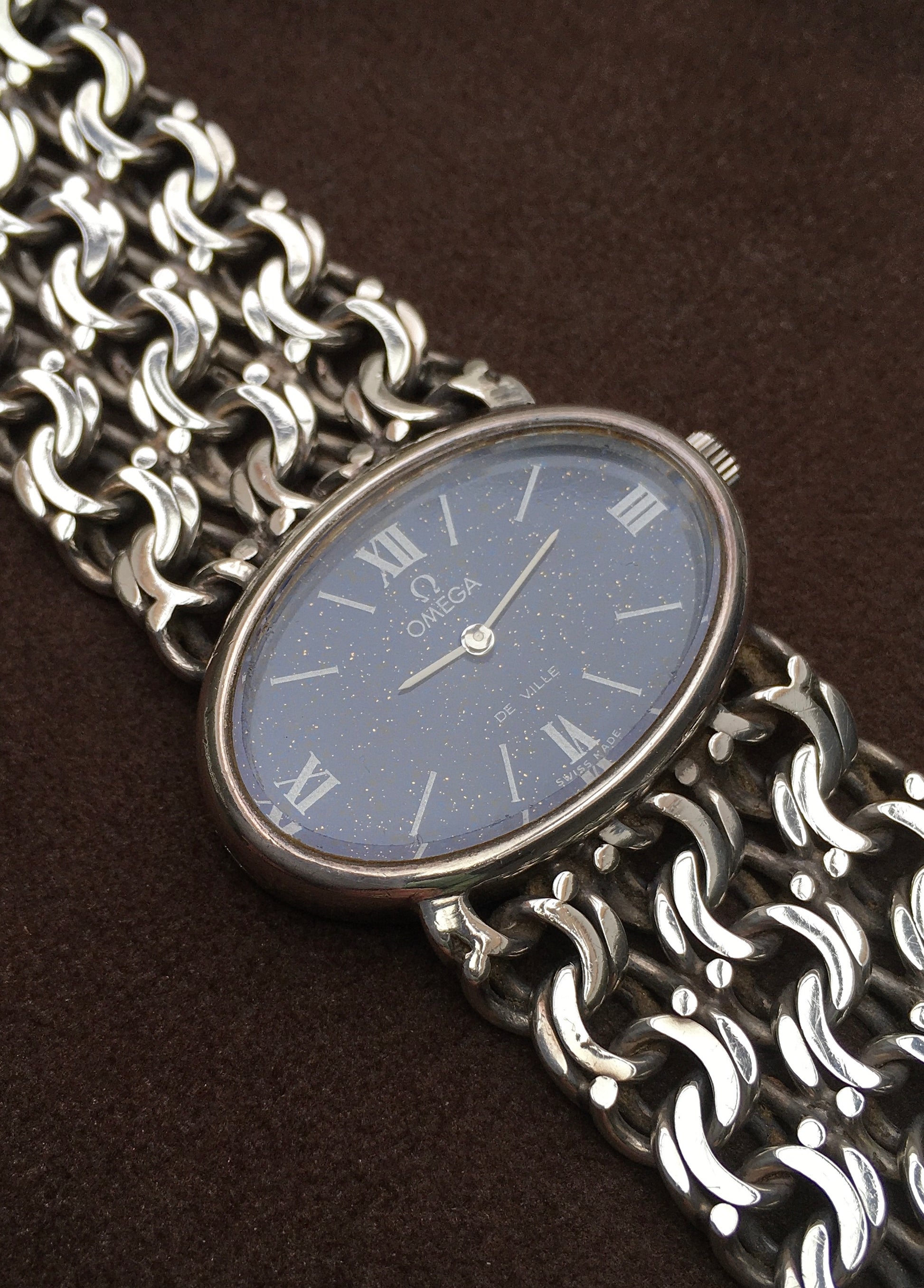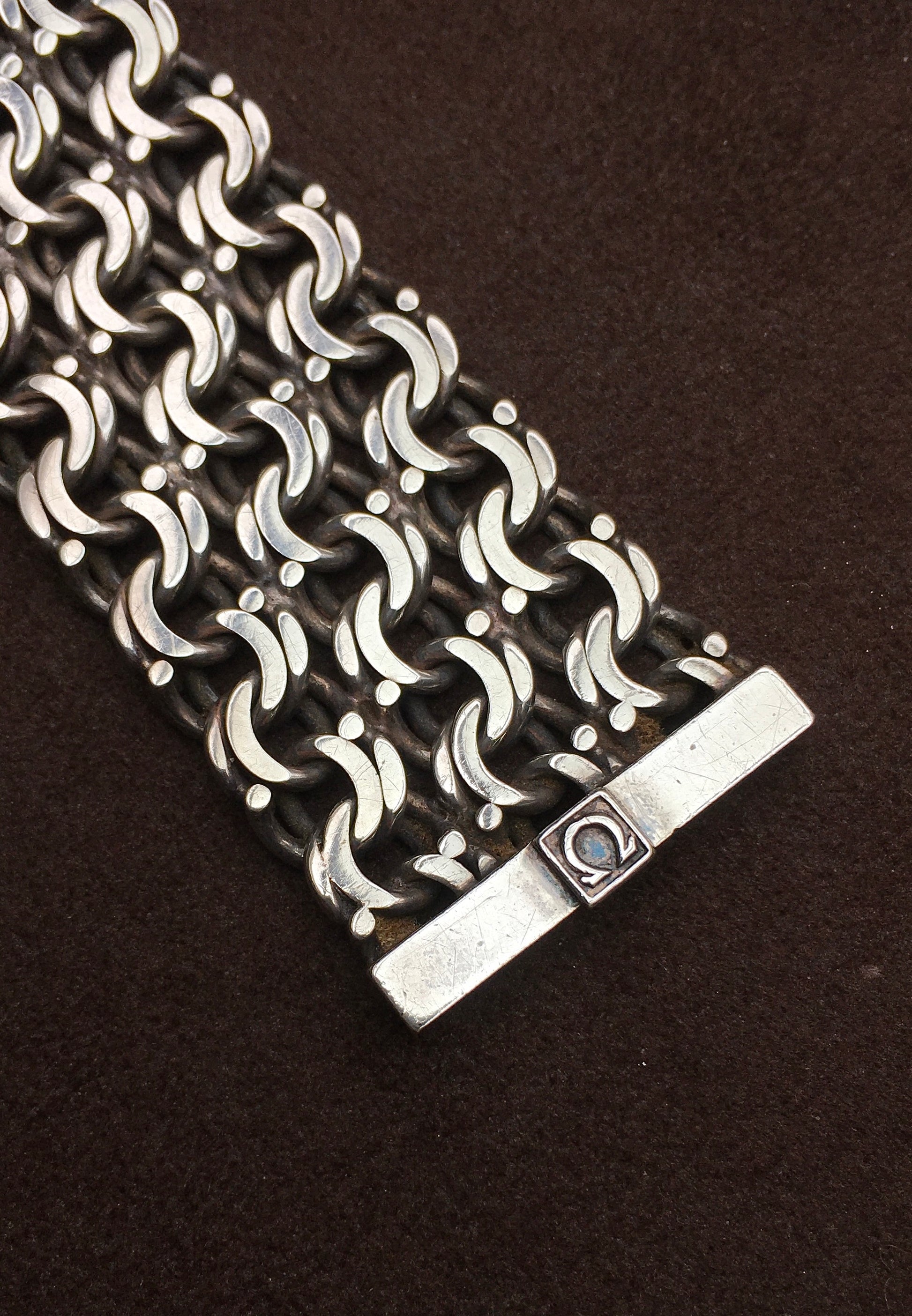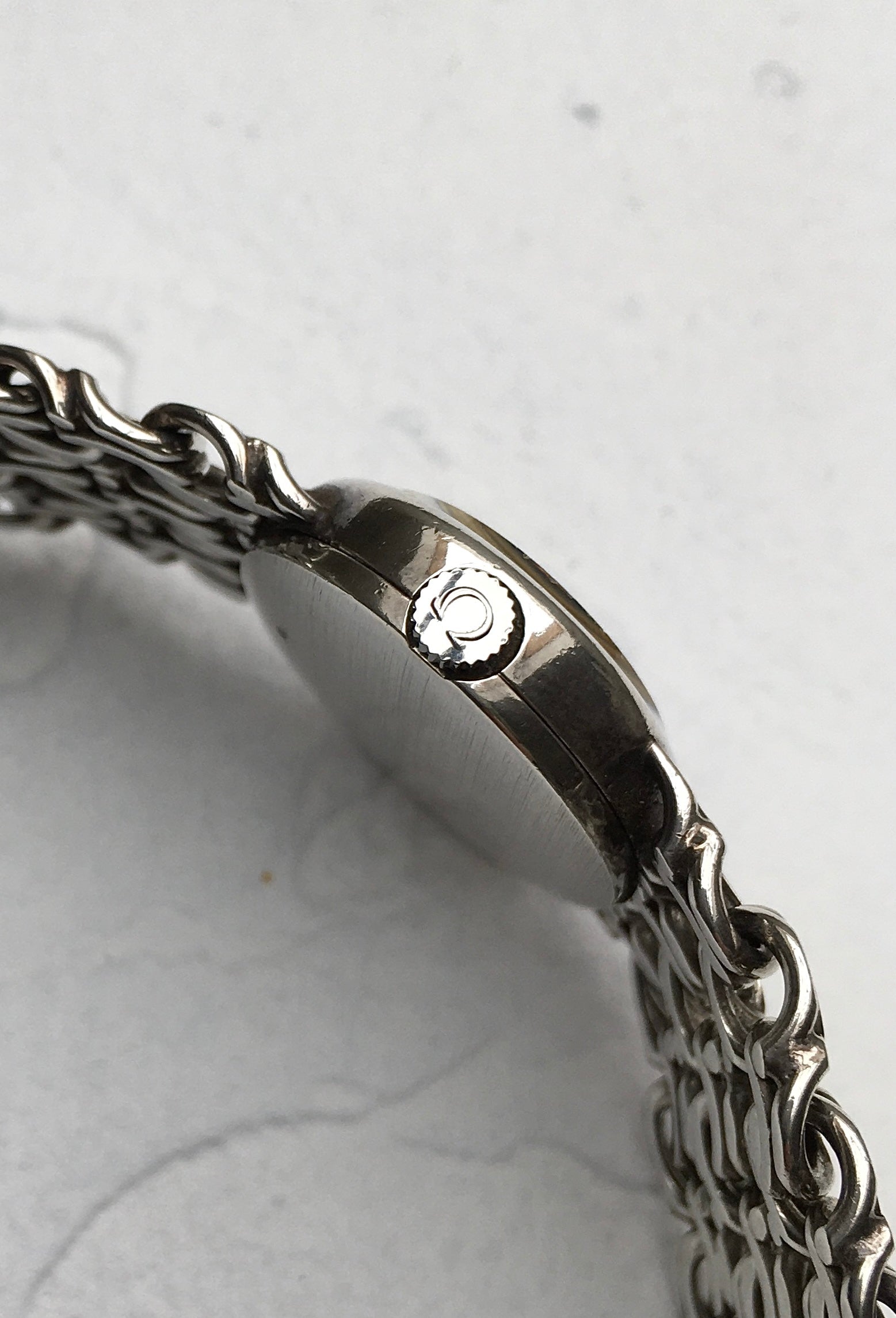 The unpolished integrated multi/fancy link bracelet is in wonderful condition and without signs of stretching. It’s fastened securely by an Omega signed and clearly hallmarked sliding barrel clasp. Check out the bluing on the logo