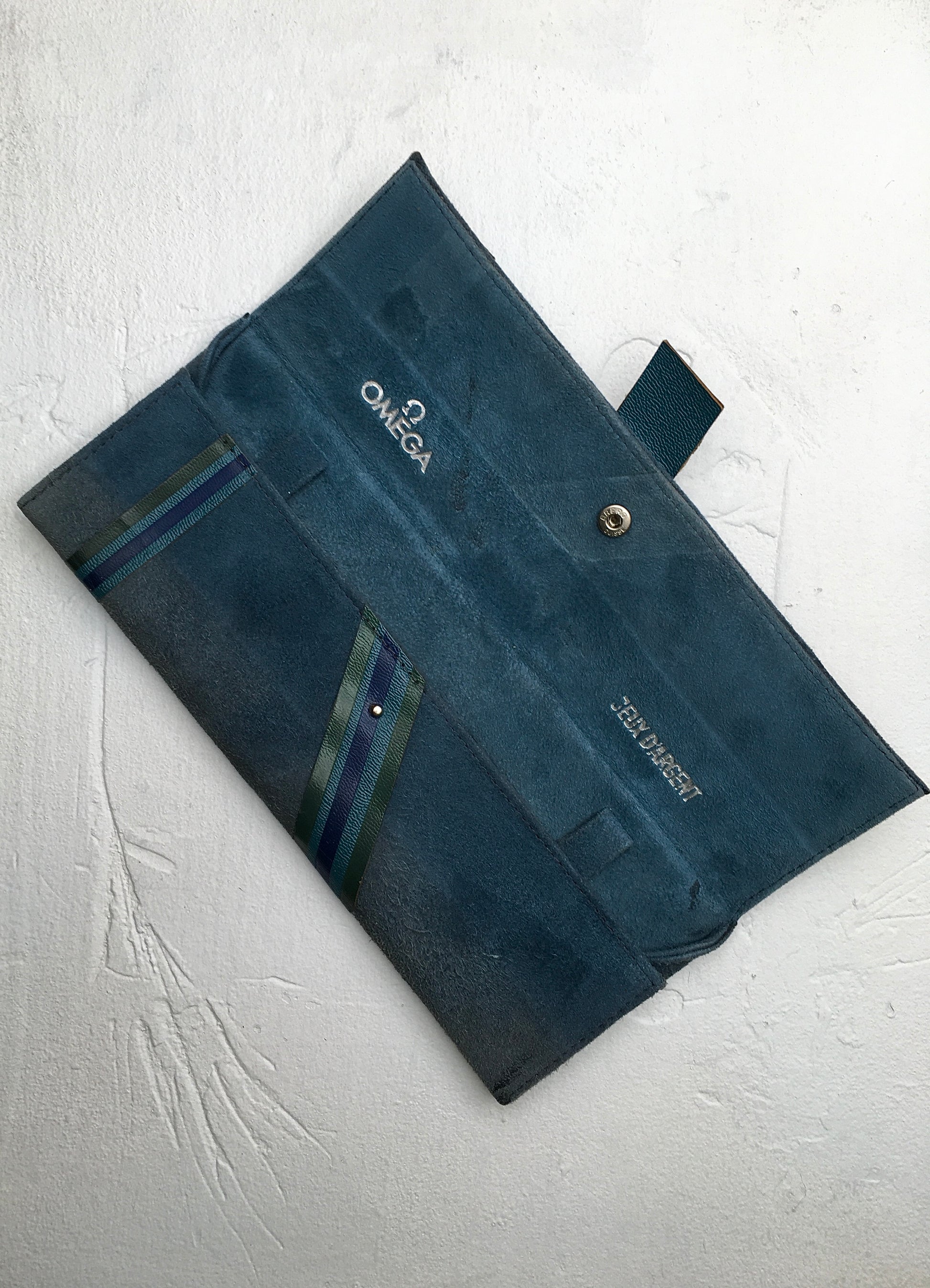 The watch is presented alongside its original suede Jeux d’Argent sleeve, now as much a collector’s piece as the watch