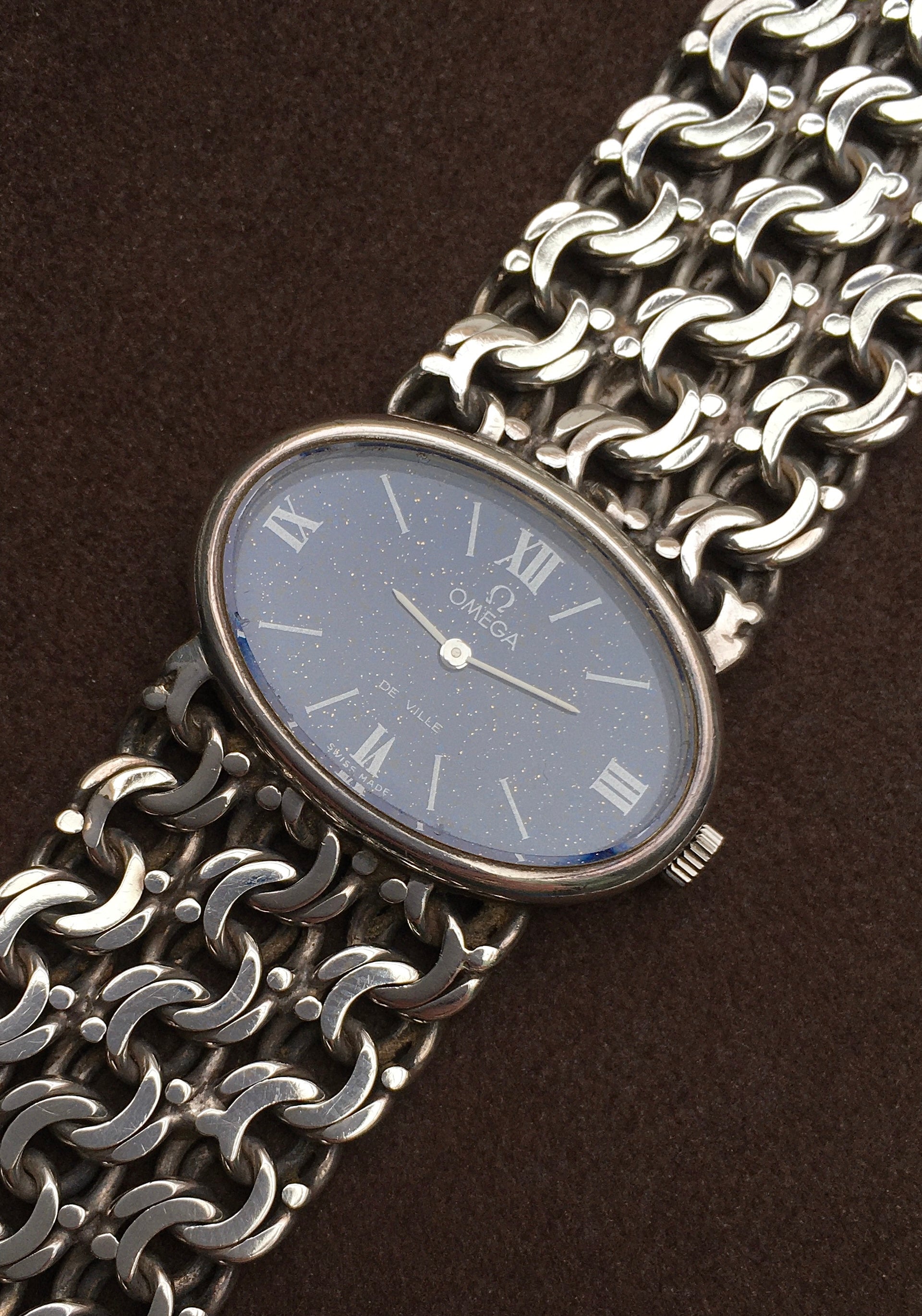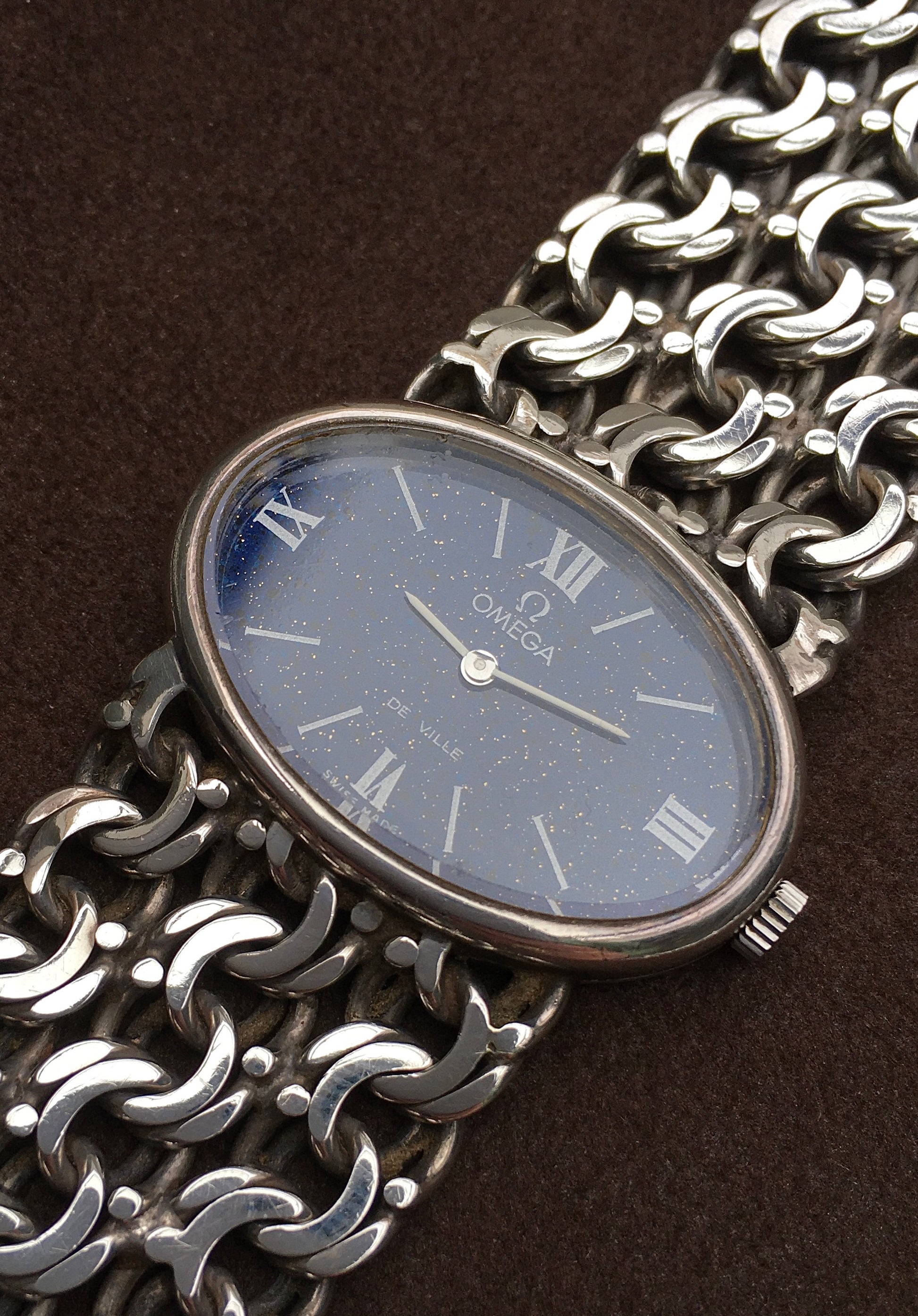 This piece is presented in outstanding, unpolished condition and features an especially rare Lapis Lazuli enamel dial in immaculate condition. It’s decorated with white stick indices, quarter hour Roman numerals, white baton hands and the Omega logo