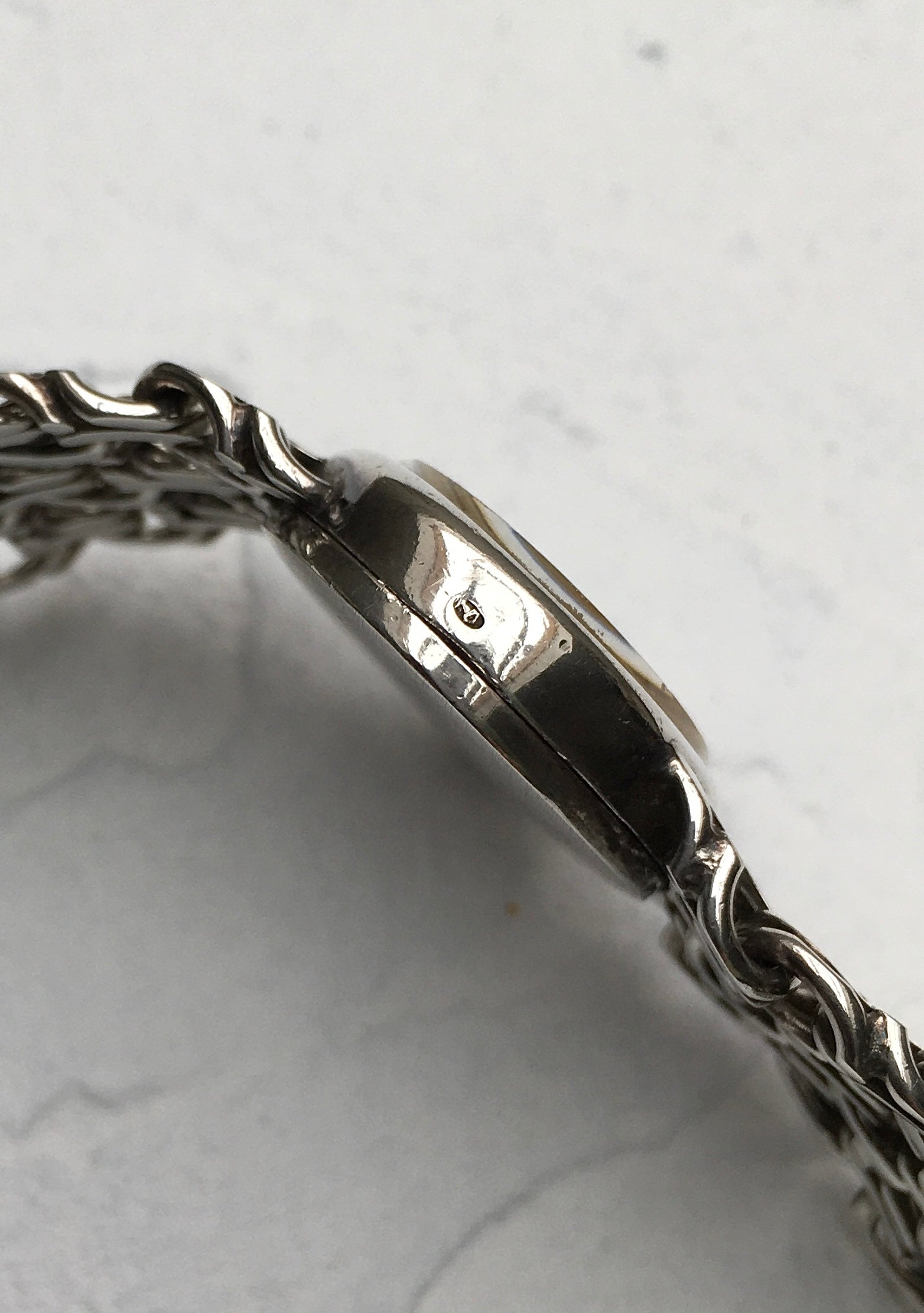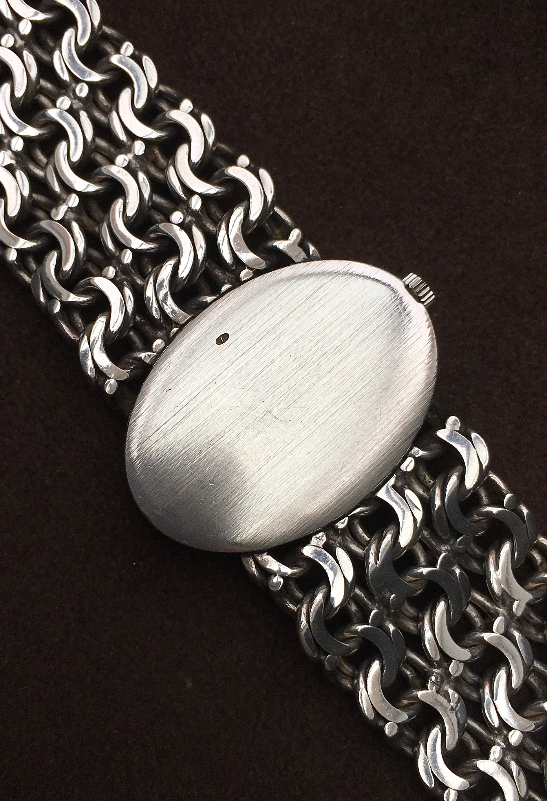 The timeless designs of esteemed jeweller Andrew Grima present themselves in this outstanding 1974 Jeux d’Argent Omega De Ville. As the model’s name suggests, both the Omega Watch Company (OWC) case and integrated bracelet are fashioned of Sterling Silver, making this timepiece more jewellery than watch