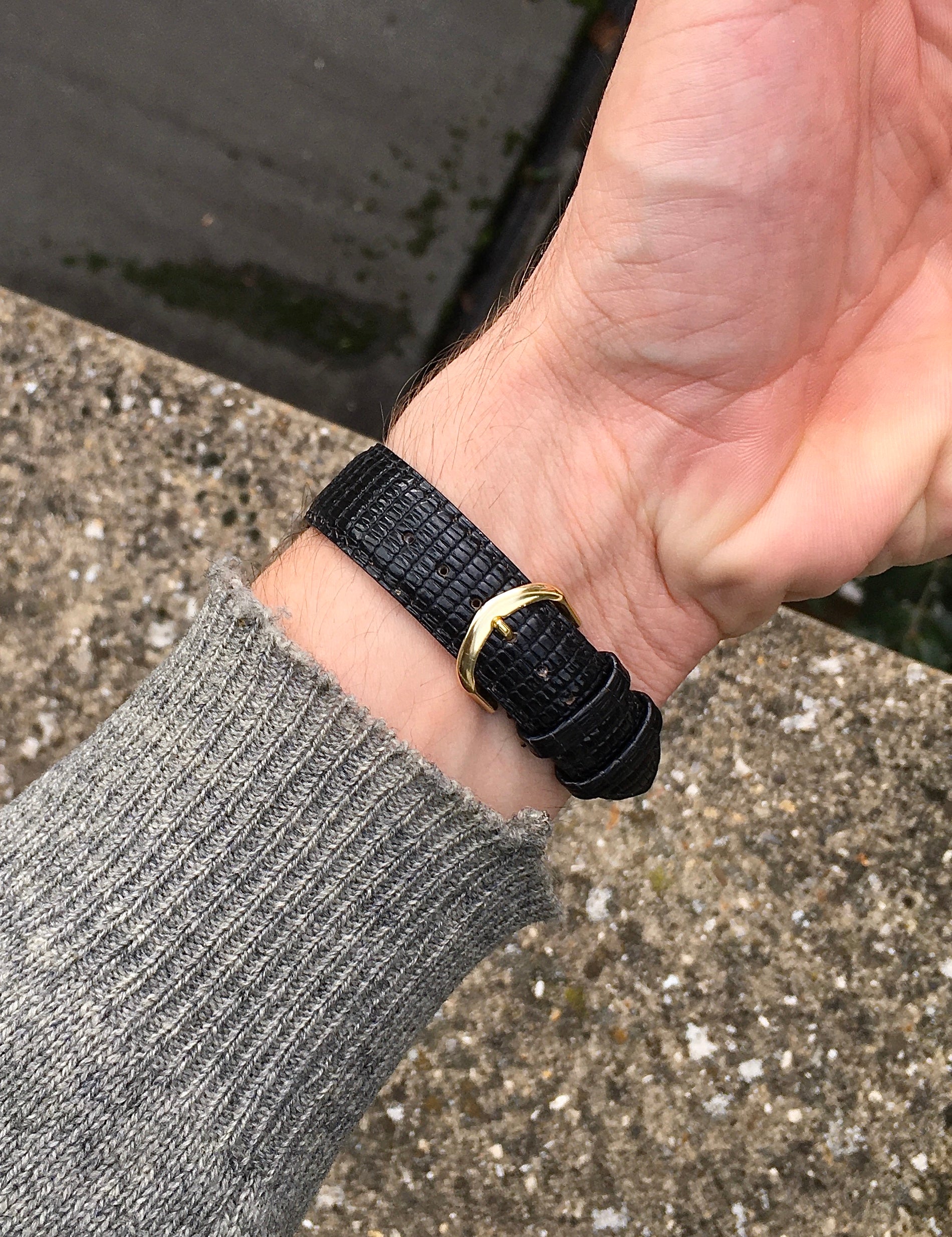 Fitted with a black pressed leather strap and gold tone buckle
