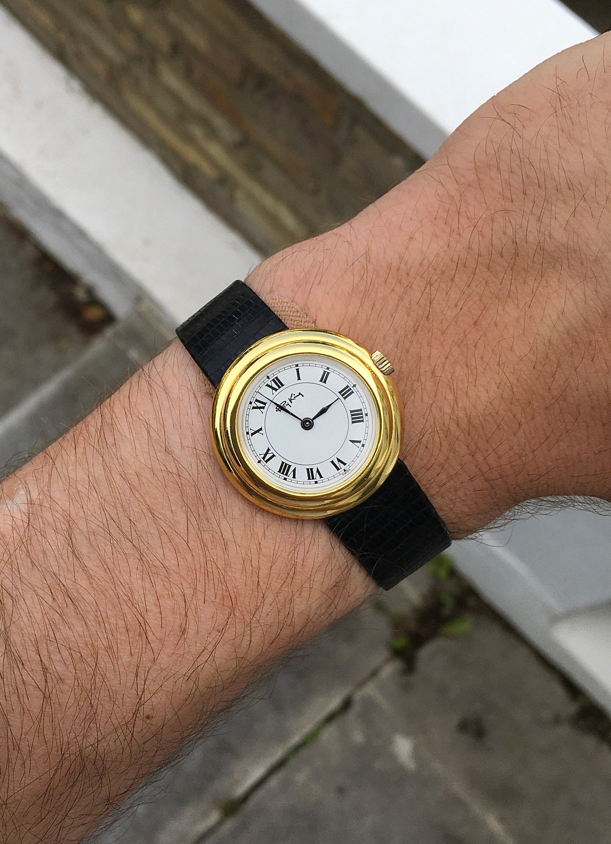 The spotless white dial carries black Roman numerals, a ‘Chemin de Fer’ minute track, elegant ‘Lozenge’ hands and, of course, the signature of the ‘Saviour of Sterling’ himself