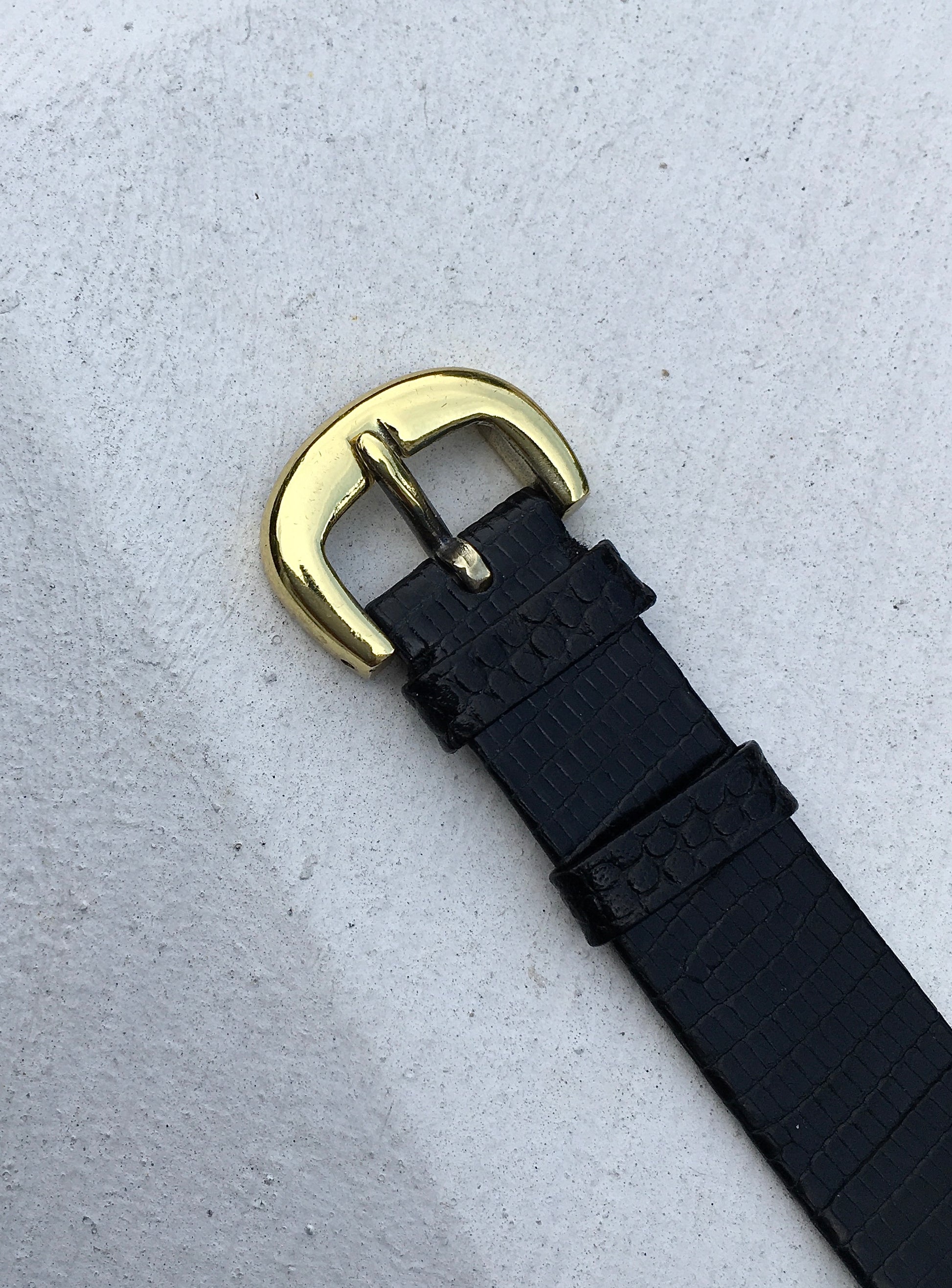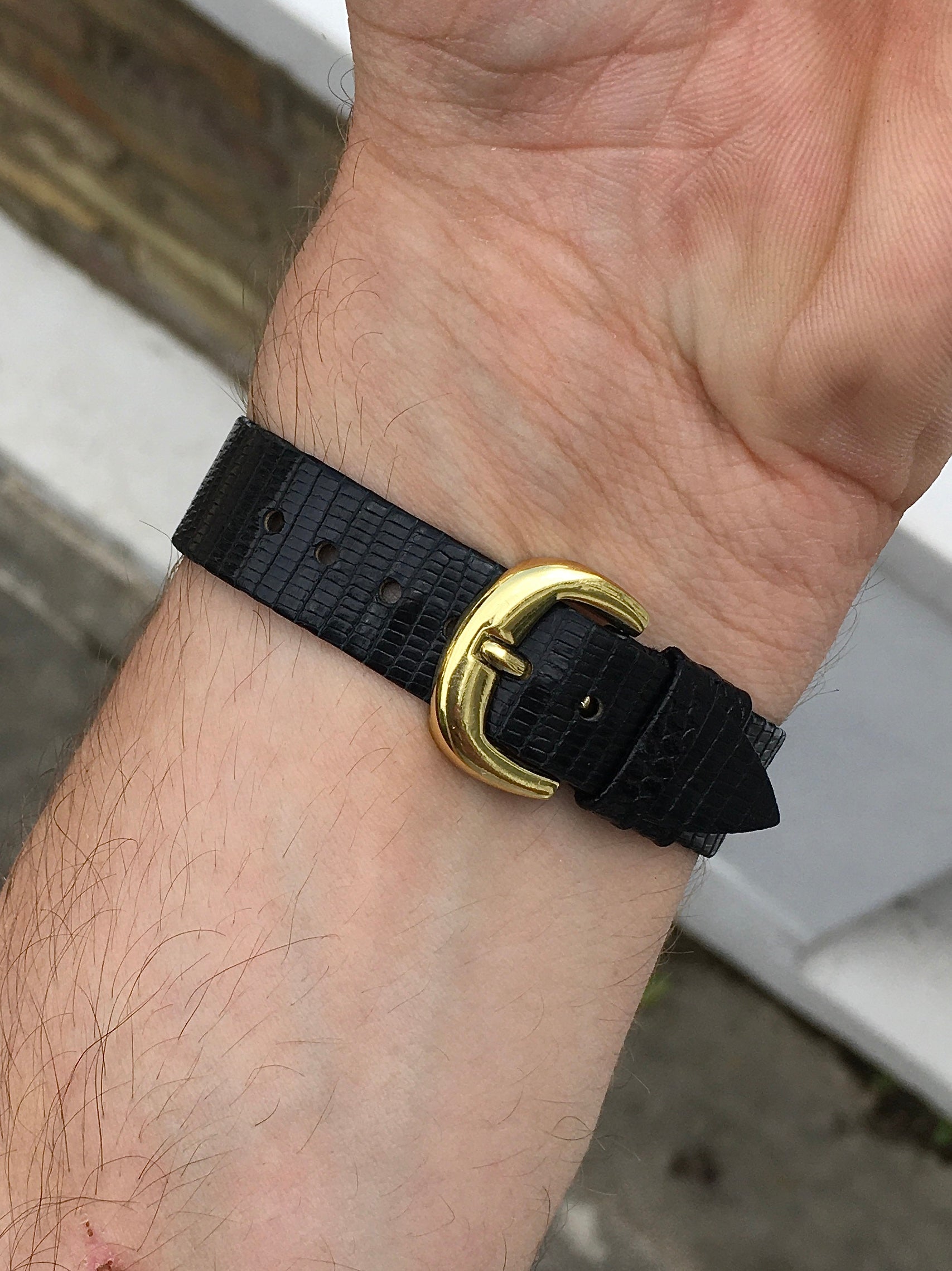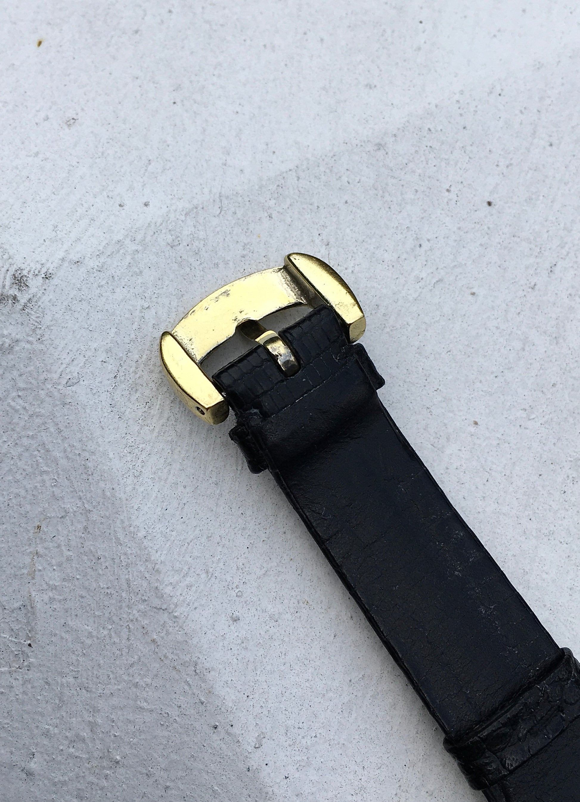 The original pressed leather strap is in superb condition, with the only noticeable sign of wear being to the underside of the authentic gilded buckle