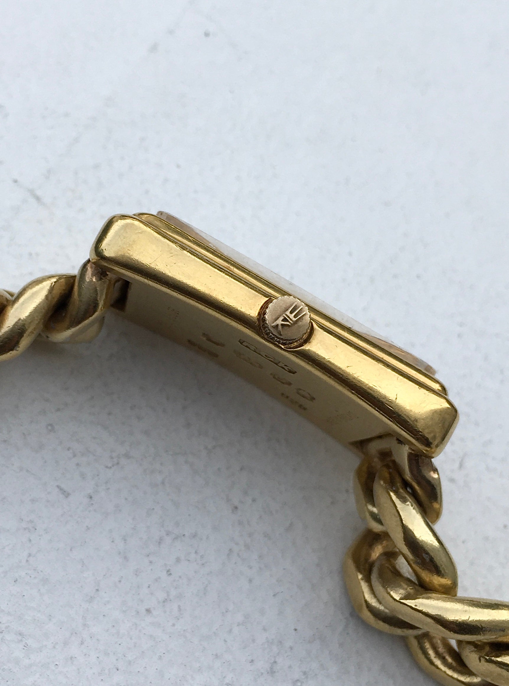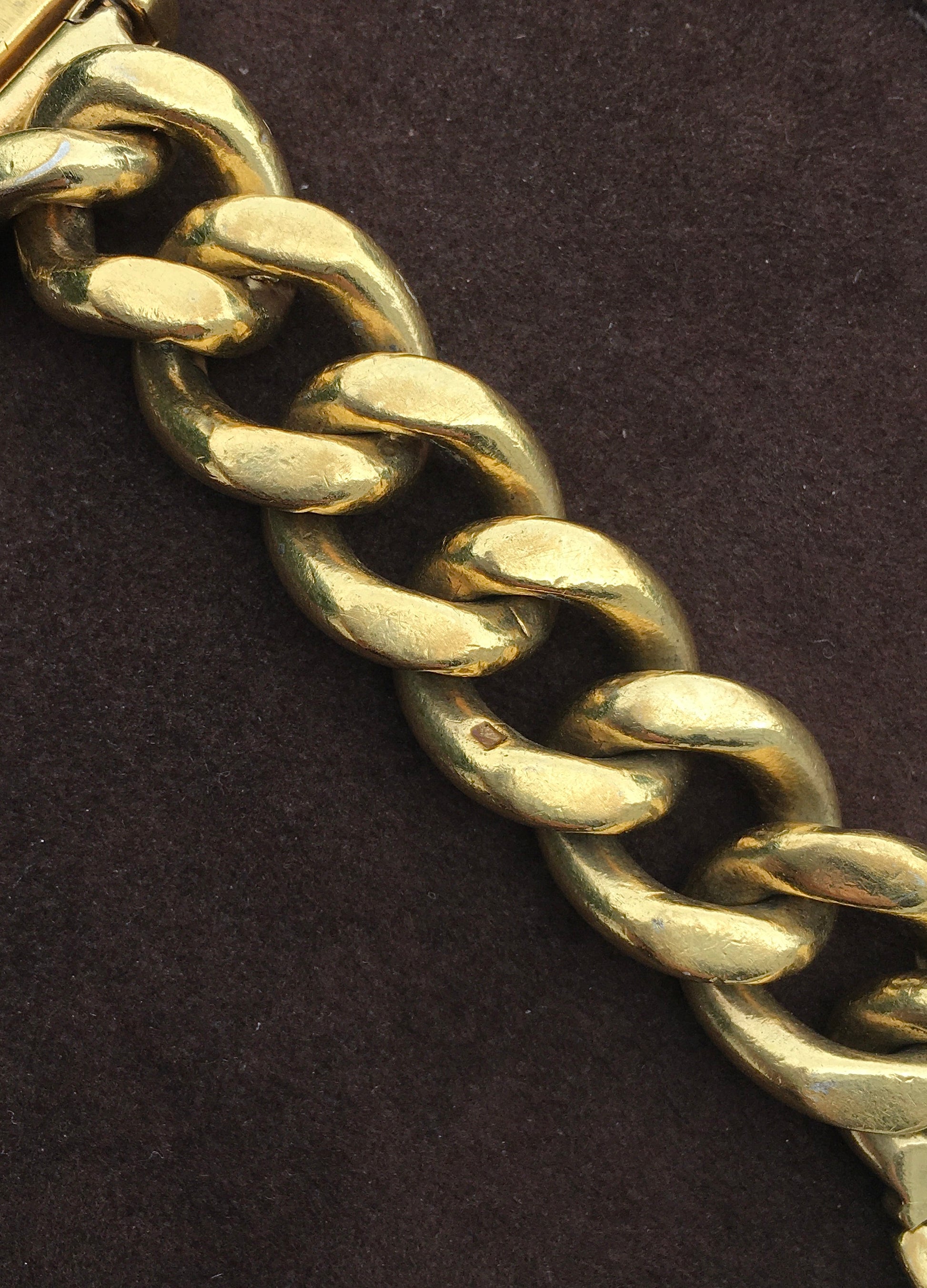 The weighty, lugged, Curb bracelet is stamped with England’s ‘walking lion’ on two links and is securely fastened by the brand’s iconic buckle clasp (both ends of which are clearly, almost excessively stamped)