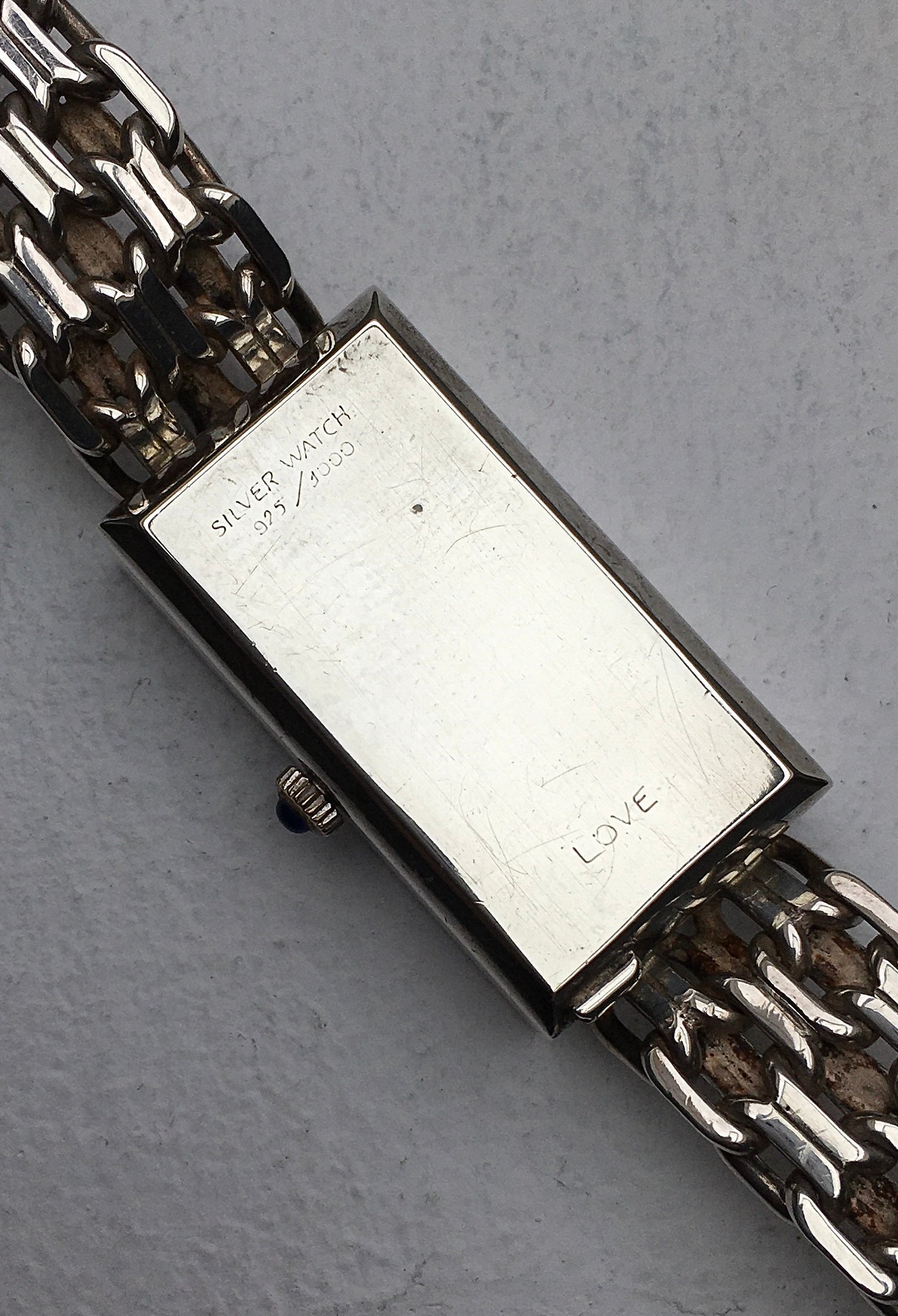 The weighty solid silver case is in nice condition with an engraving of the watches fineness on the case back as well as ‘LOVE’