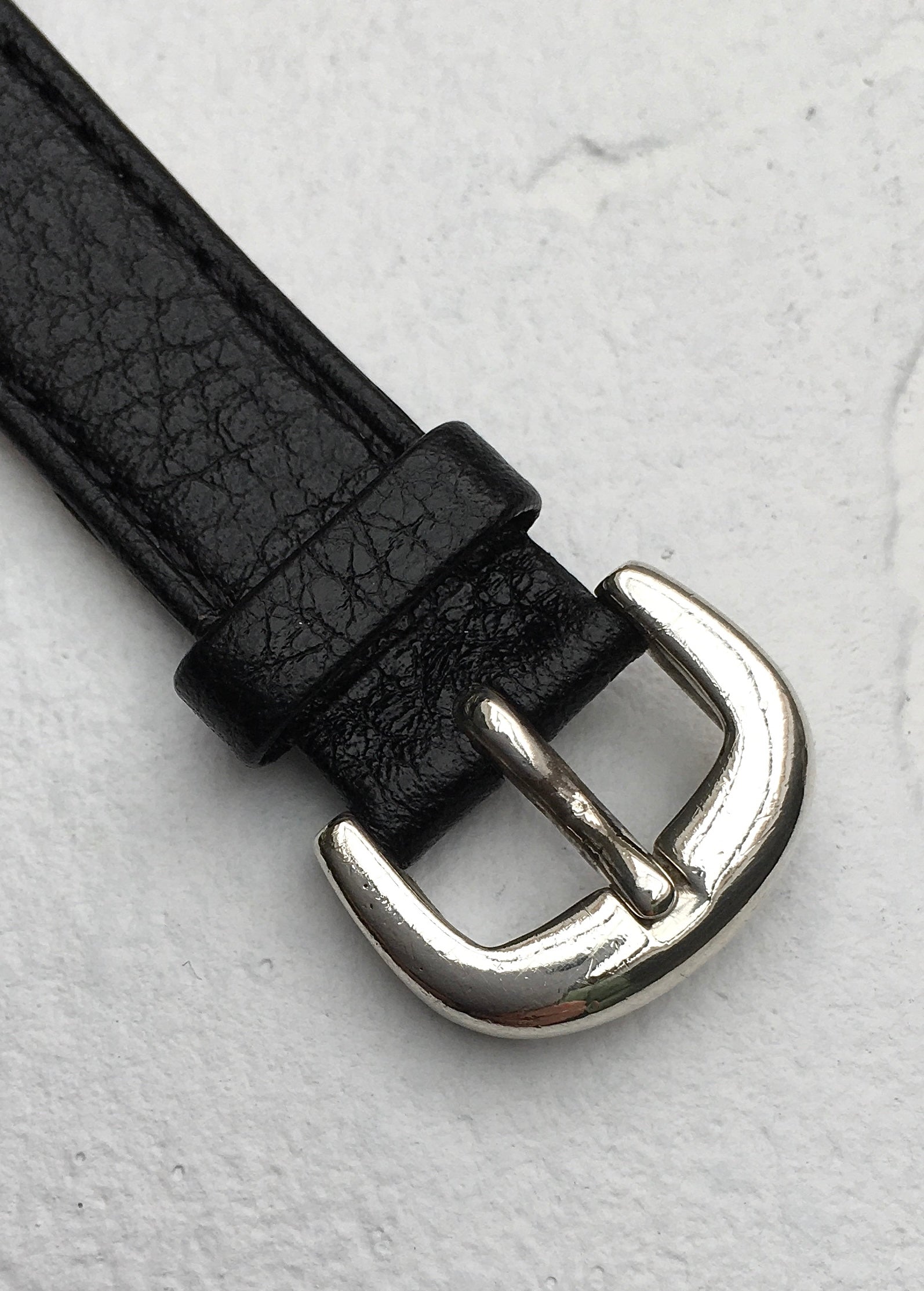 The original Sterling Silver buckle is present and set in a brand new black calf skin leather strap