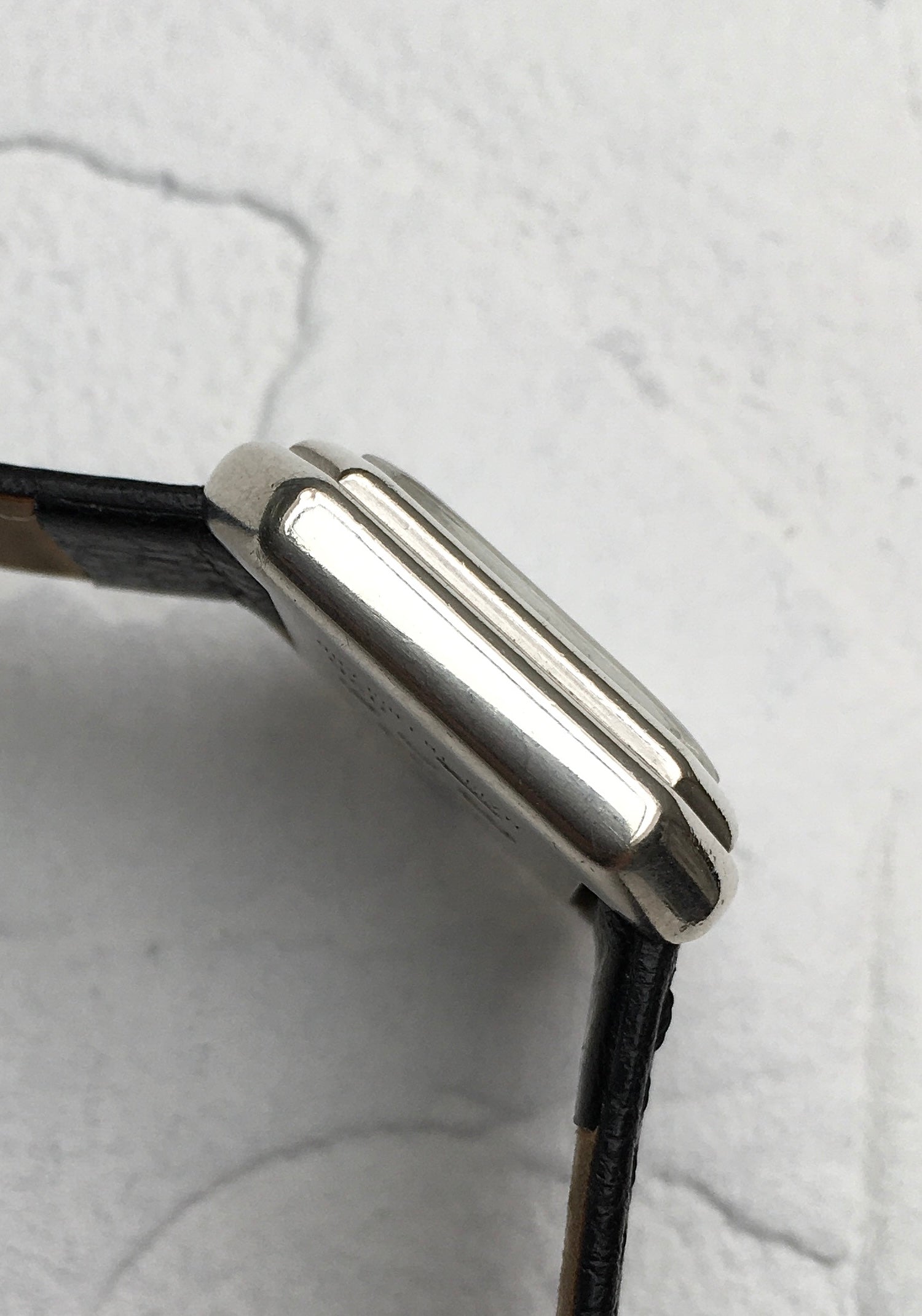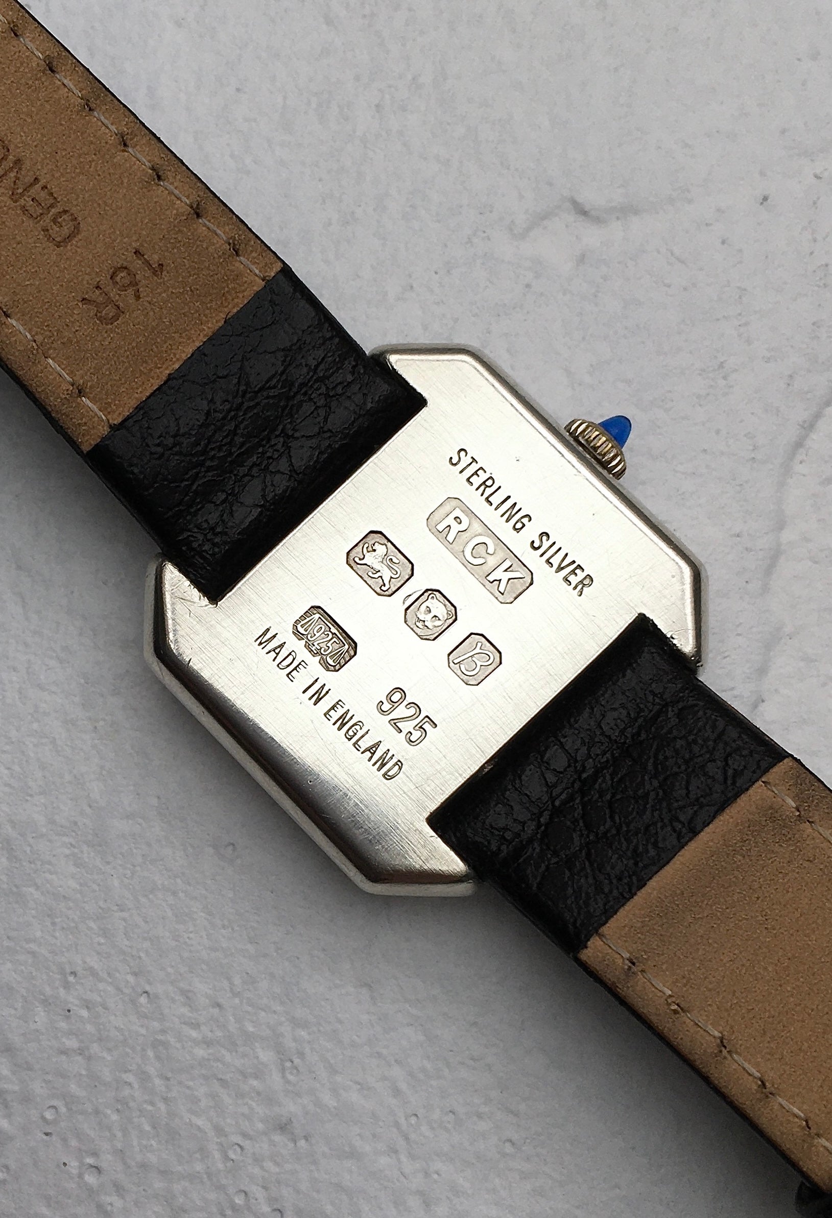 The Sterling Silver monocoque case, reminiscent of that of the Cartier Ceinture, features a stepped bezel, hooded lugs, bold statement hallmarks to the case-back and the original synthetic sapphire set winding crown