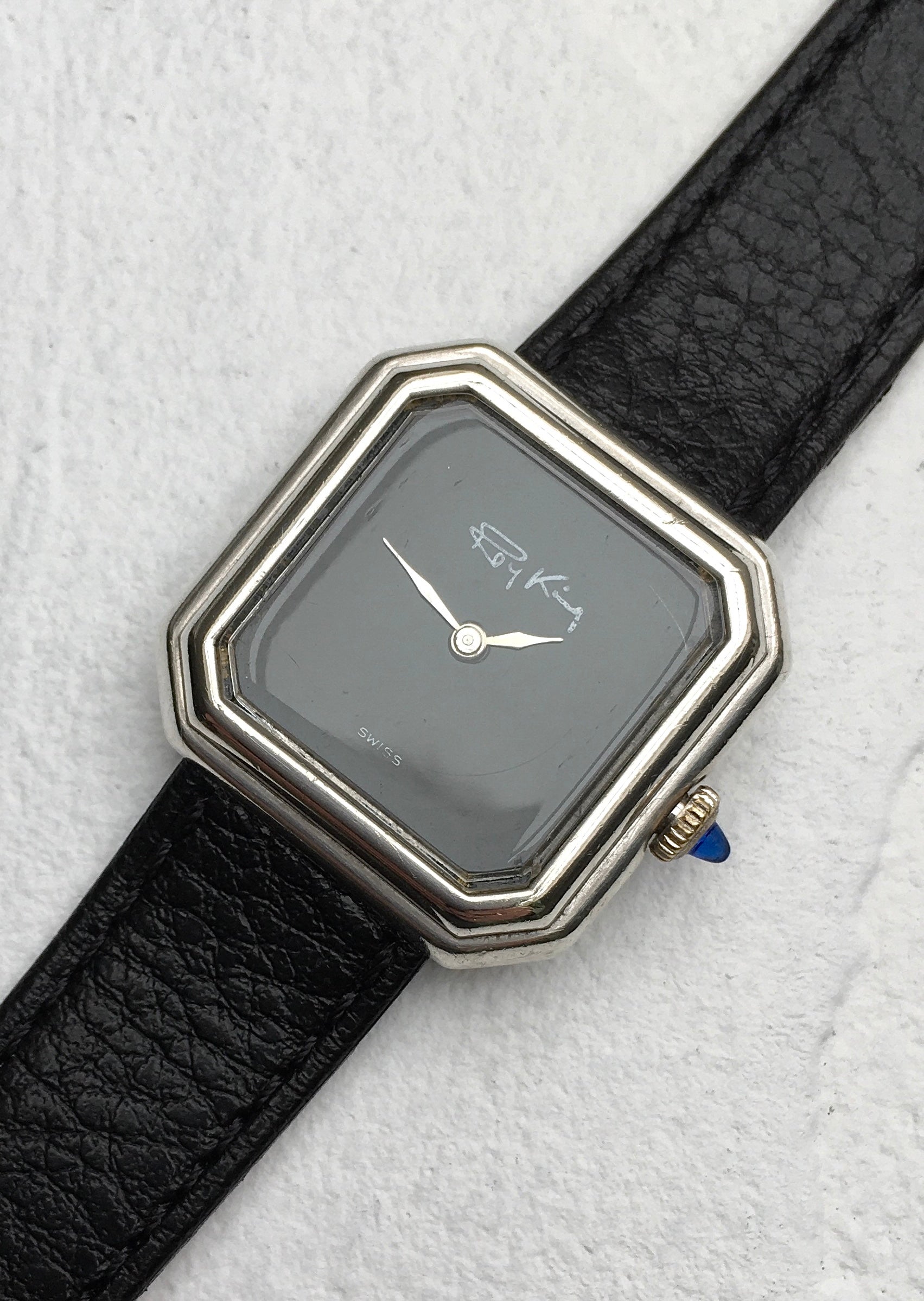 The clean minimalist black dial is decorated with silvered heavy diamond hands and King’s signature