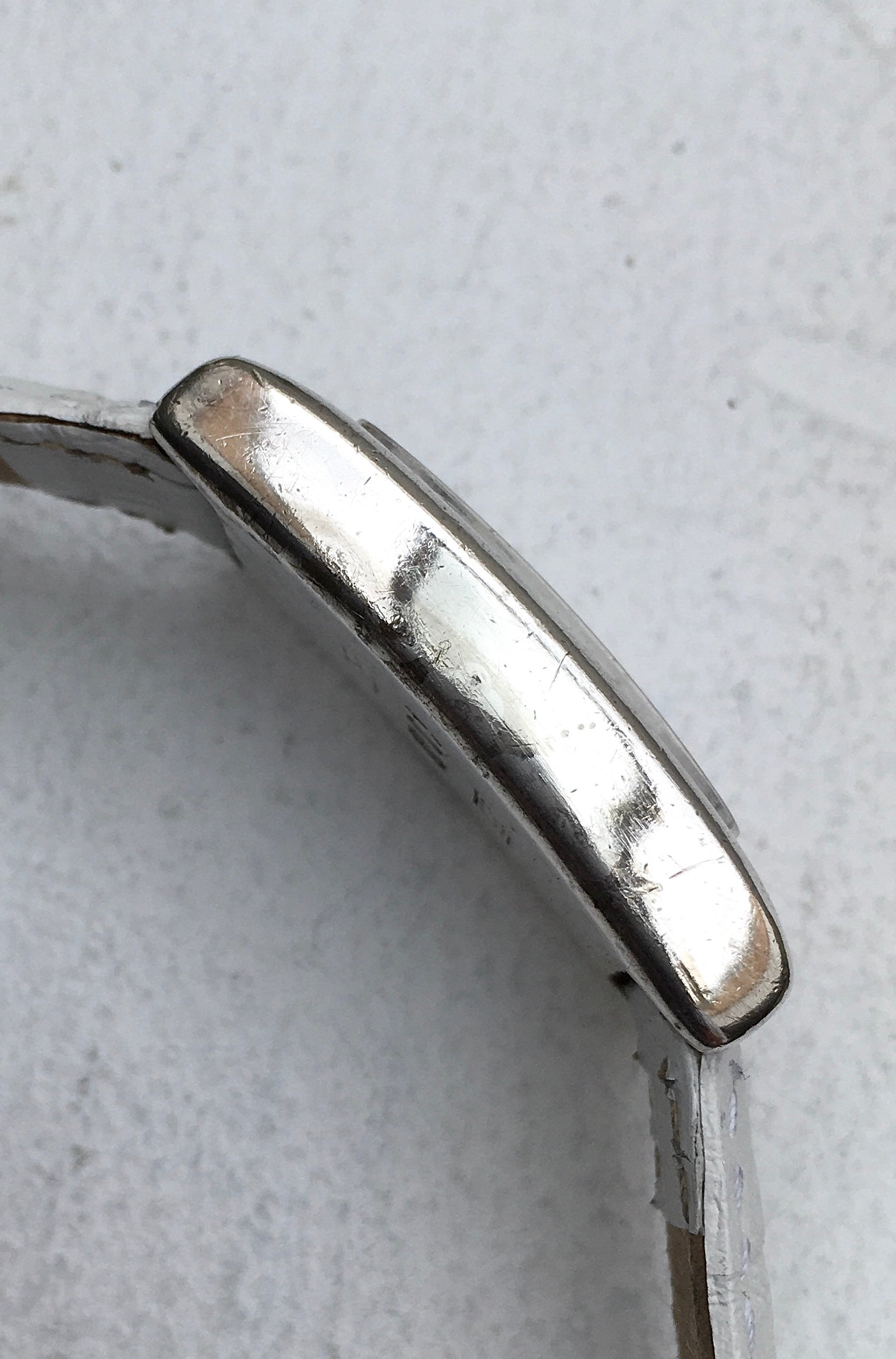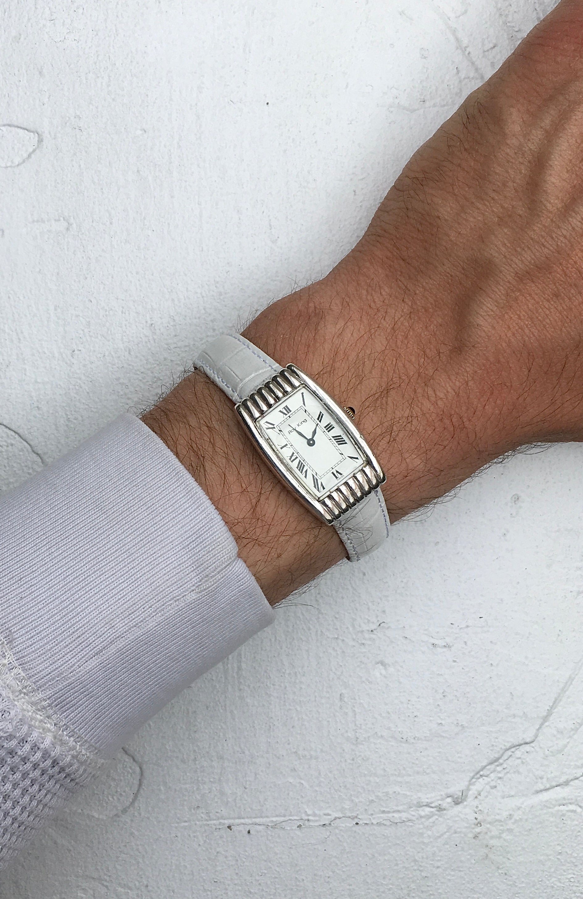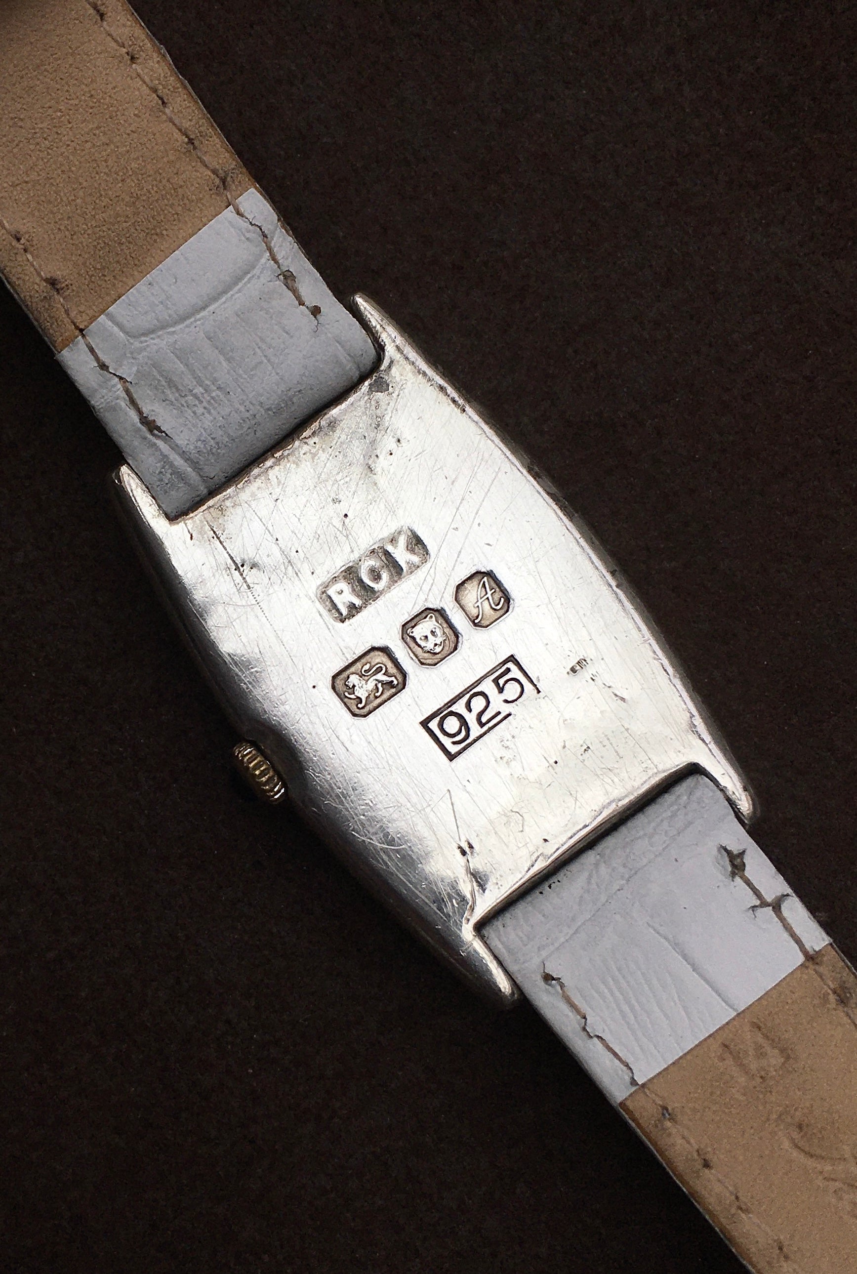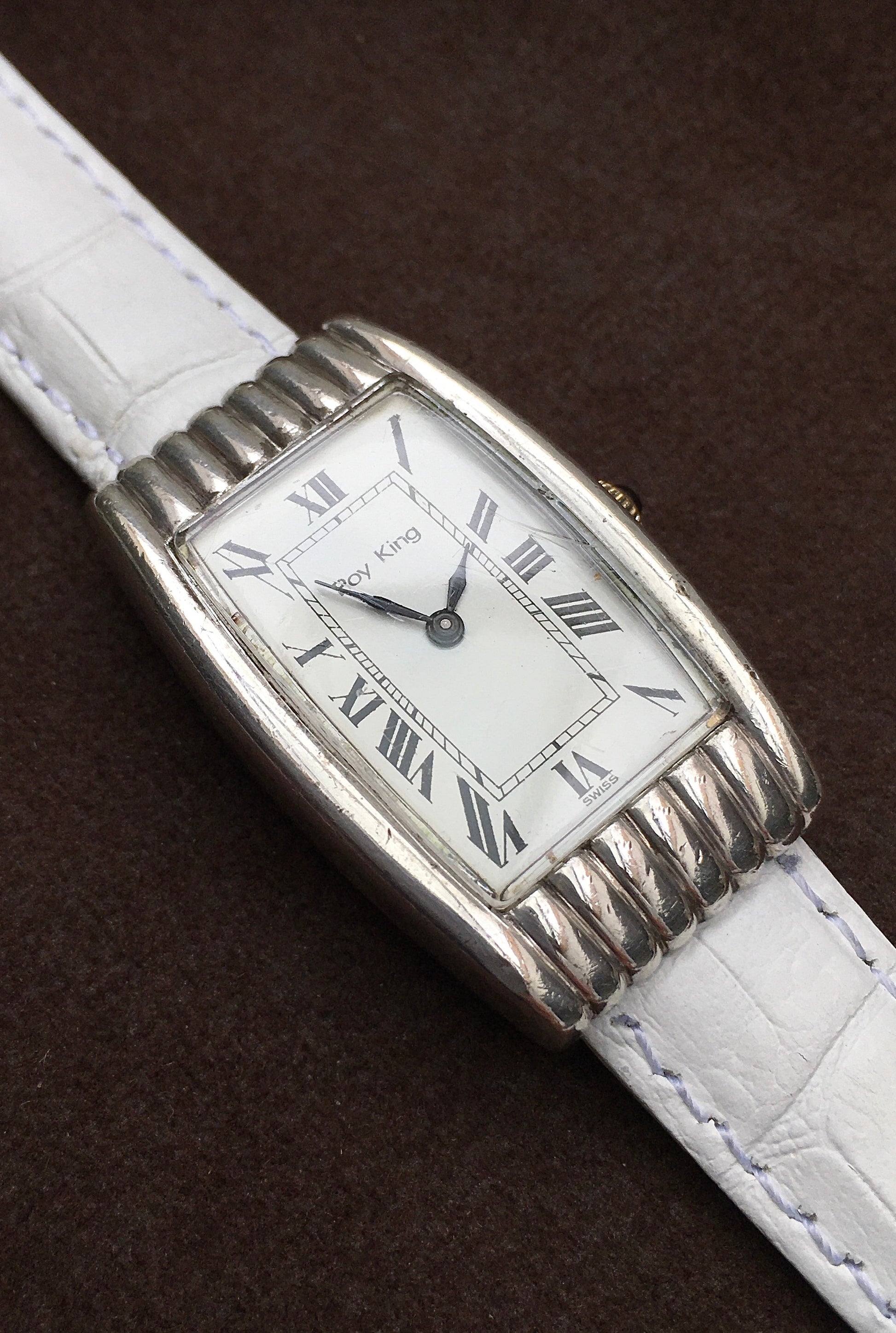 The Sterling Silver monocoque Tonneau case boasts a striking ridged finish as well as King’s iconic statement hallmarks to case back