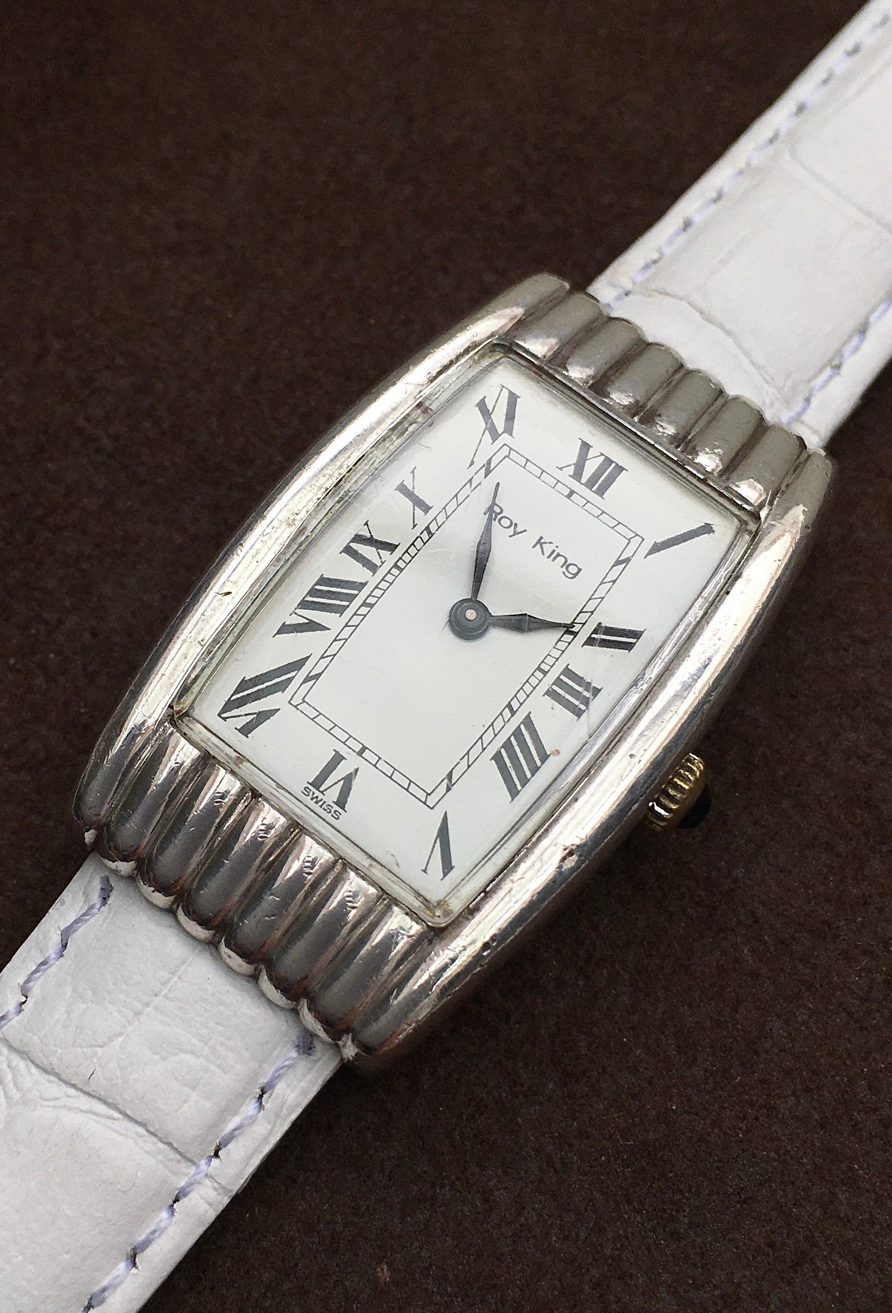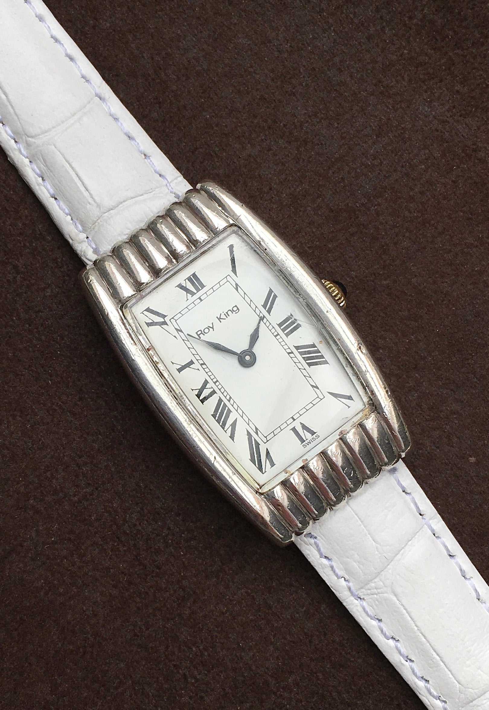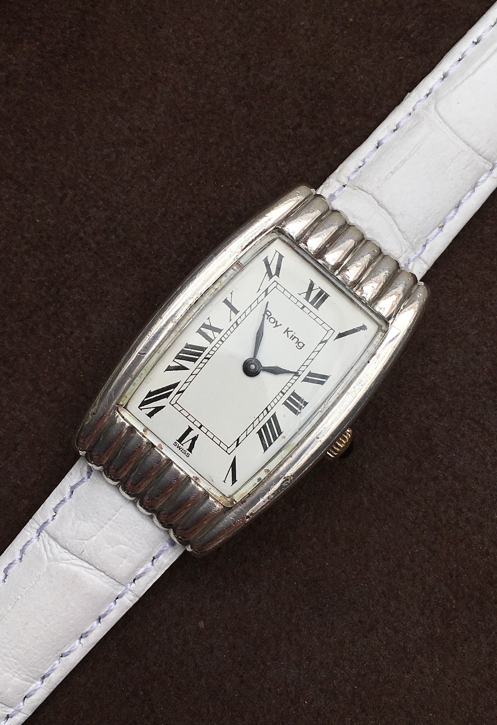 The white dial is decorated with black leaf hands, black Roman numerals, a subtle minute track and ‘Roy King’ beneath 12 o’clock