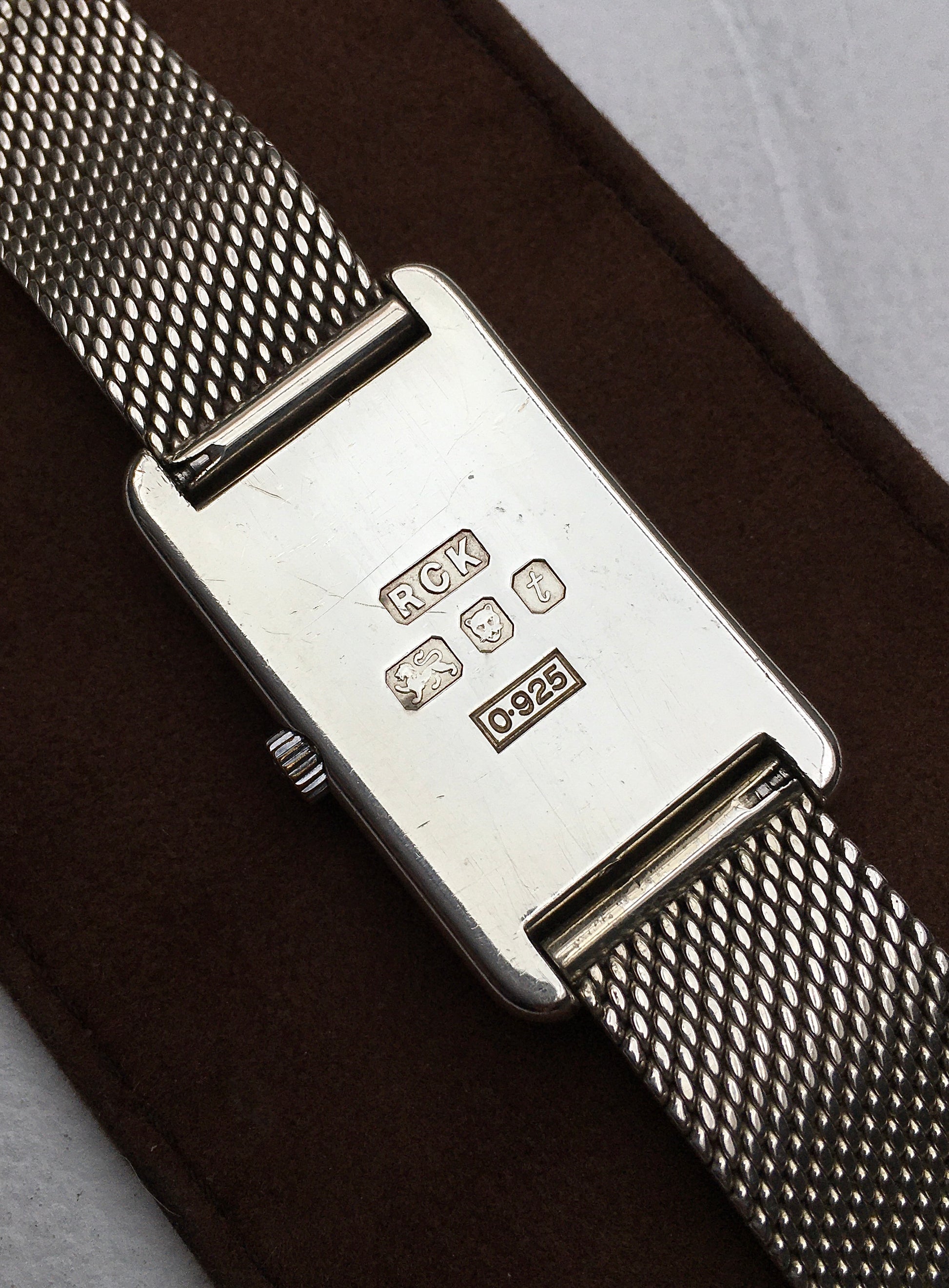 The rectangular monocoque case features a stepped bezel and is decorated on the reverse with King’s iconic statement assay and hallmarks (London 1974)