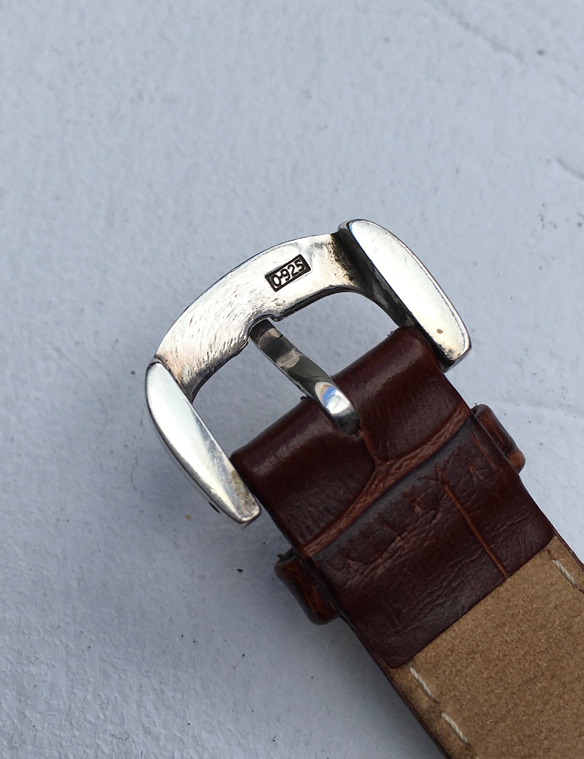 Fitted is a brown pressed leather strap fastened securely by the original Sterling silver Roy King buckle and pin