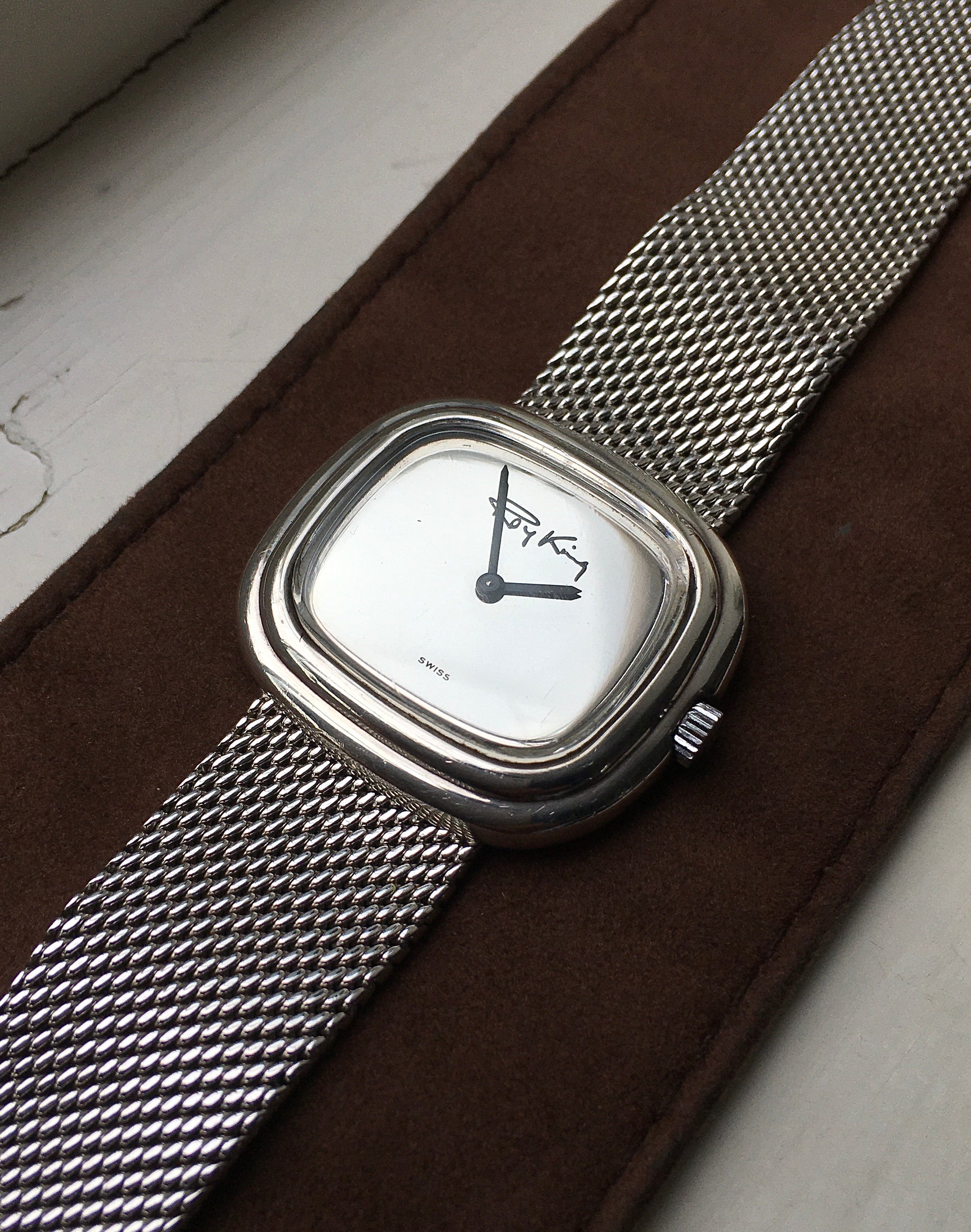 This 1973 piece sports an unusual mirrored dial decorated with black Baton hands and King’s signature
