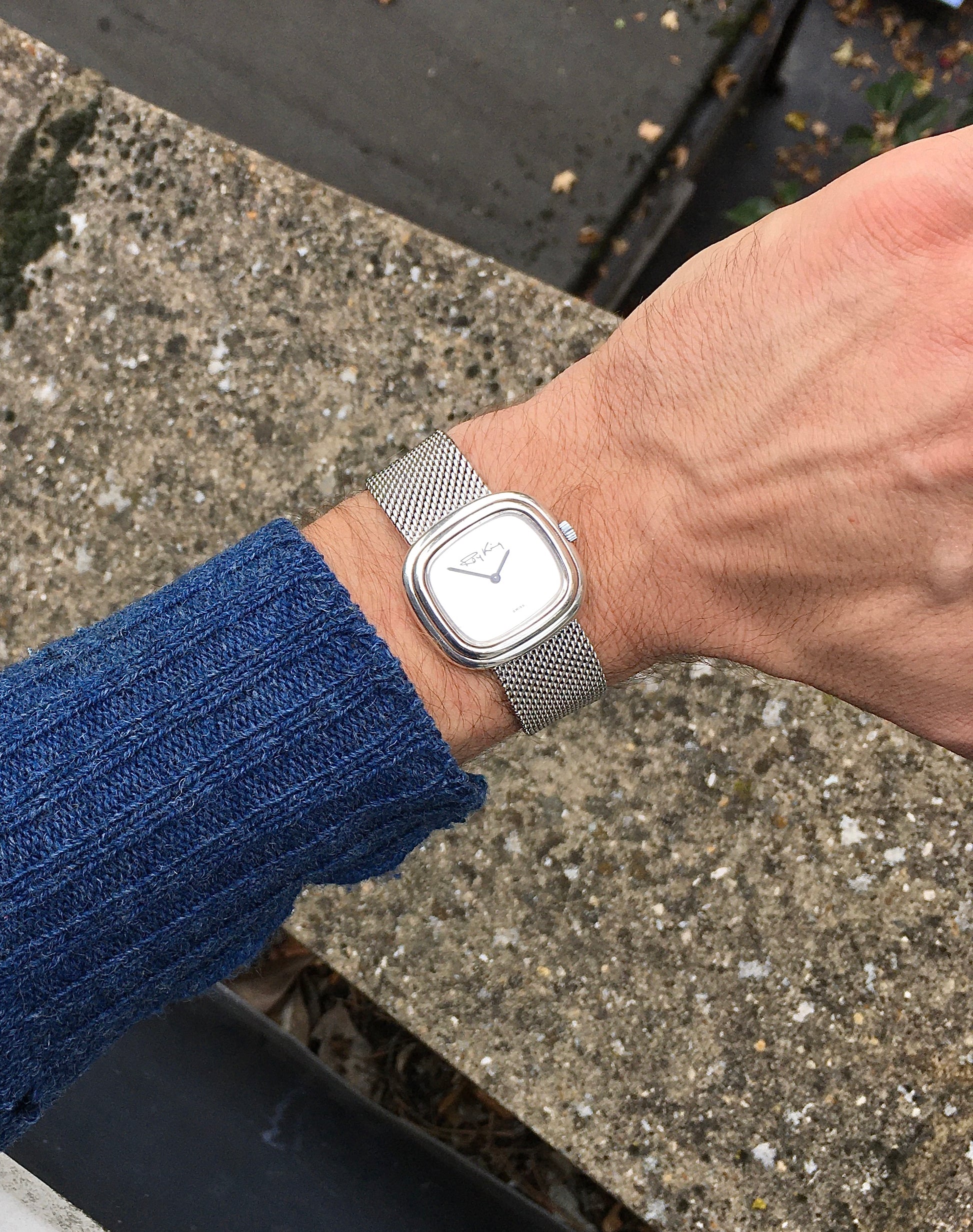 The stepped bezel is reminiscent of the iconic Cartier Gondole (Cartier being a brand for which King was once a unaccredited manufacturer)