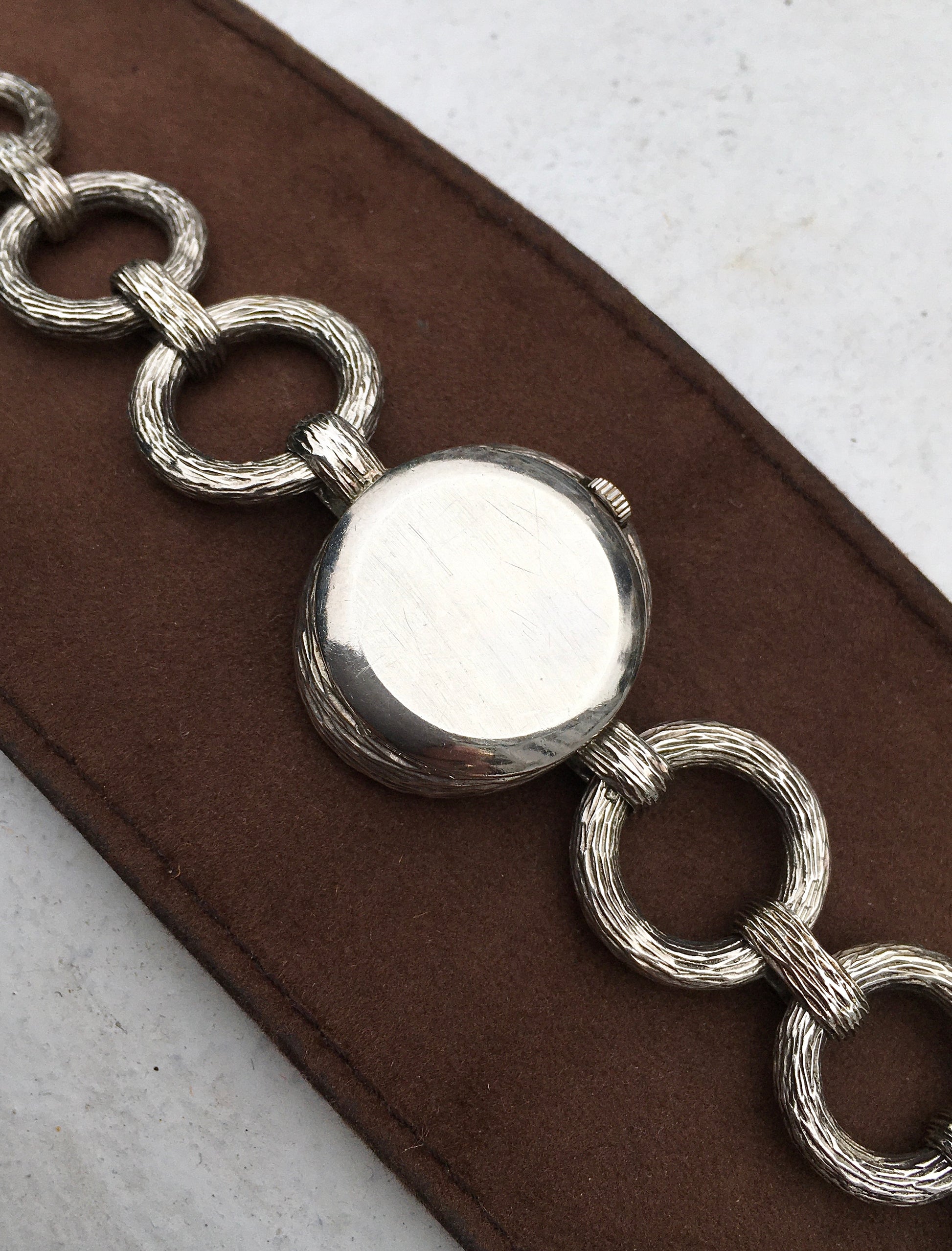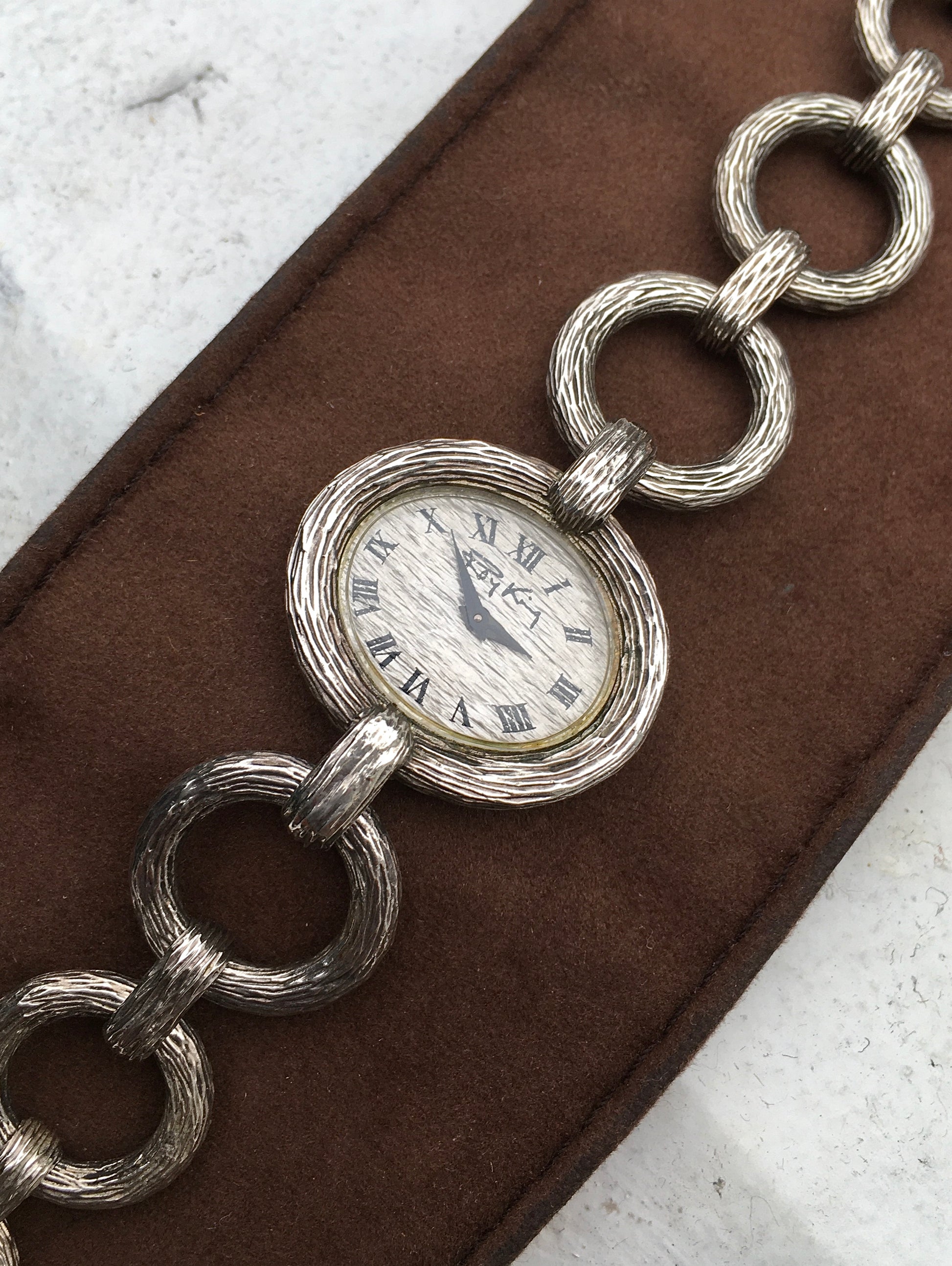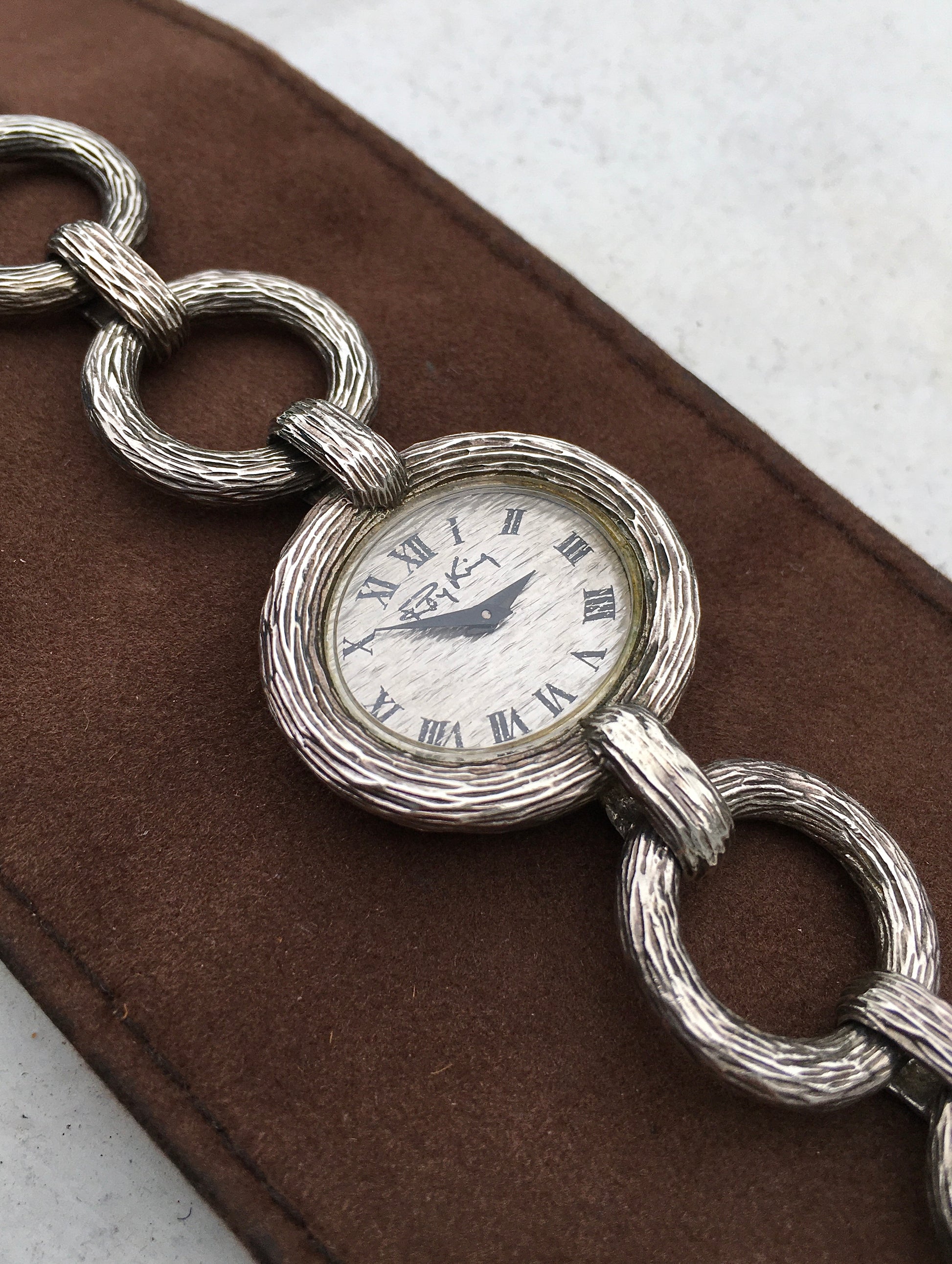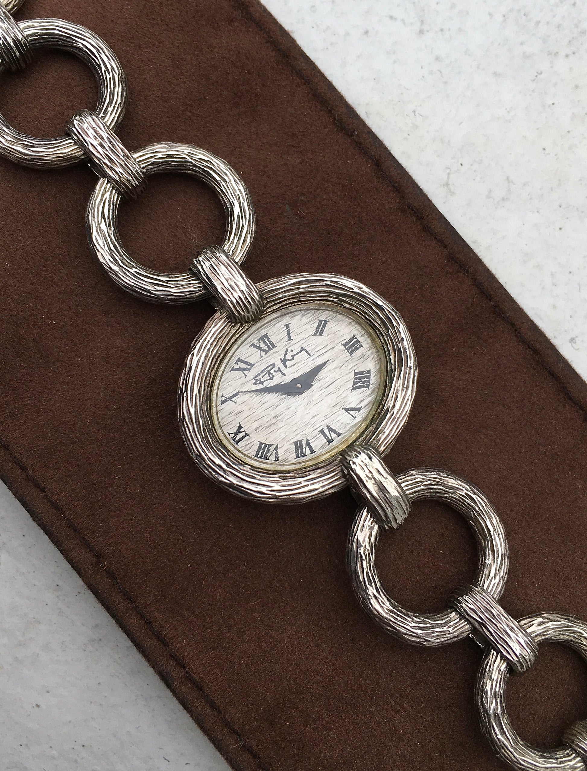 The integrated bracelet is formed of graduated solid silver circular links and is faster securely by a discrete folding clasp. England’s ‘walking lion’ hallmark as well as Assay marks for London 1972 can be found stamped on two of the links
