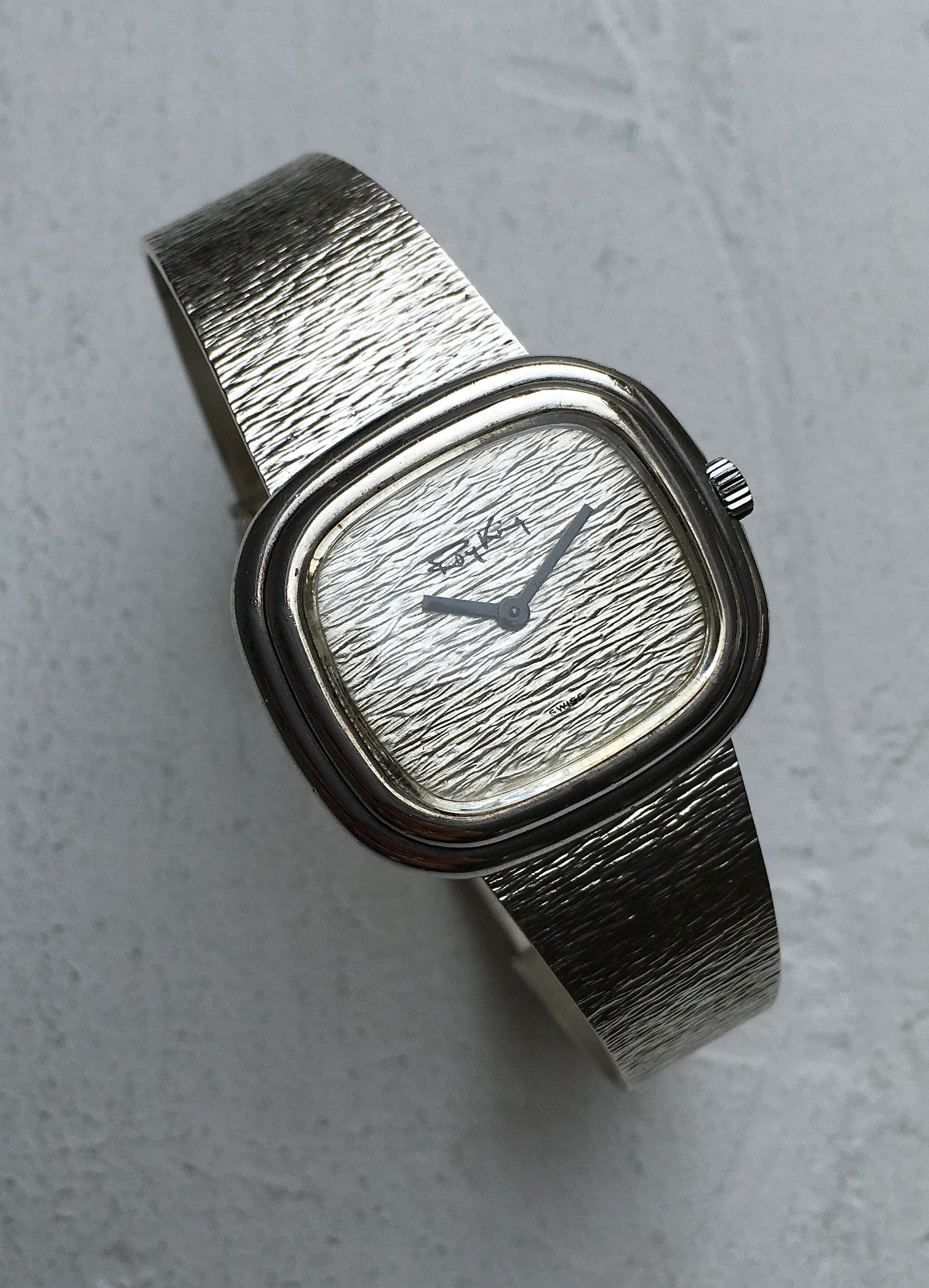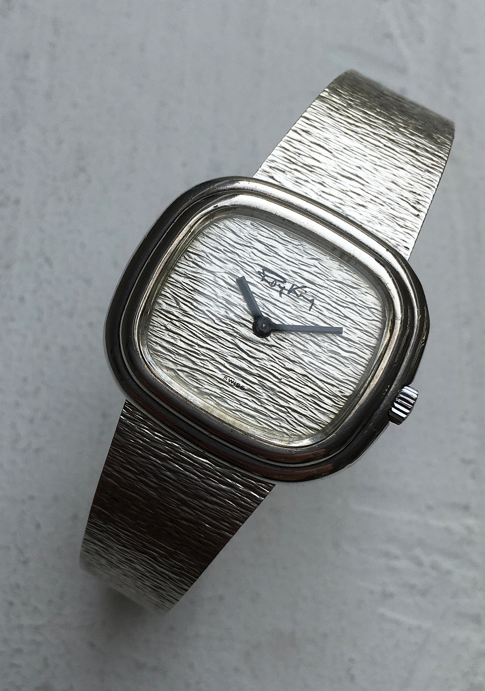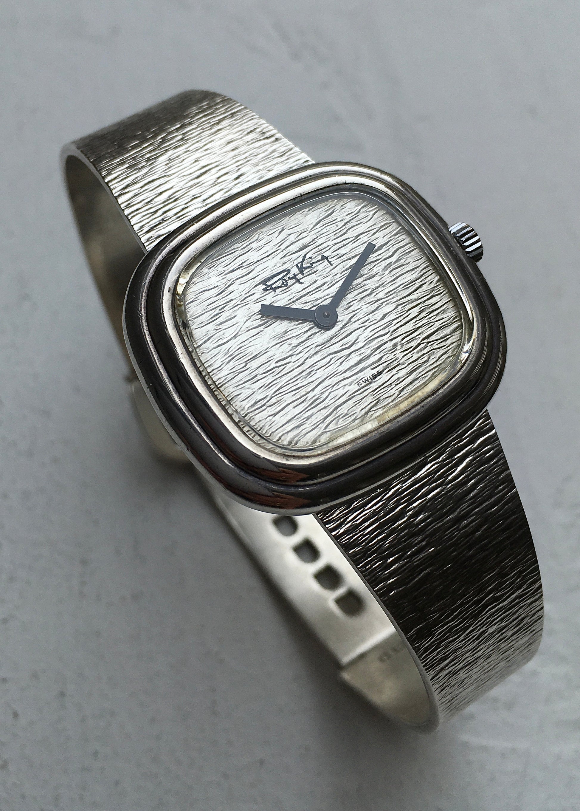 The bark effect bangle bracelet’s finish continues through to the dial, framed by a stylish stepped bezel accented by the original branded winding crown
