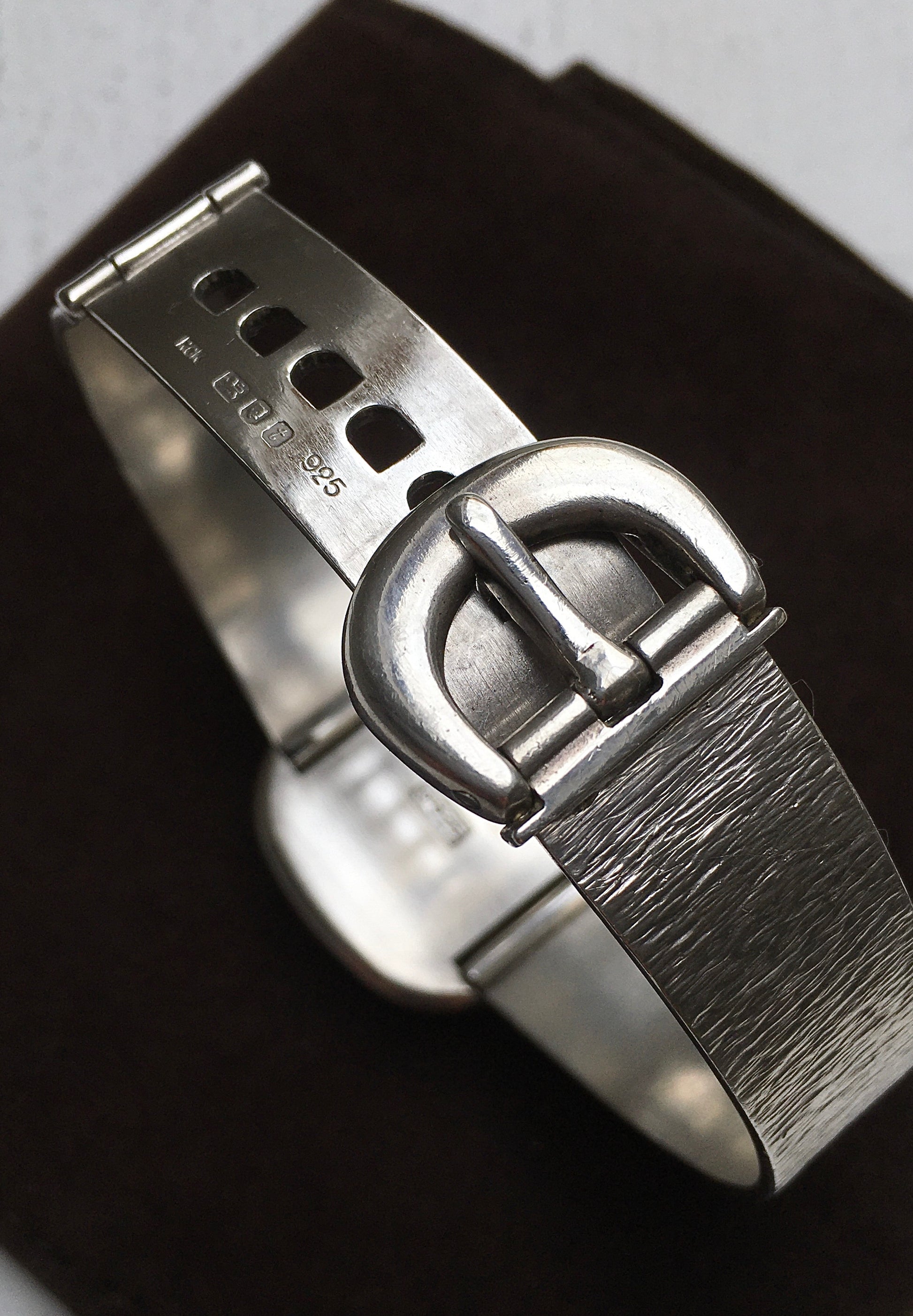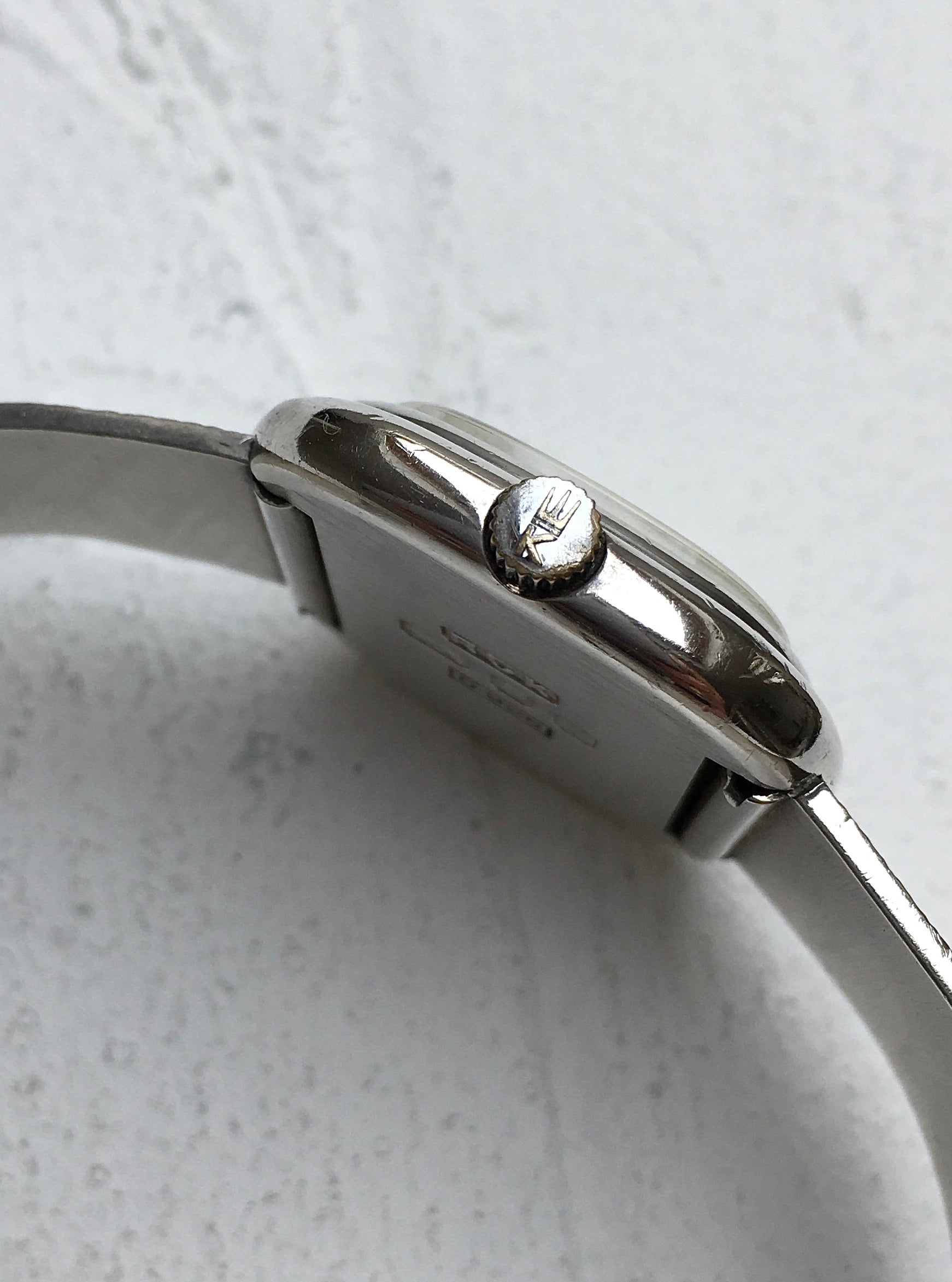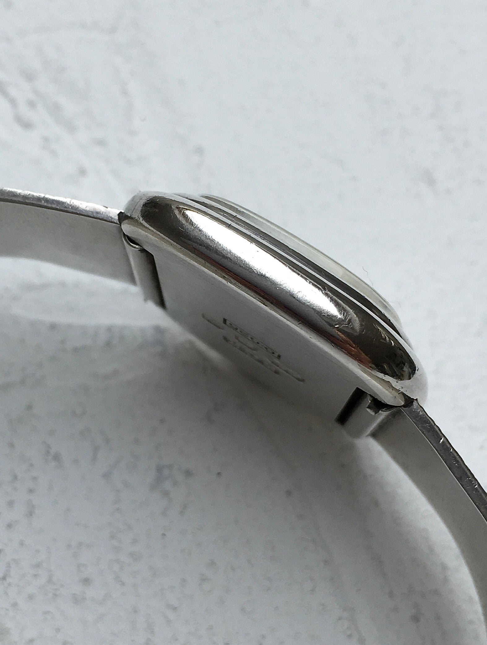The bark effect bangle bracelet’s finish continues through to the dial, framed by a stylish stepped bezel accented by the original branded winding crown