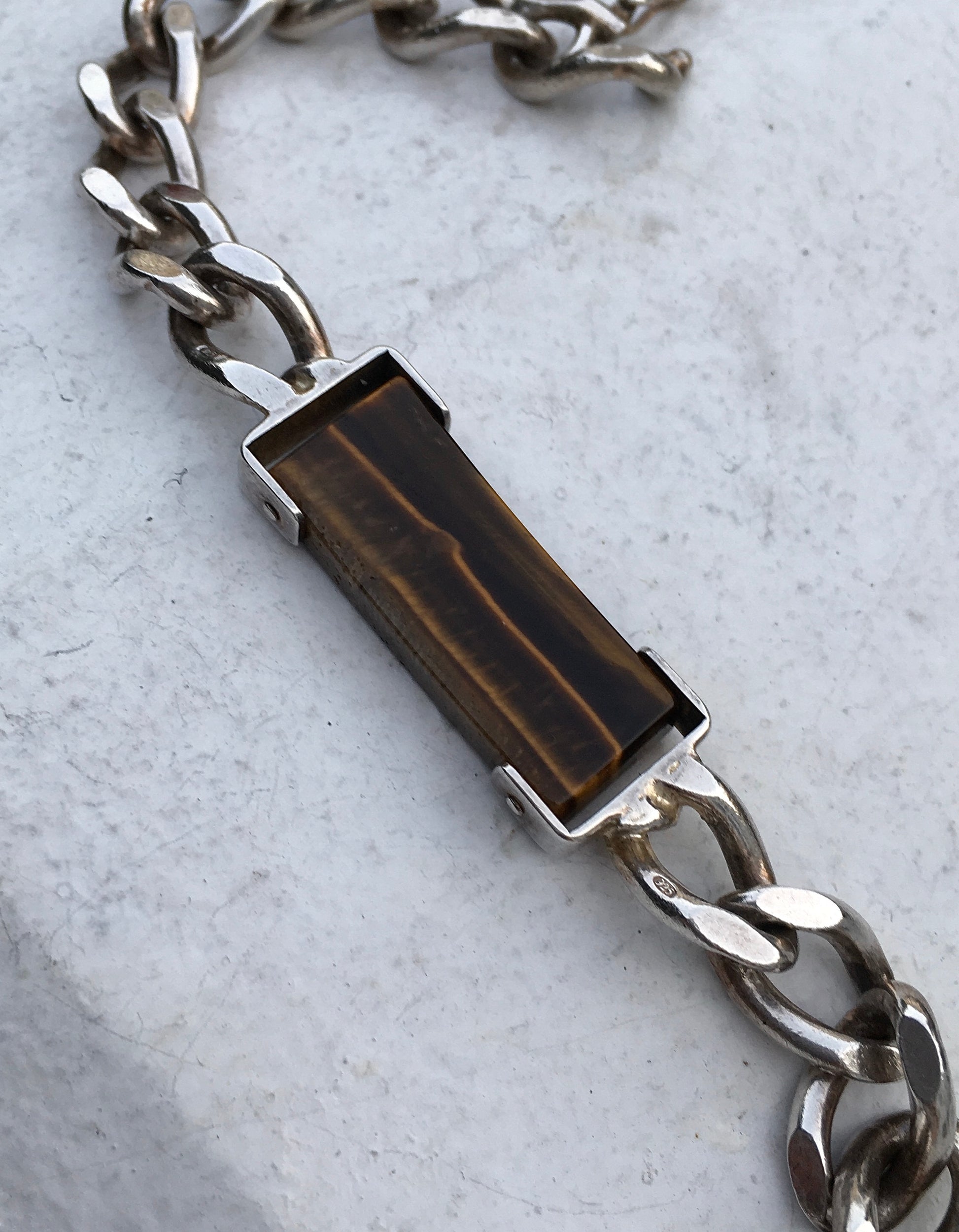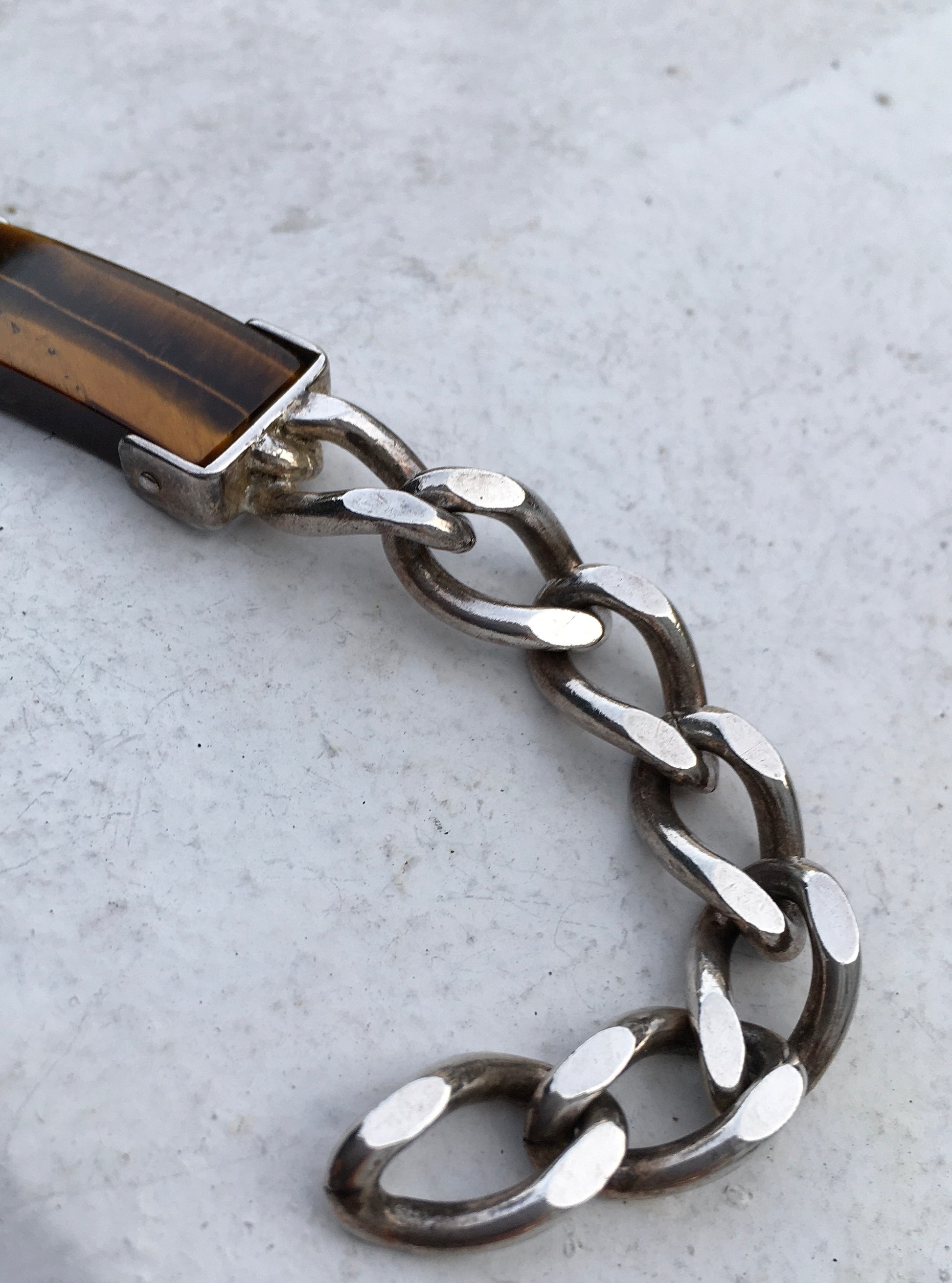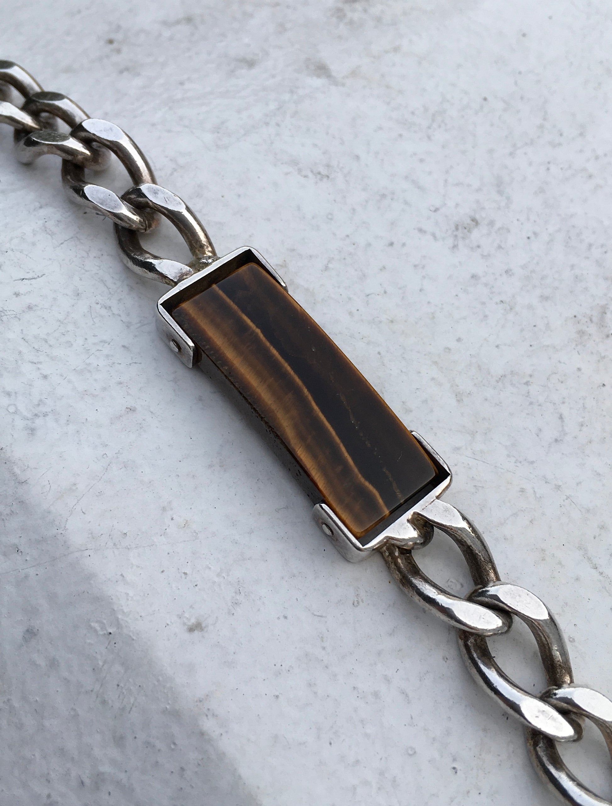 Vintage 1970s sterling silver curb link bracelet with a eye catching Tiger’s Eye where the would usually be an ID plaque