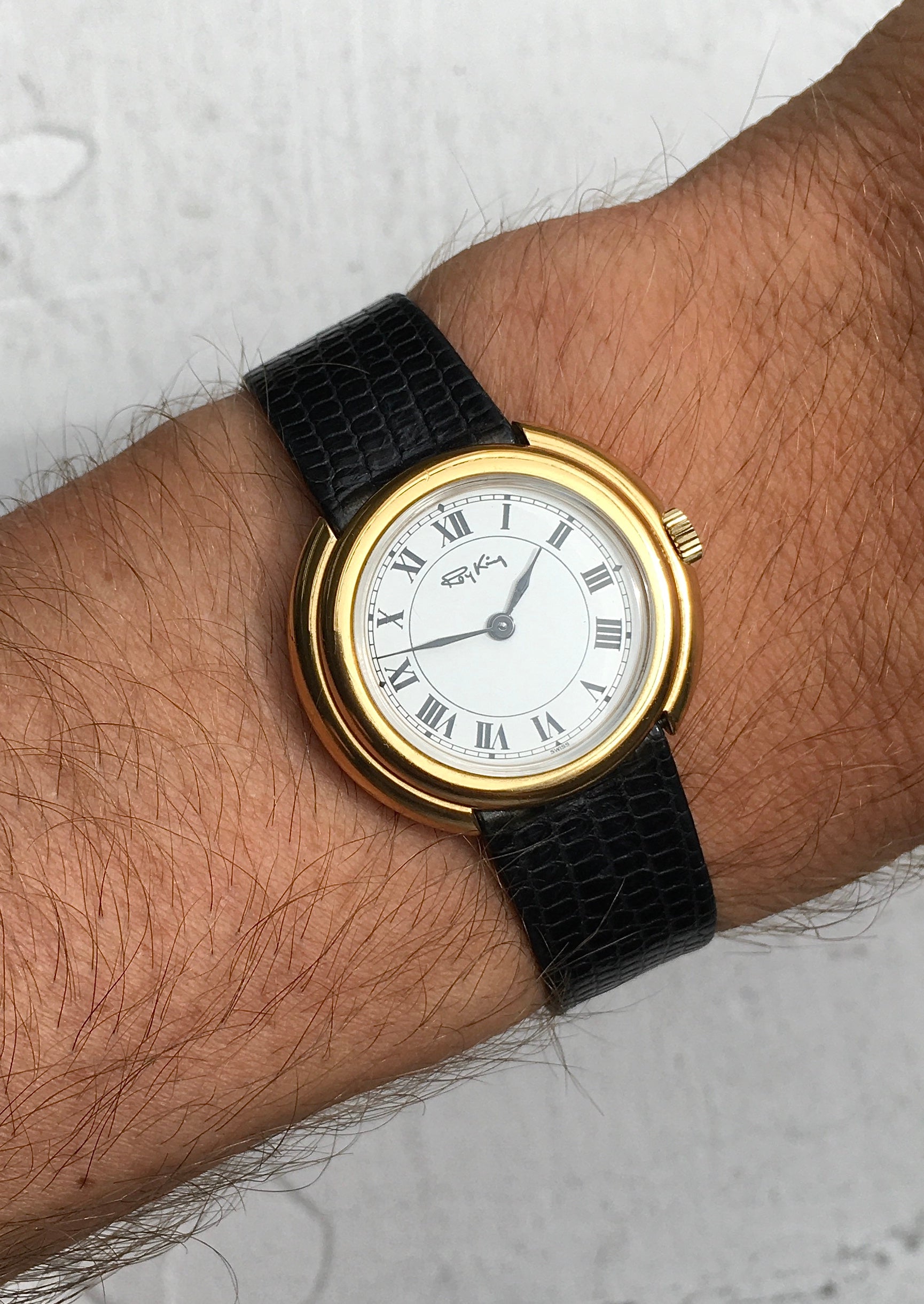 The bold hallmarks to the case-back tell us the watch is Sterling Silver and was assayed in London in 1973. Powered by a Swiss-made, manual wind Bueche-Girod movement, the piece runs smoothly and keeps excellent time