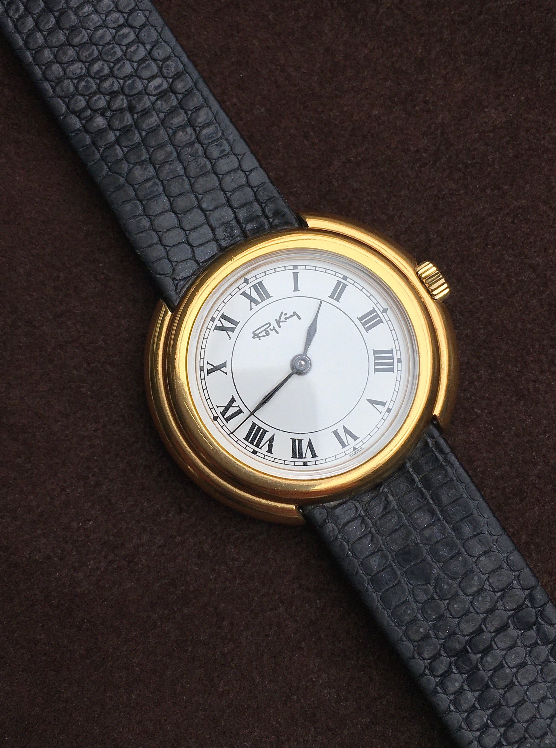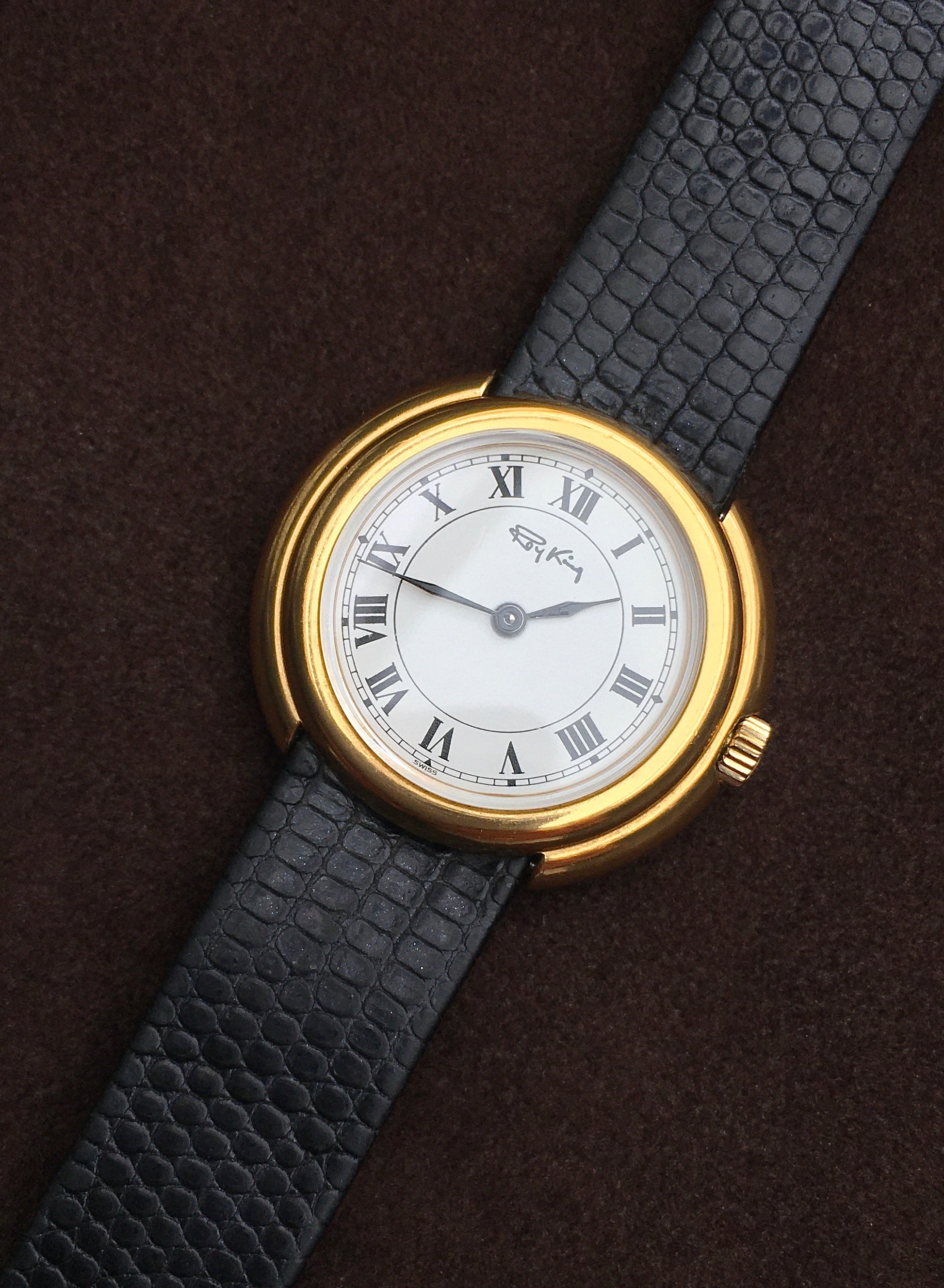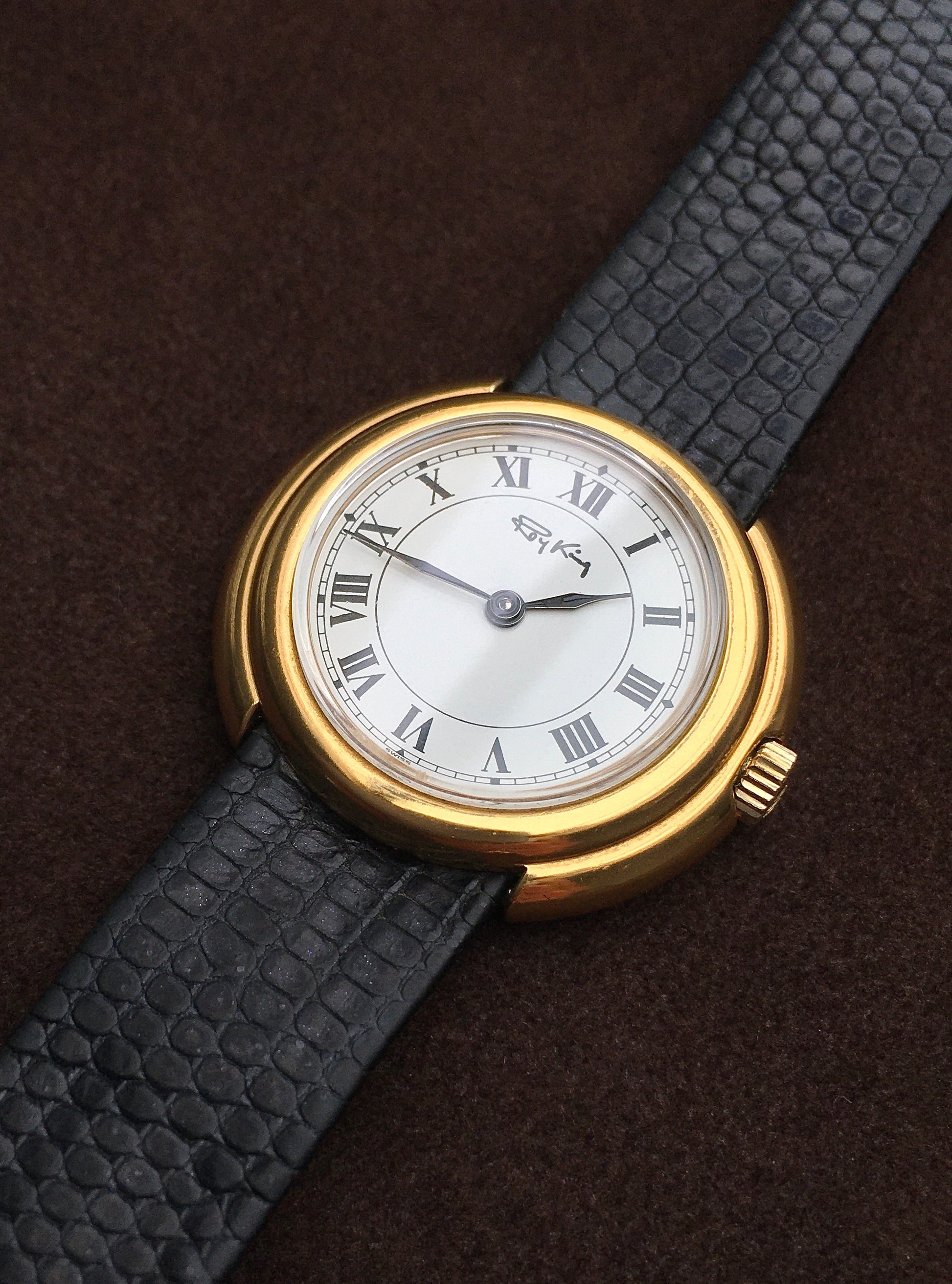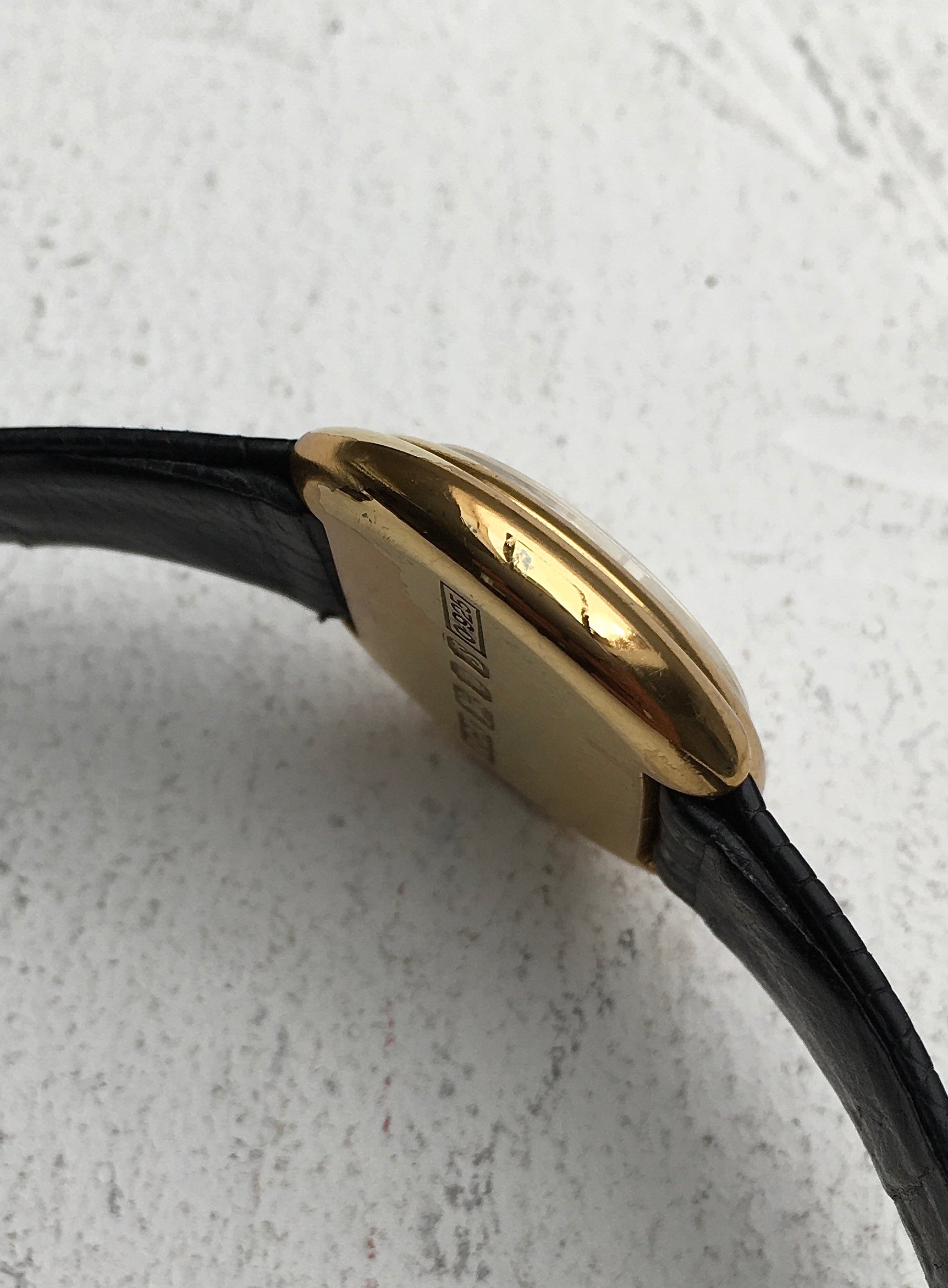 This stunning Vermeil piece is reminiscent of the iconic Cartier Vendome, sharing such characteristics as the stepped bezel and crisp white dial adorned with black Roman numerals, Leaf hands and a chemin de fer minute track