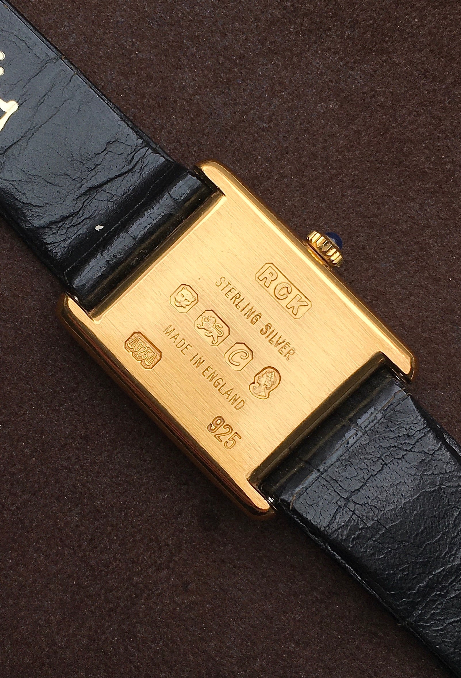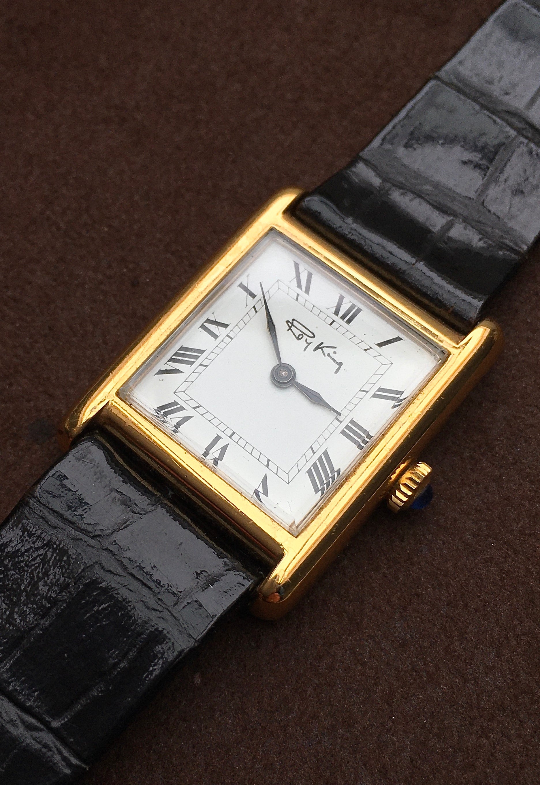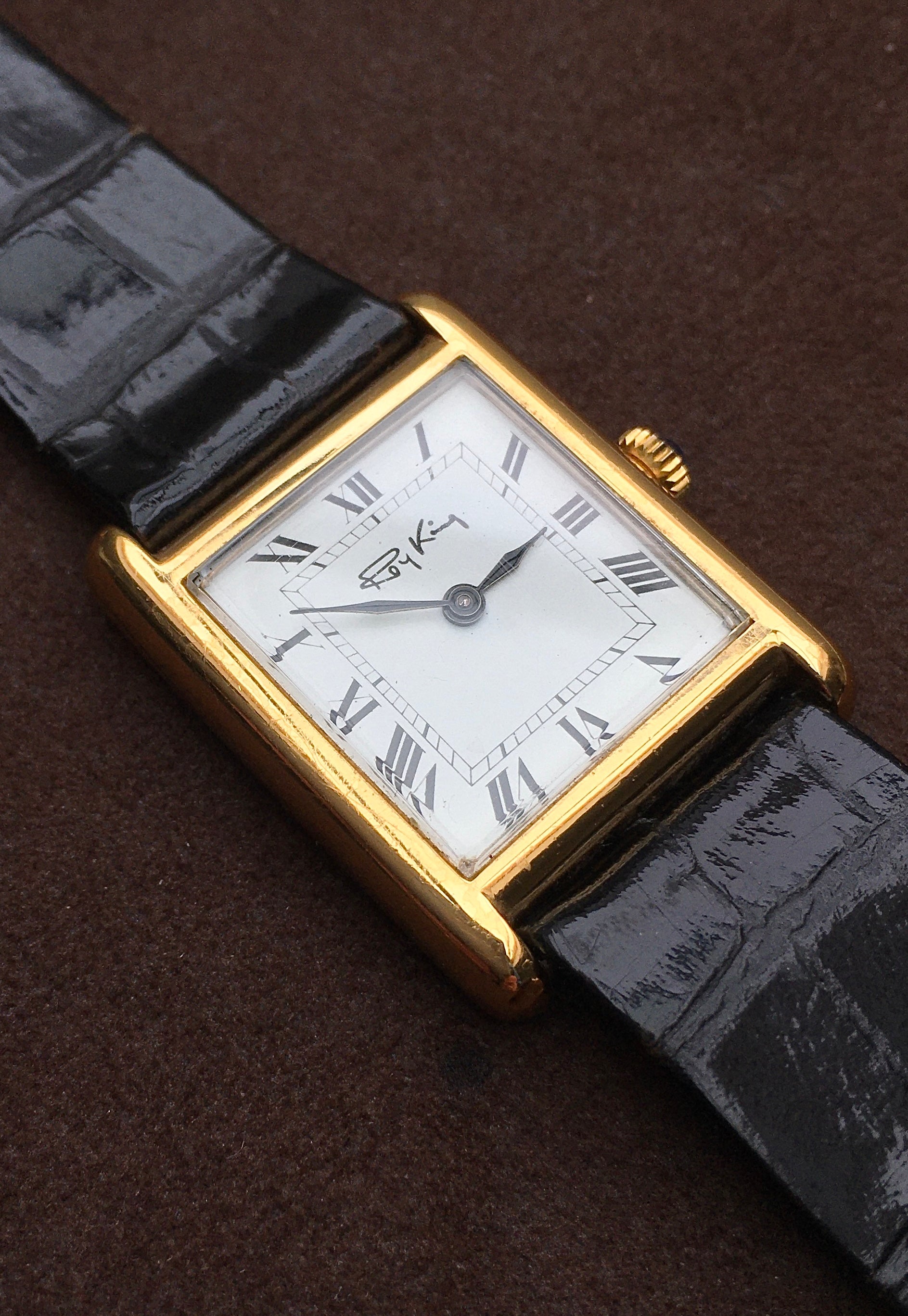 The rectangular 18k gold plated Sterling Silver case is reminiscent of the Cartier Tank (Cartier being a company for which King was an unaccredited manufacturer) and remains in truly excellent condition