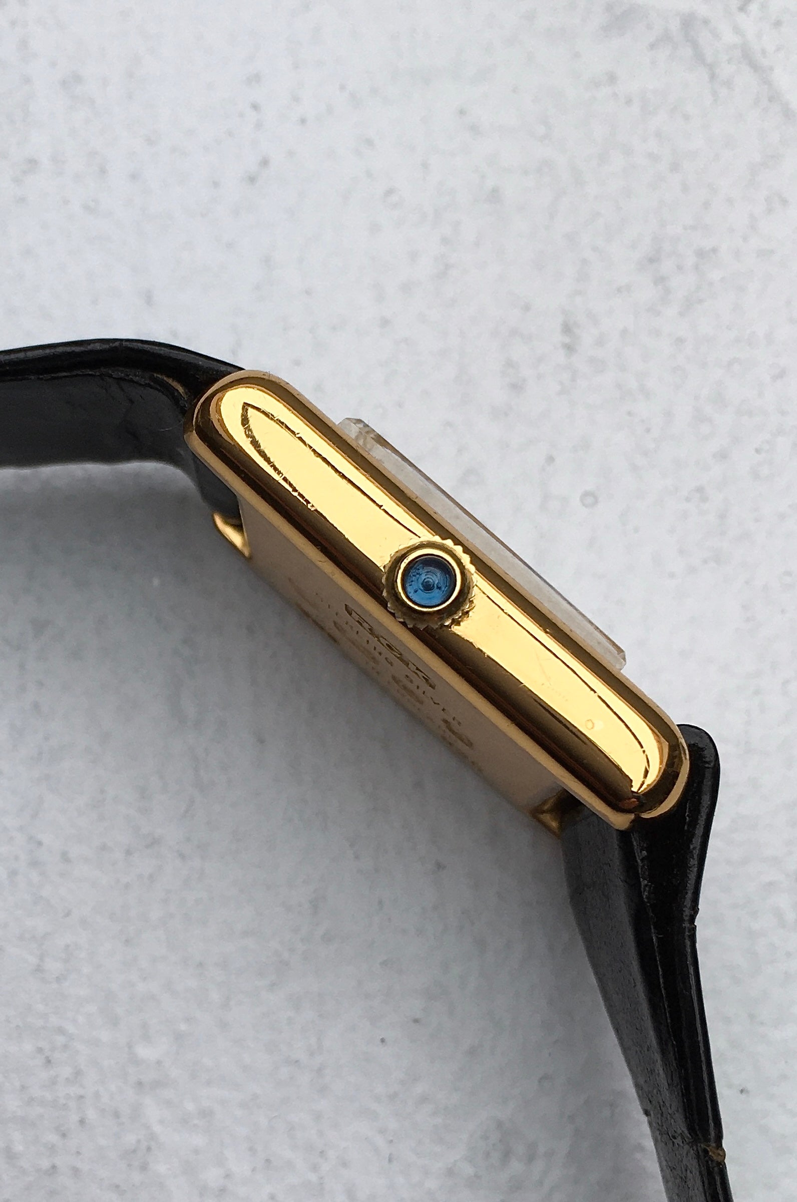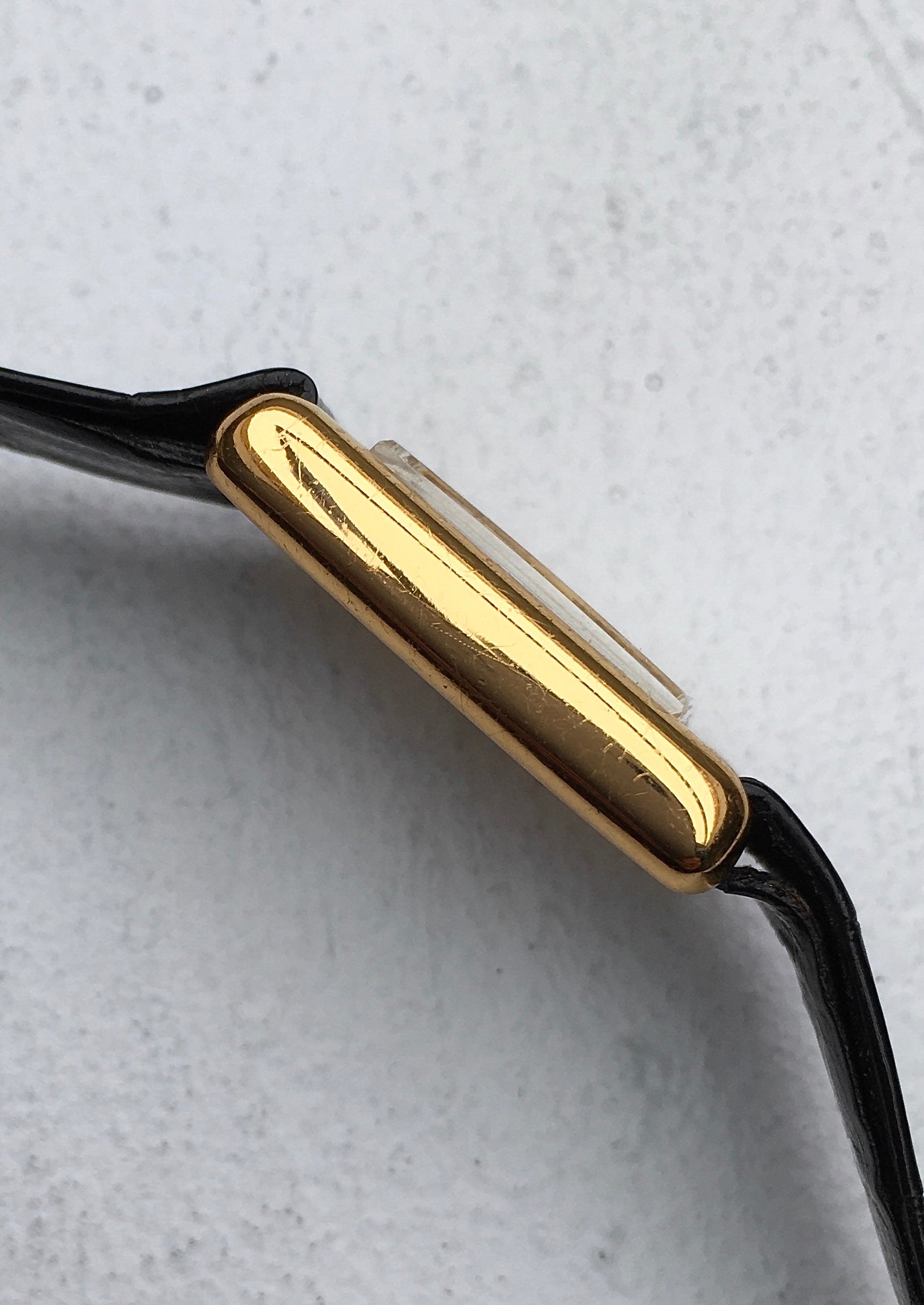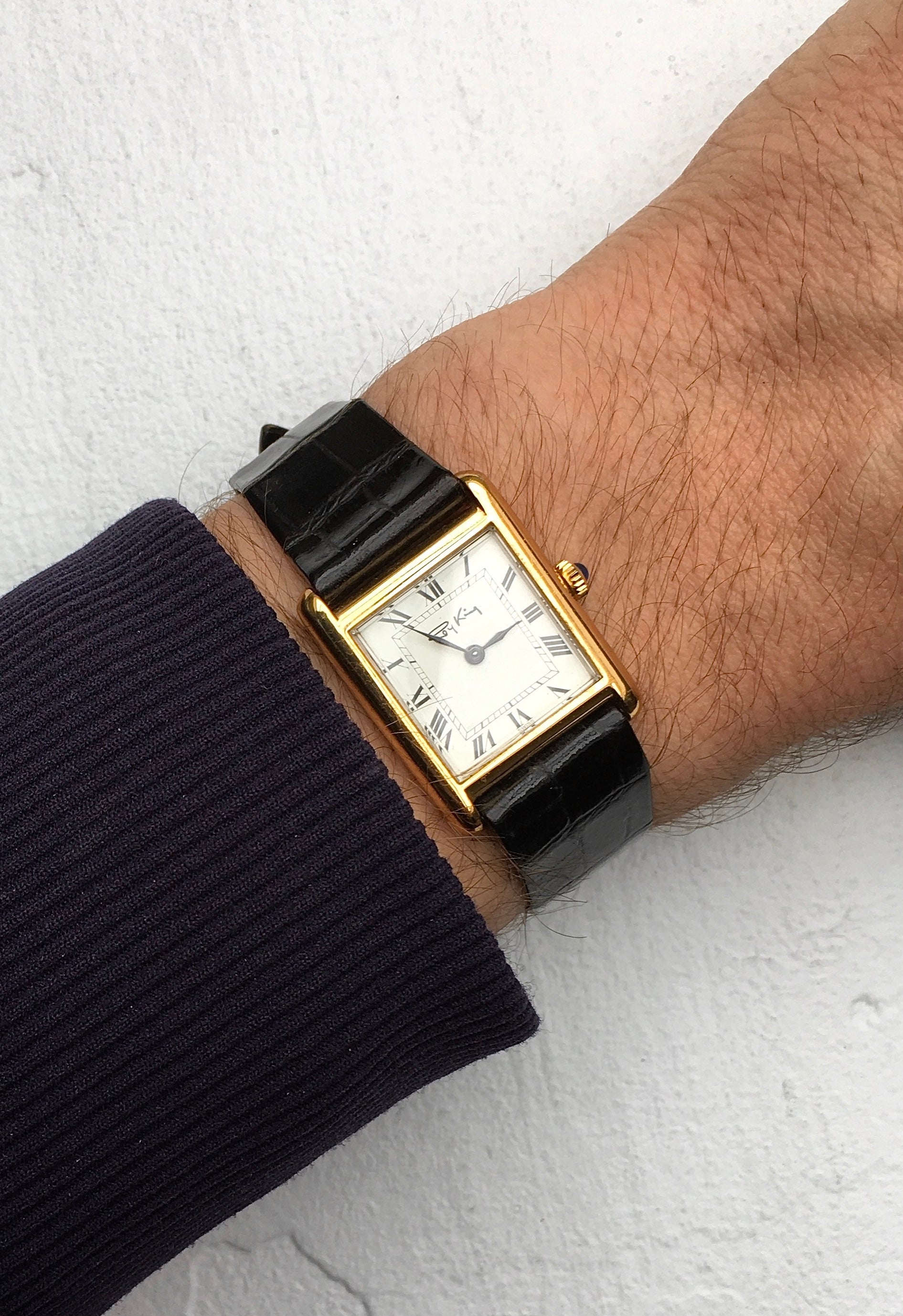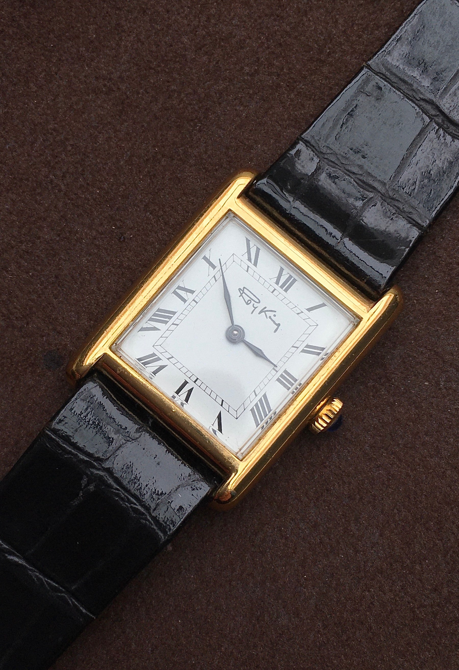 The rectangular 18k gold plated Sterling Silver case is reminiscent of the Cartier Tank (Cartier being a company for which King was an unaccredited manufacturer) and remains in truly excellent condition