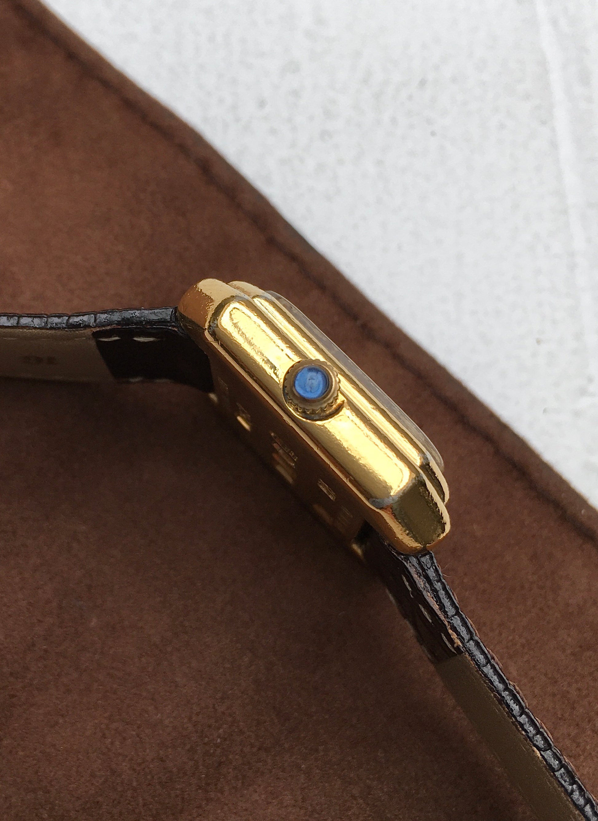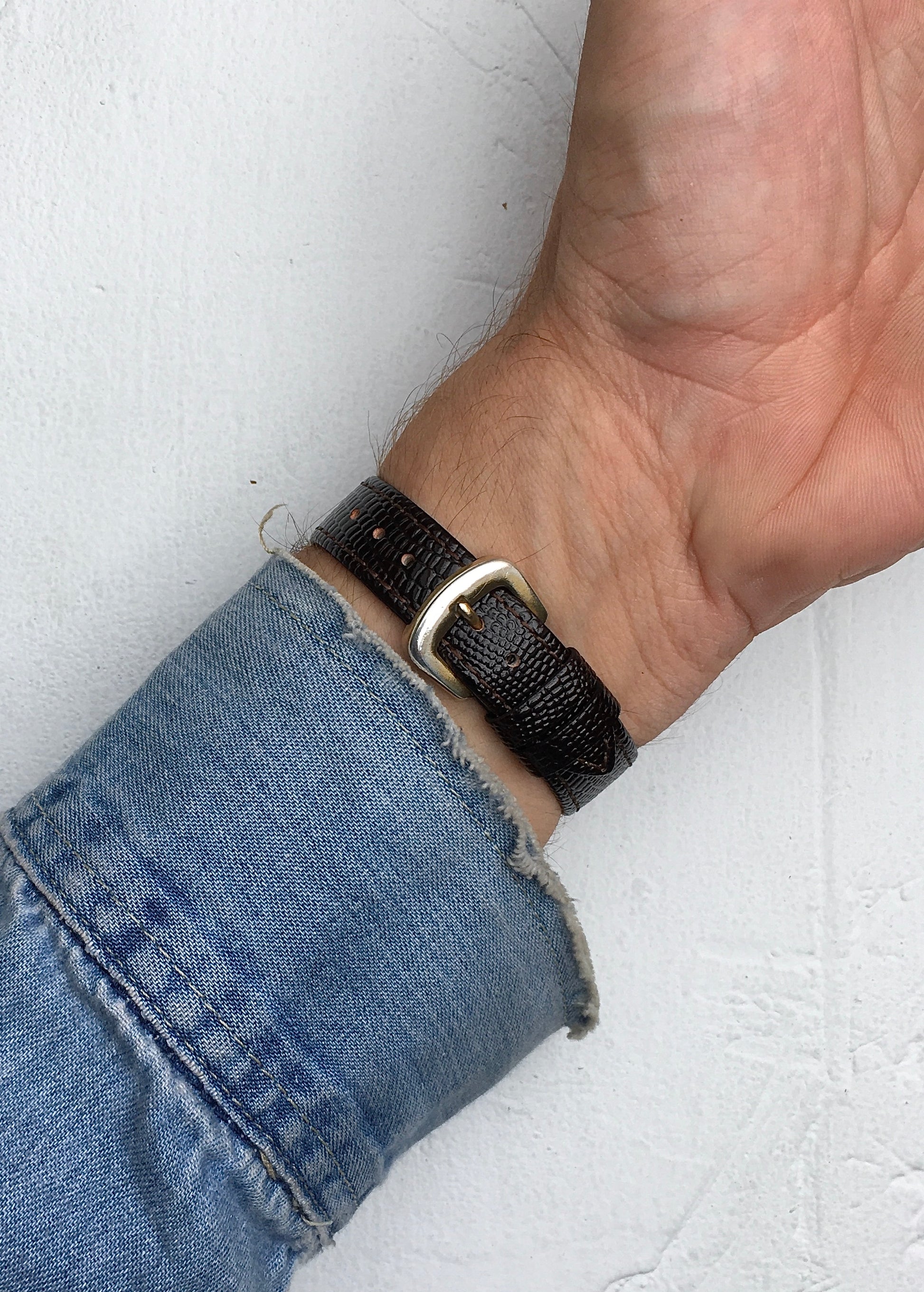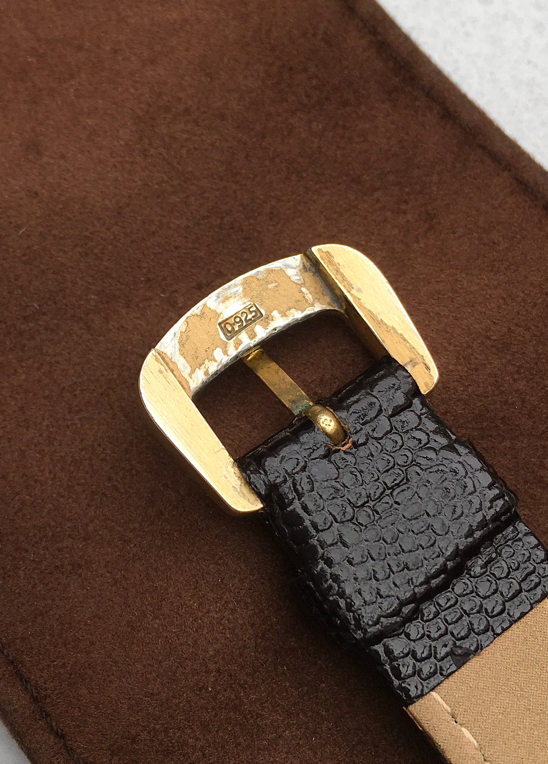 The original Sterling Silver vermeil buckle is present (worn plating) and set on a new brown pressed leather strap