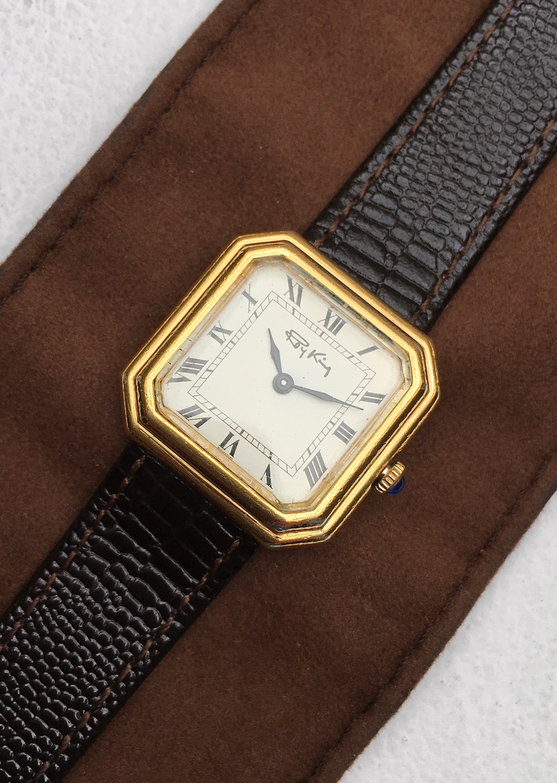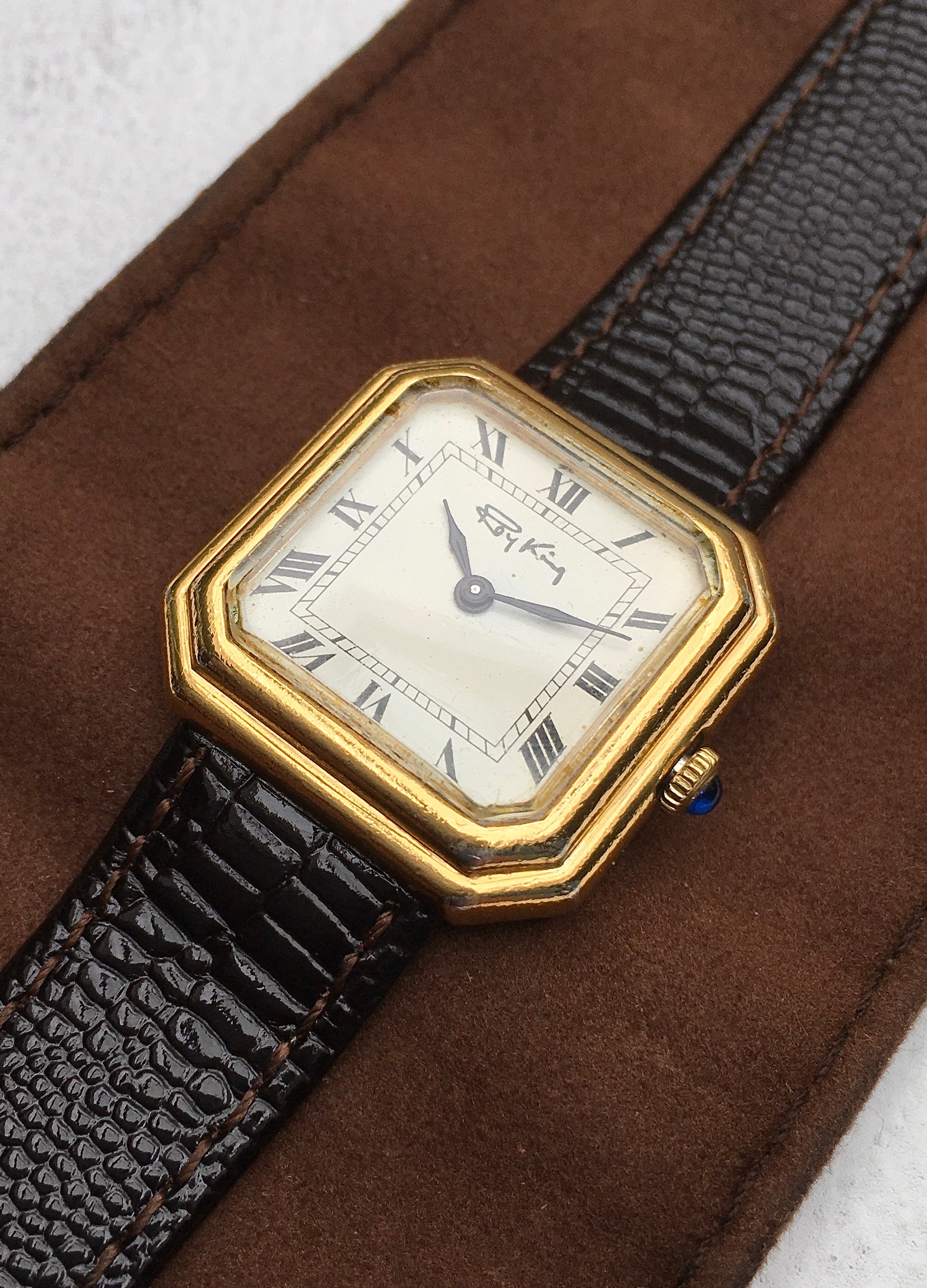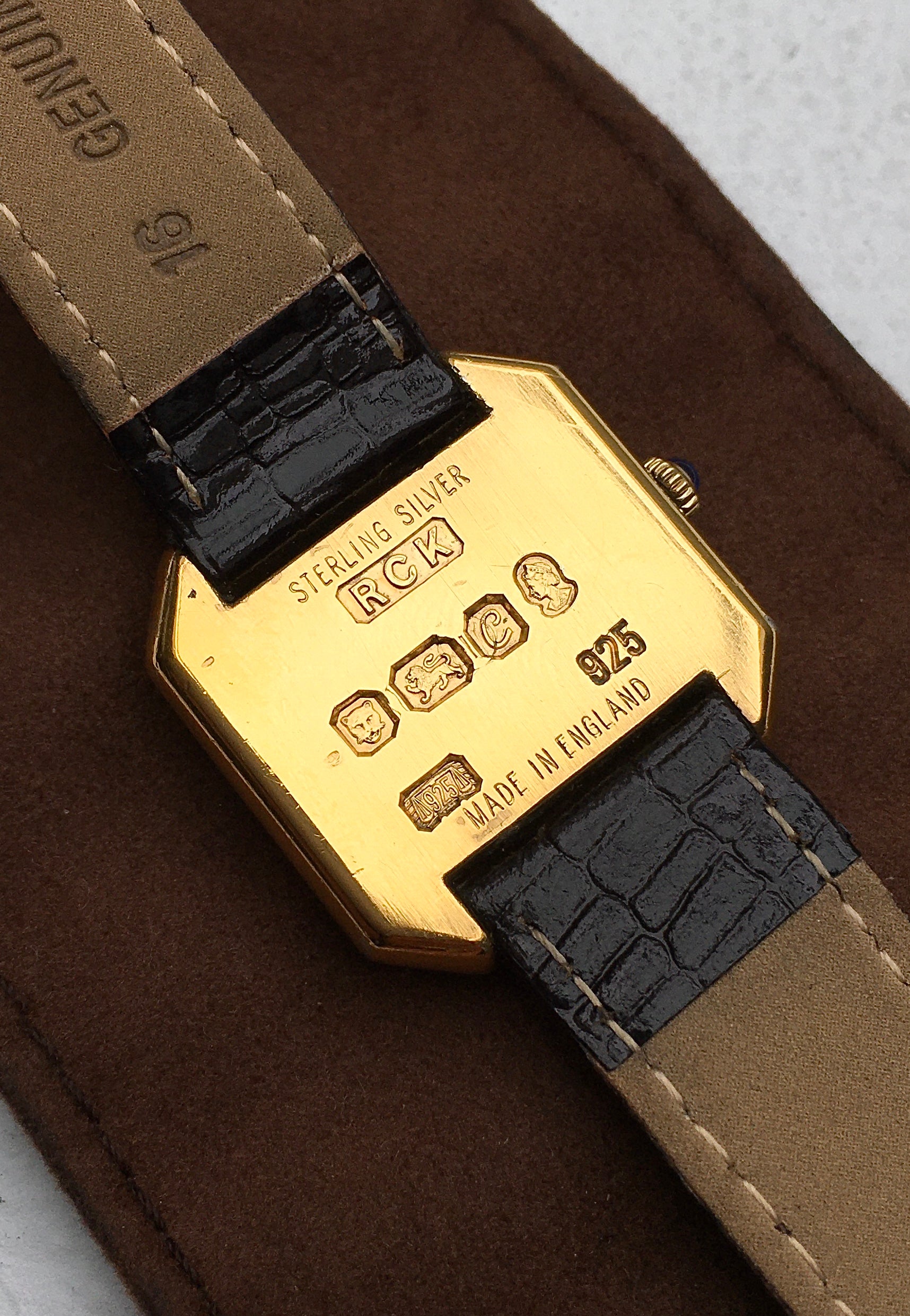 The Sterling Silver vermeil monocoque case, reminiscent of that of the Cartier Ceinture (Cartier being a brand for which King was once an unaccredited manufacturer), features a stepped bezel and bold statement hallmarks to the case back. Presented in good condition with slight wear to the plating in points