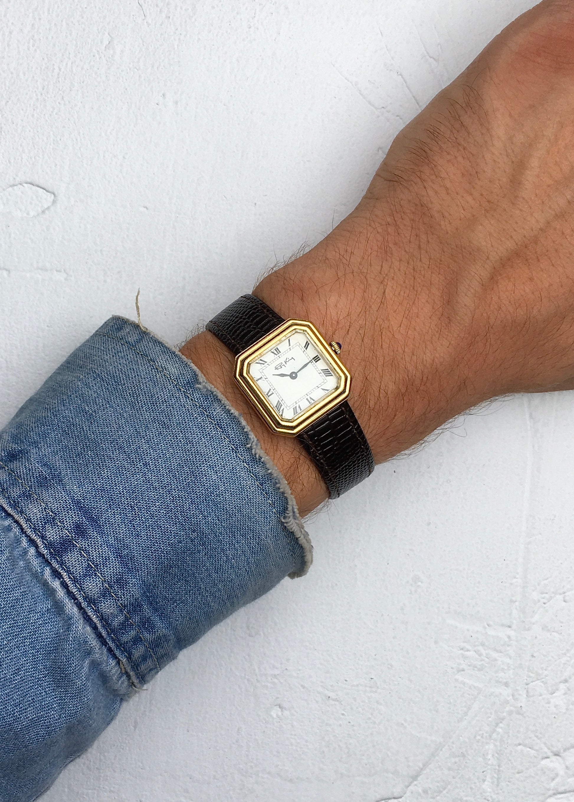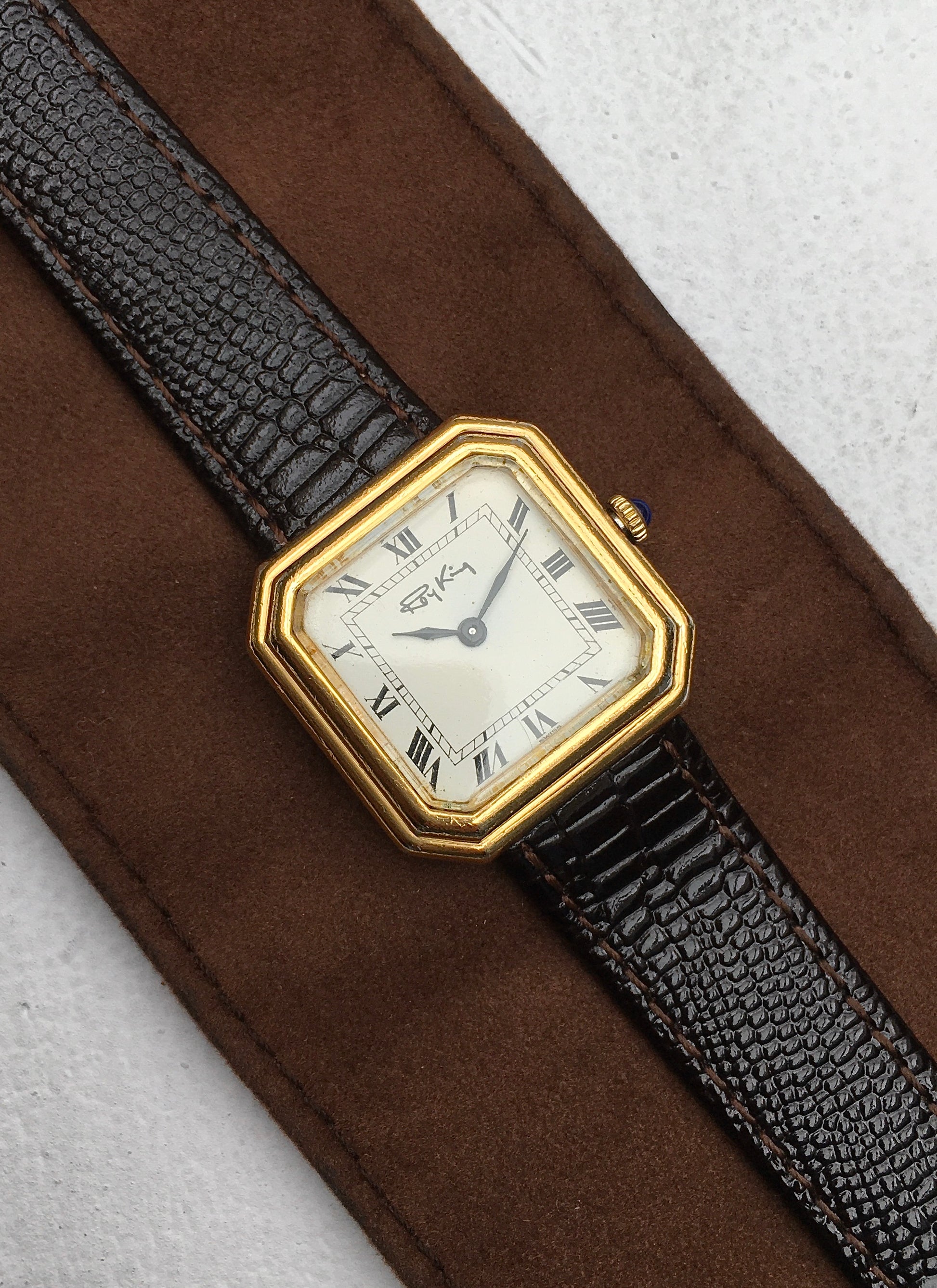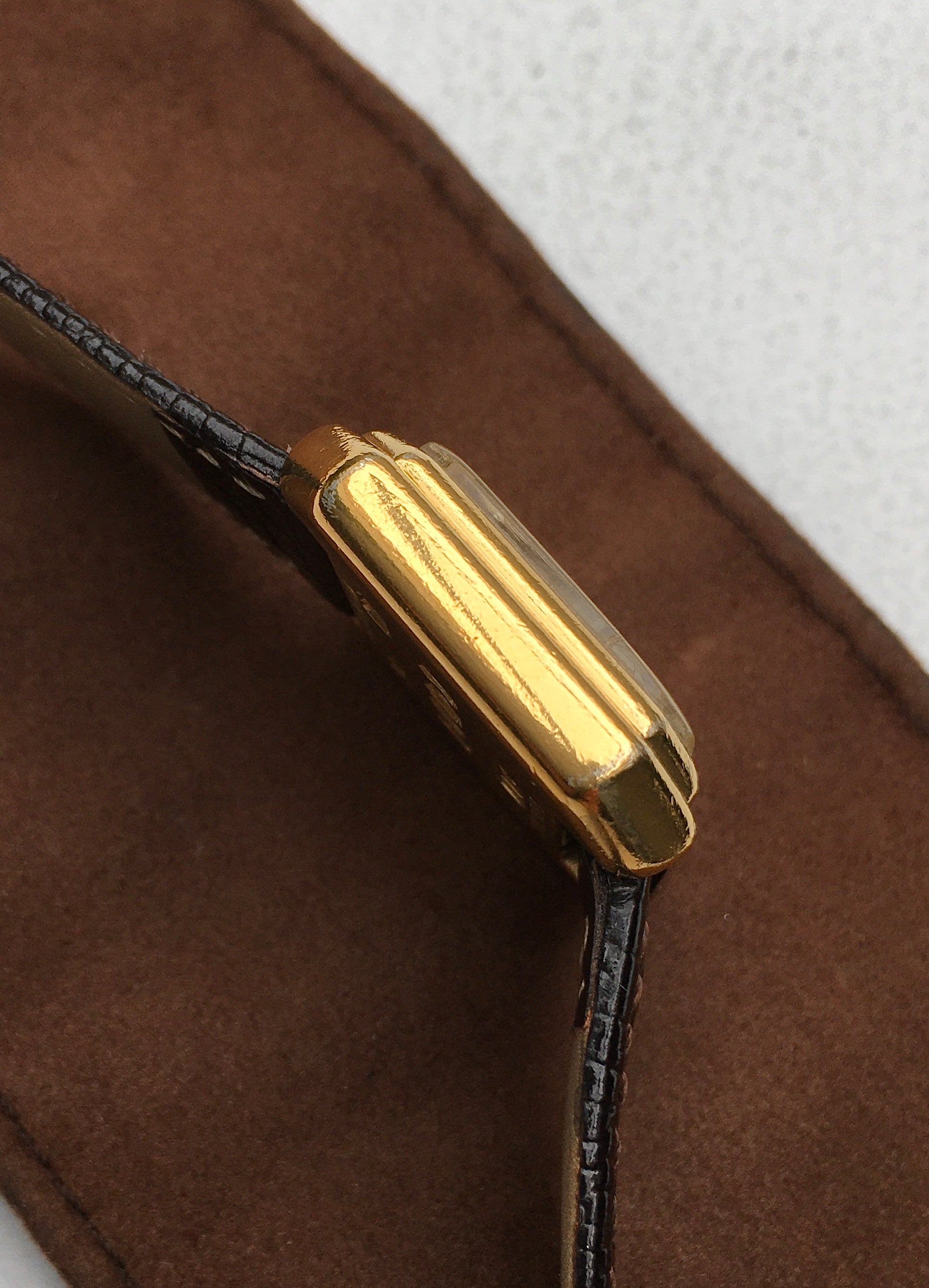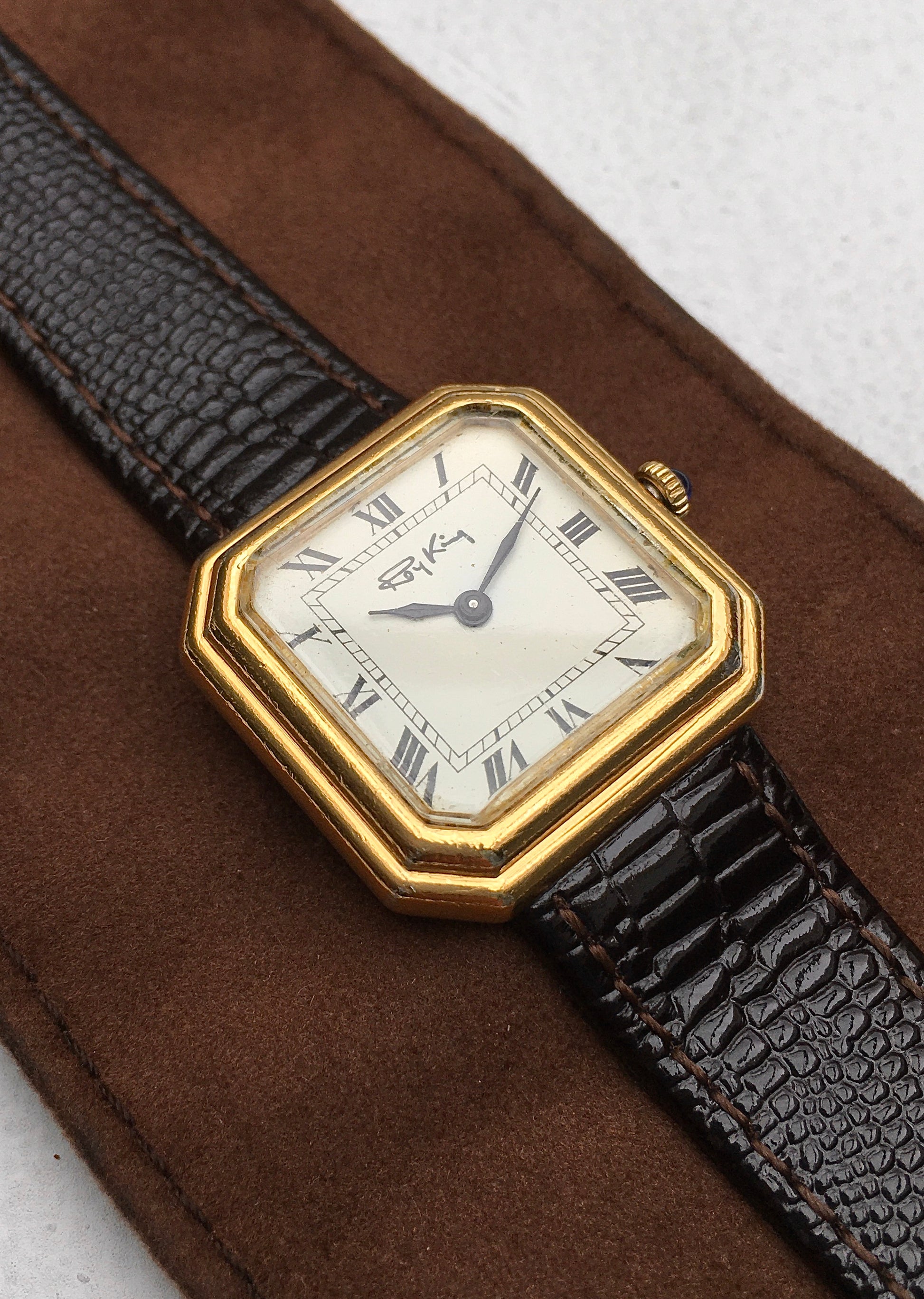 The Sterling Silver vermeil monocoque case, reminiscent of that of the Cartier Ceinture (Cartier being a brand for which King was once an unaccredited manufacturer), features a stepped bezel and bold statement hallmarks to the case back. Presented in good condition with slight wear to the plating in points