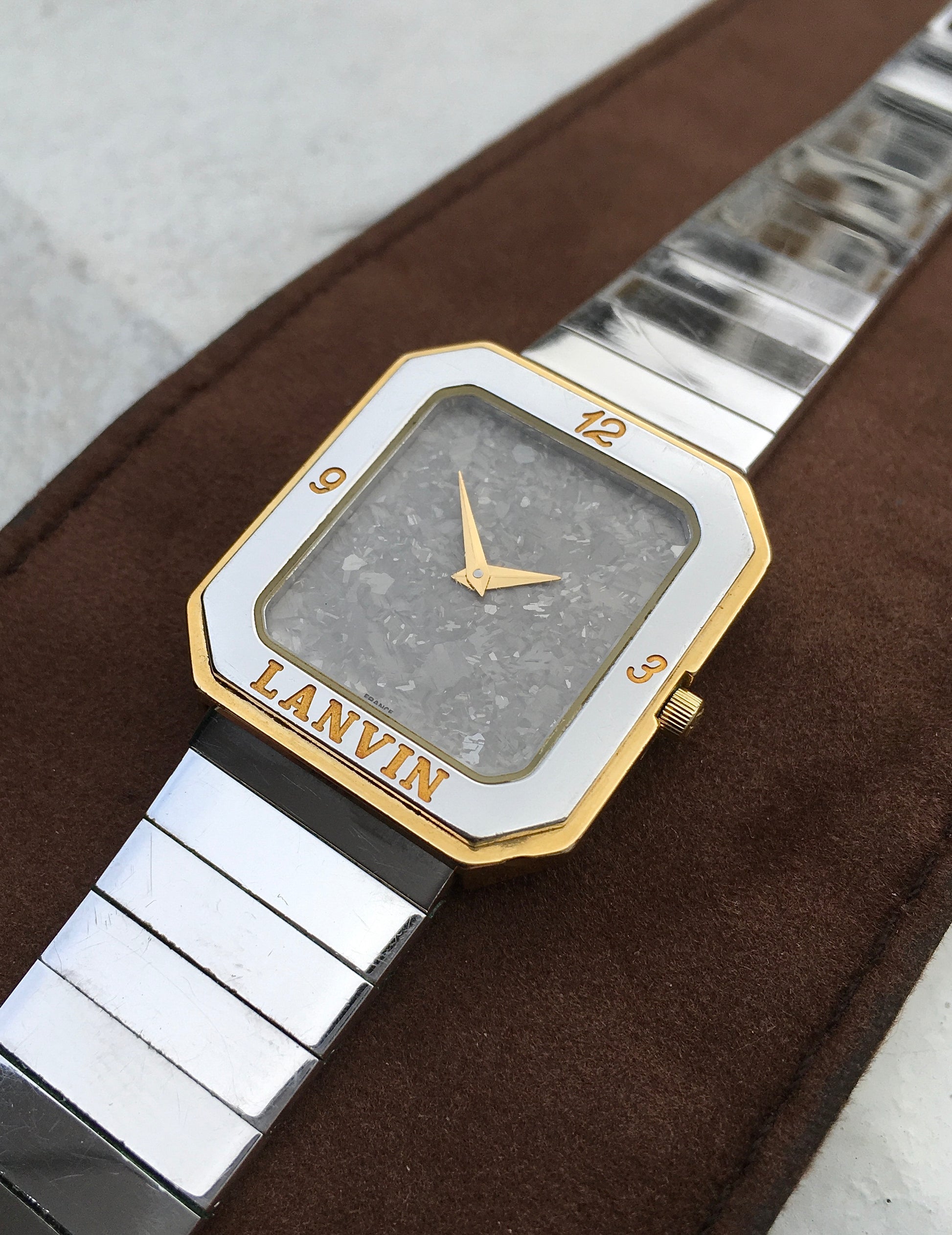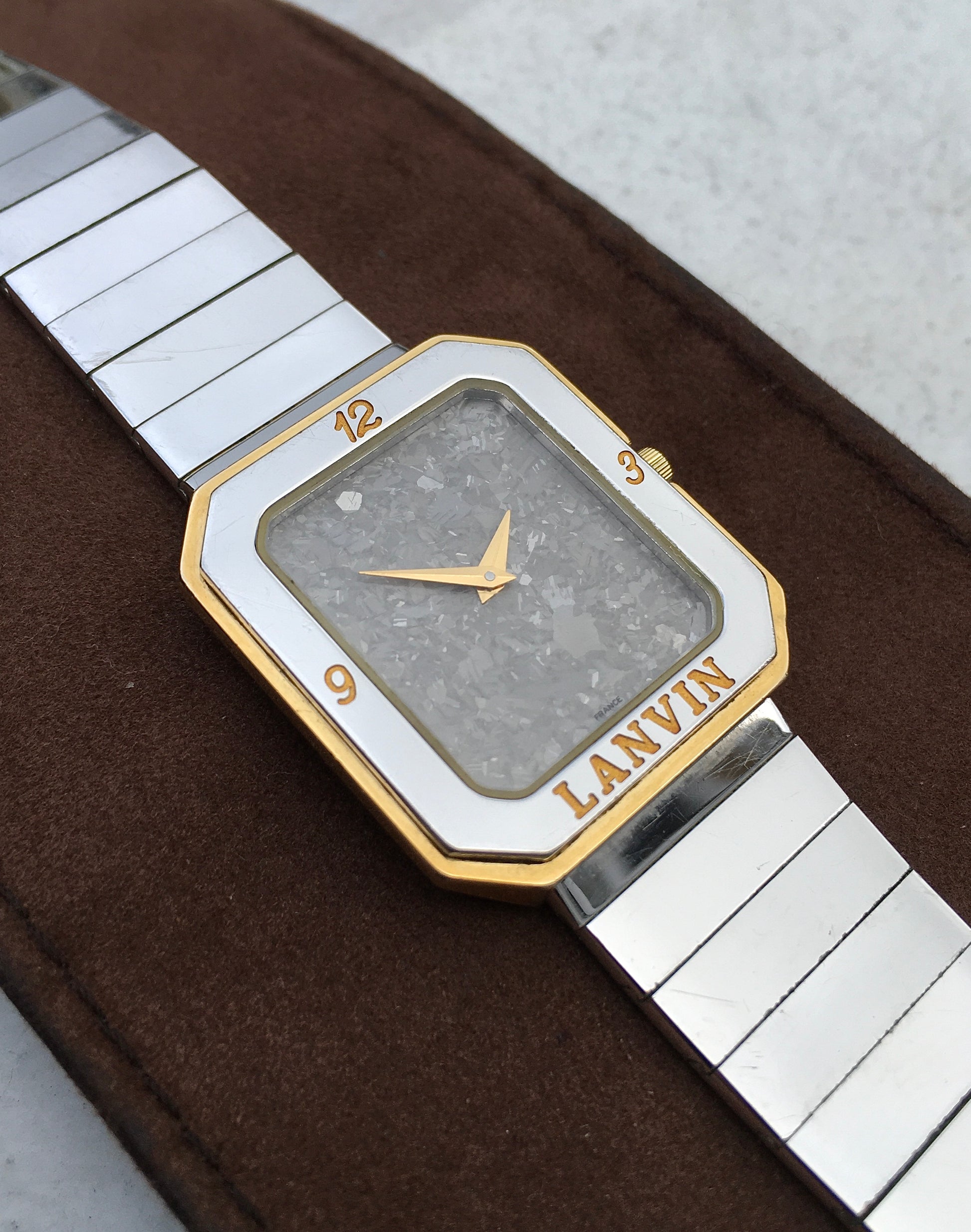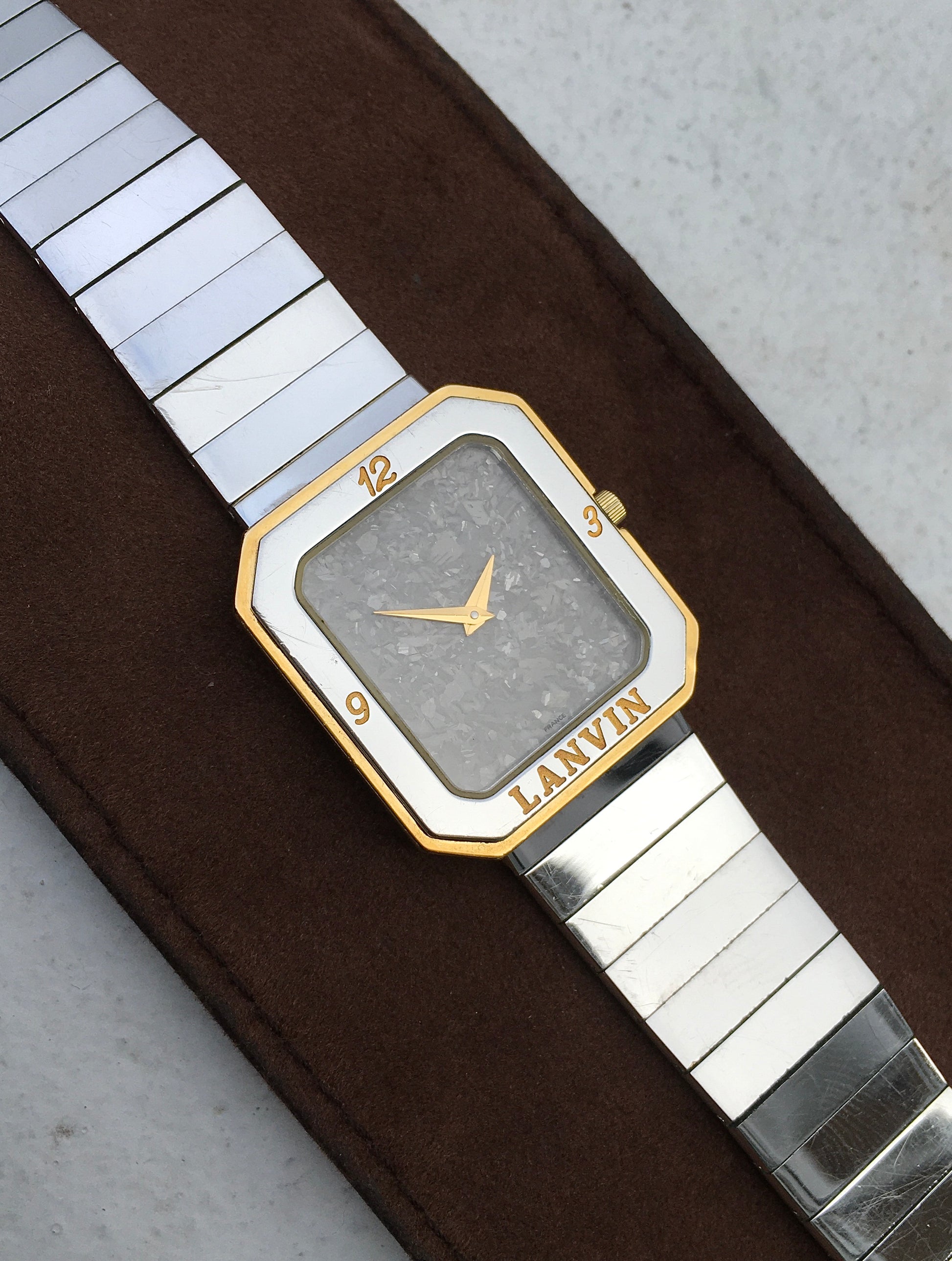 This Lanvin features a mosaic/meteorite type dial with golden Dauphine hands