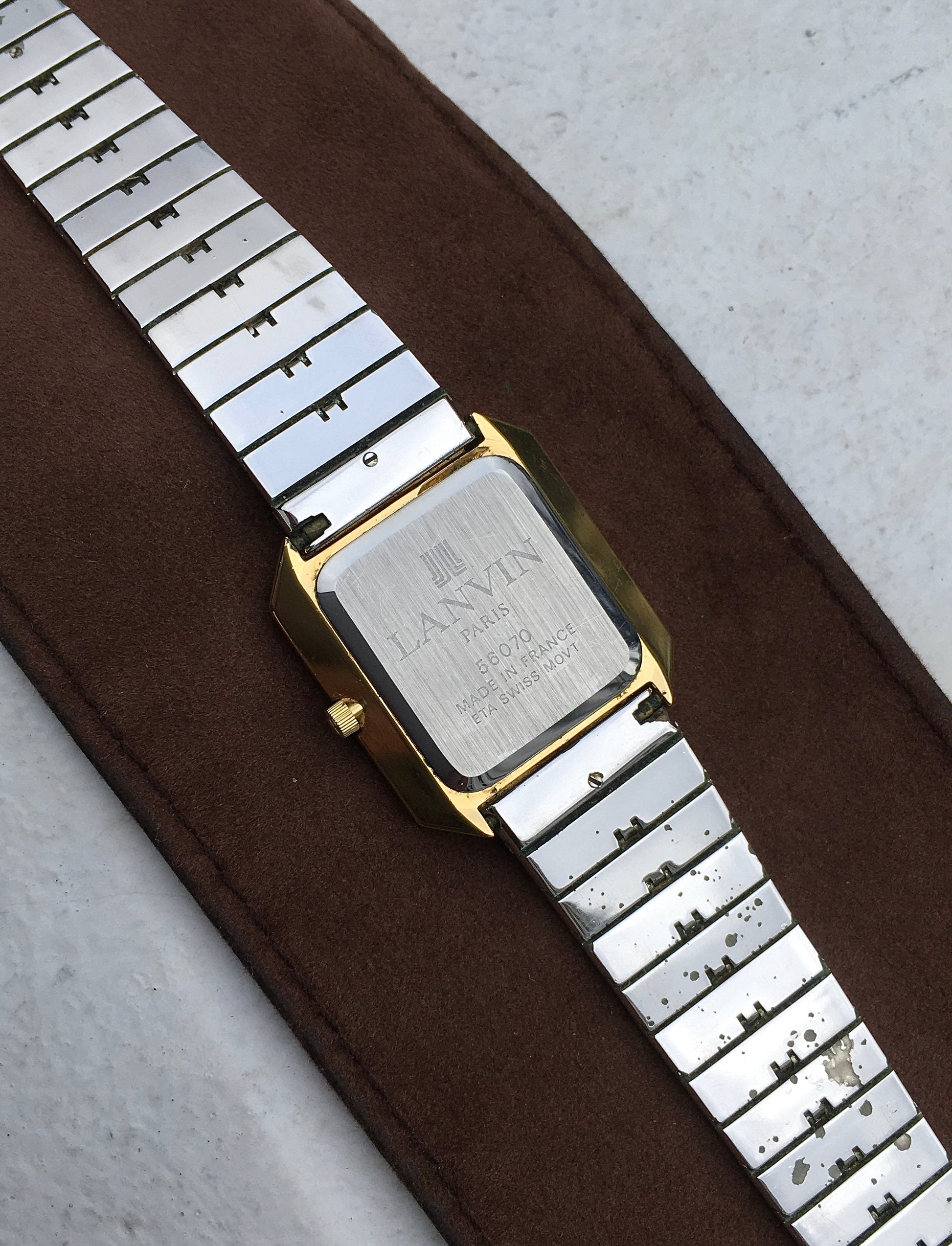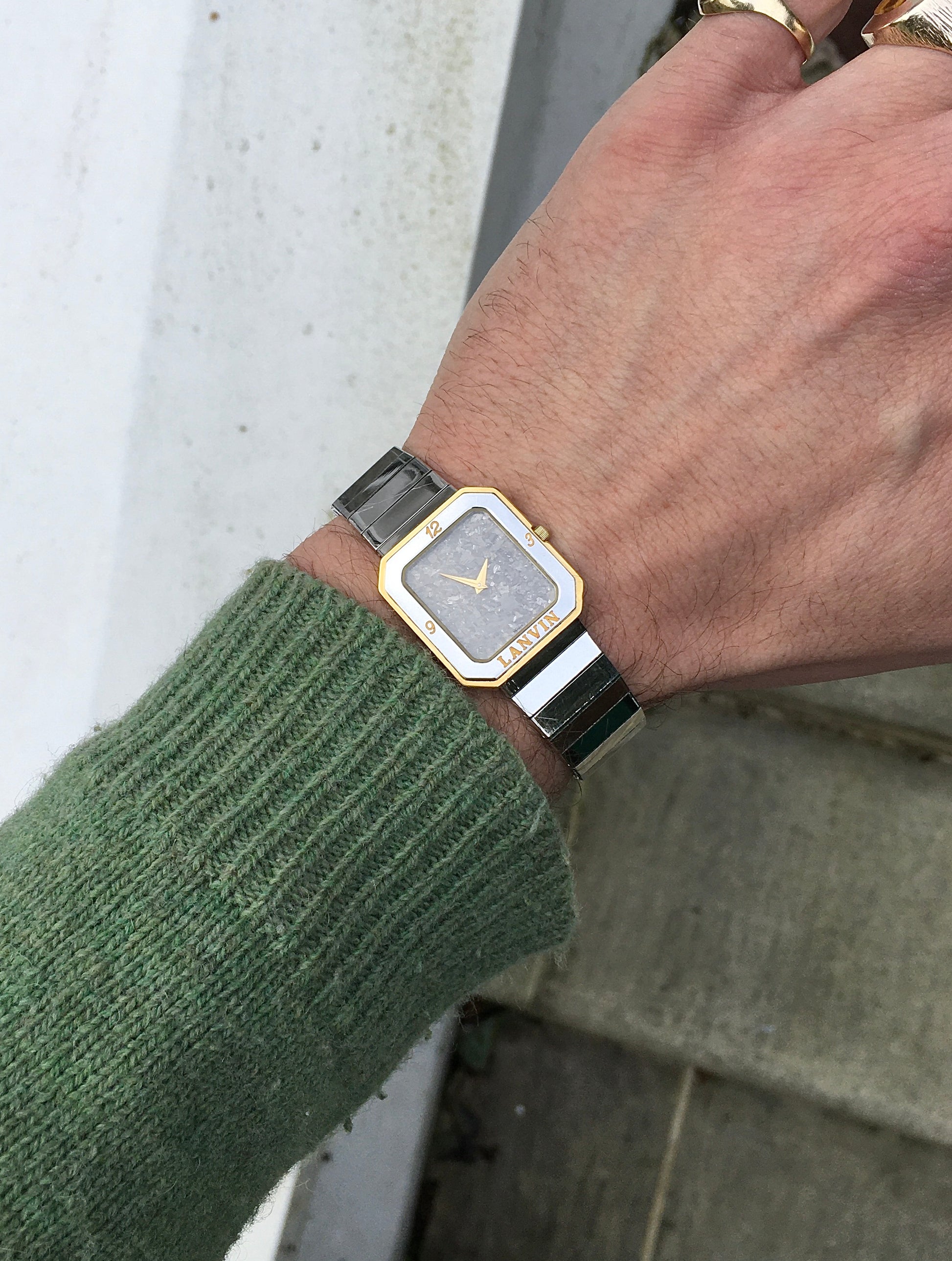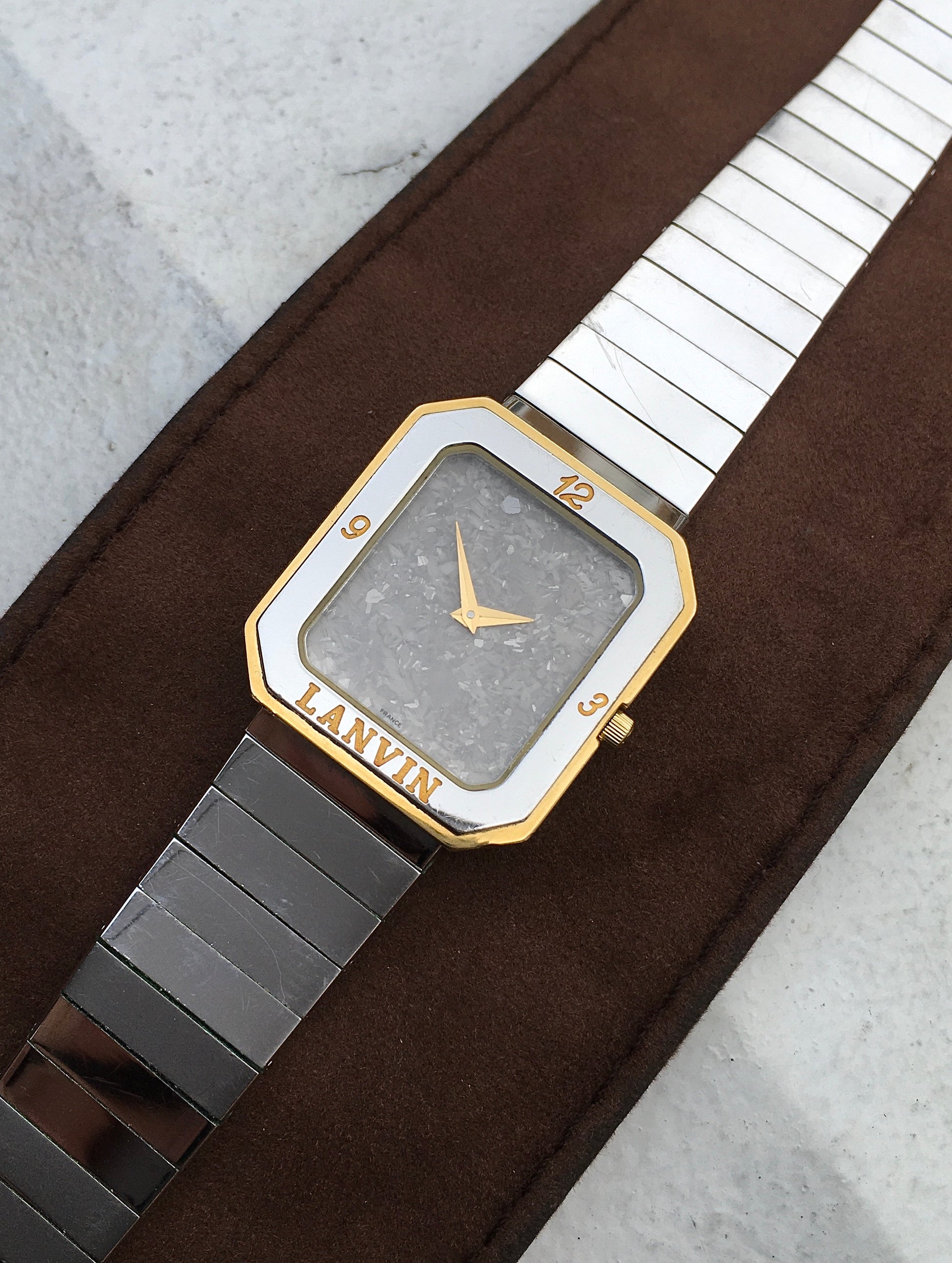 This Lanvin features a mosaic/meteorite type dial with golden Dauphine hands