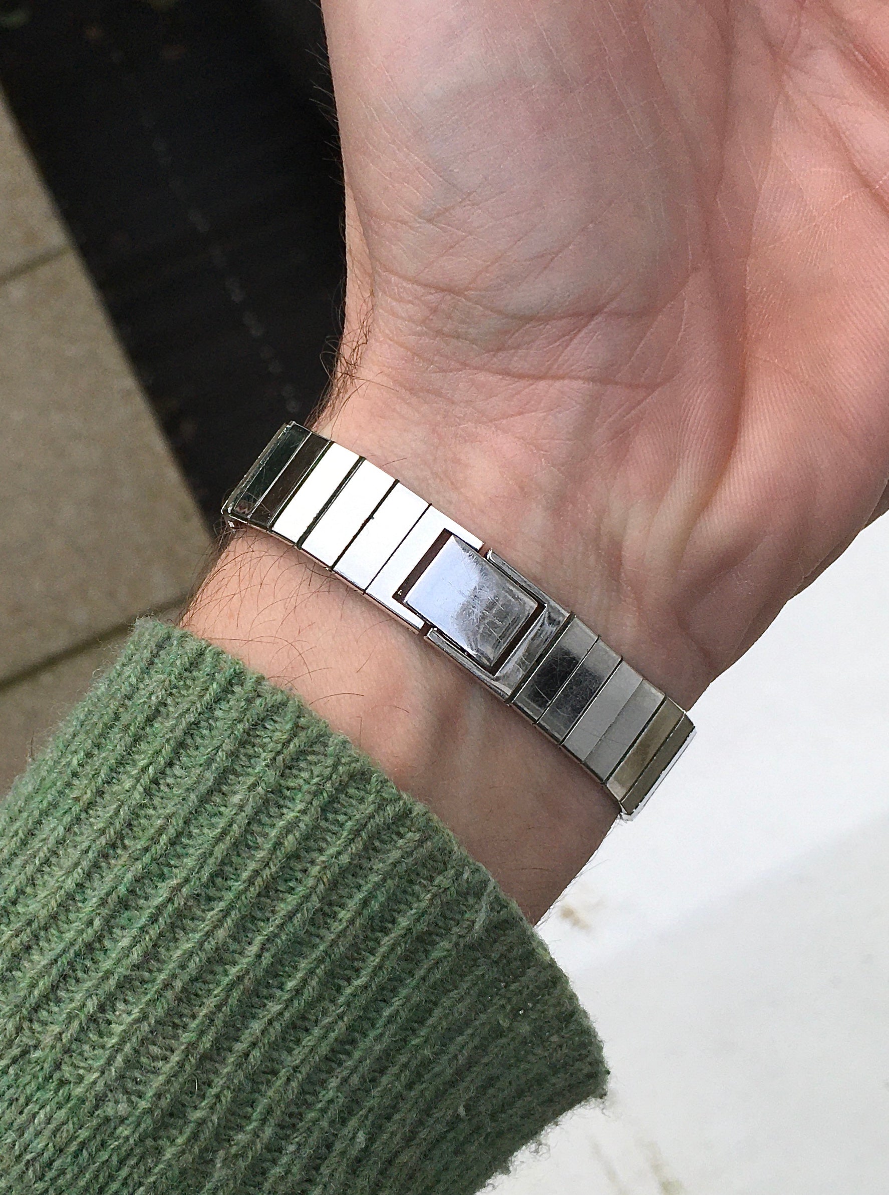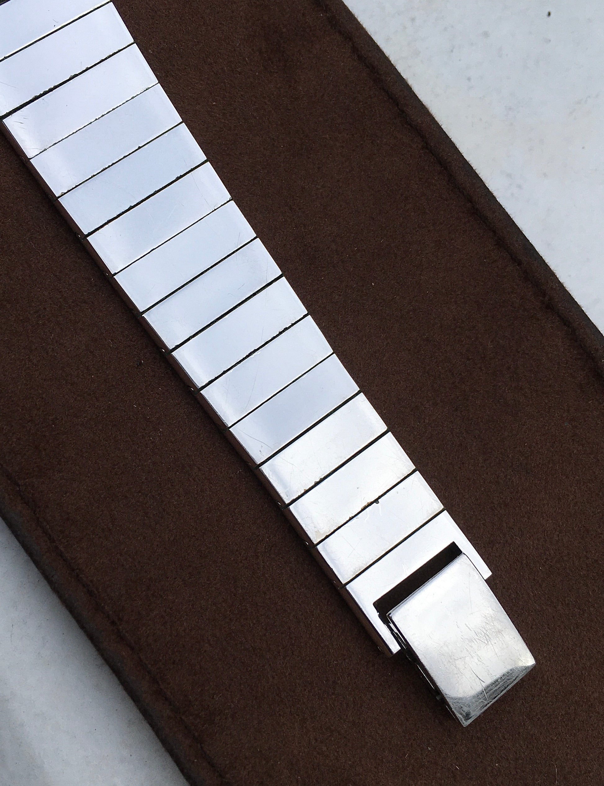 The lugged, high polish chrome plated bracelet is structurally in very good condition with cosmetic signs of wear. Wear to the plating can only be seen on the underside of the bracelet