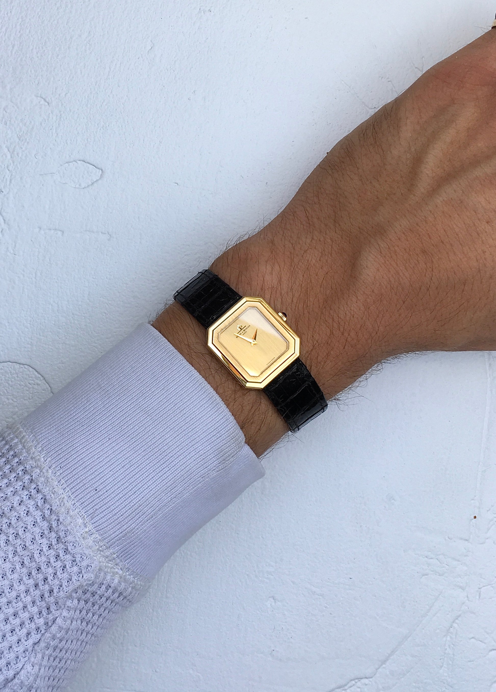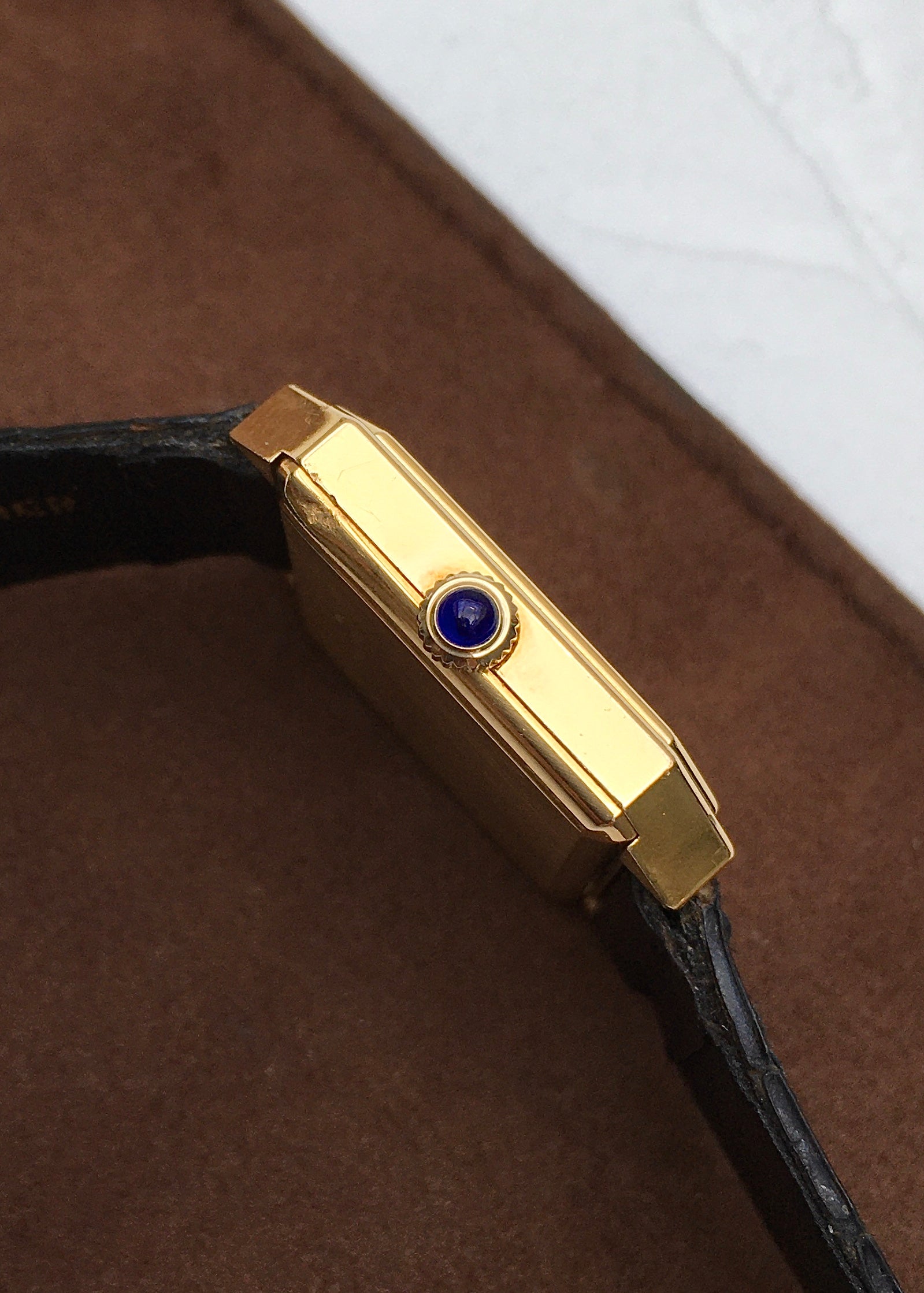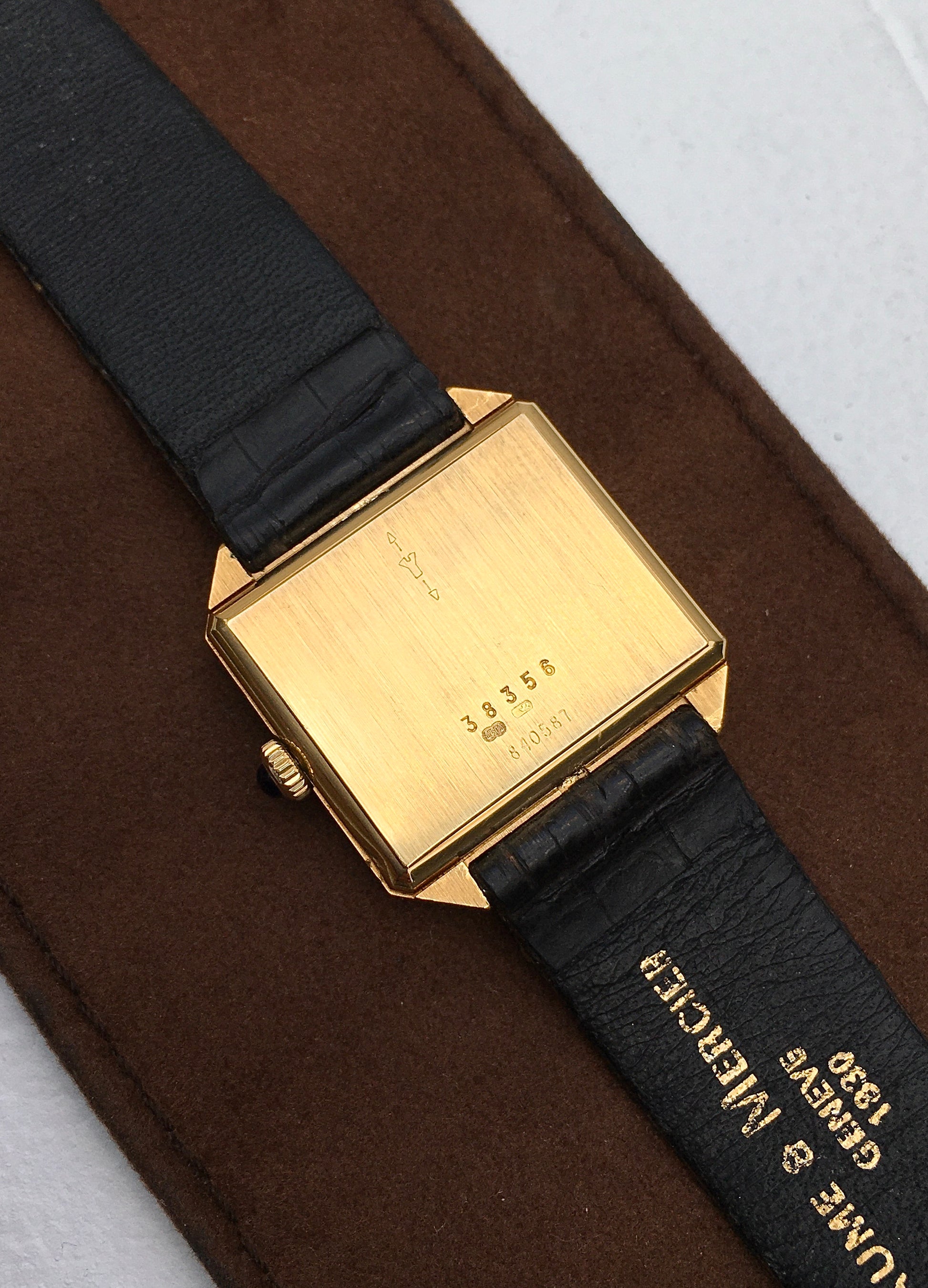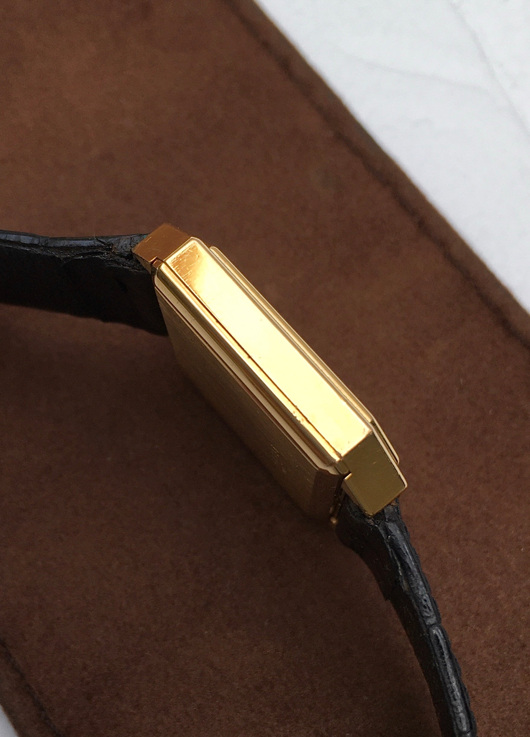 The brushed gilt dial remains in excellent condition and is decorated with golden Dauphine hands and the marque’s applied logo at 12