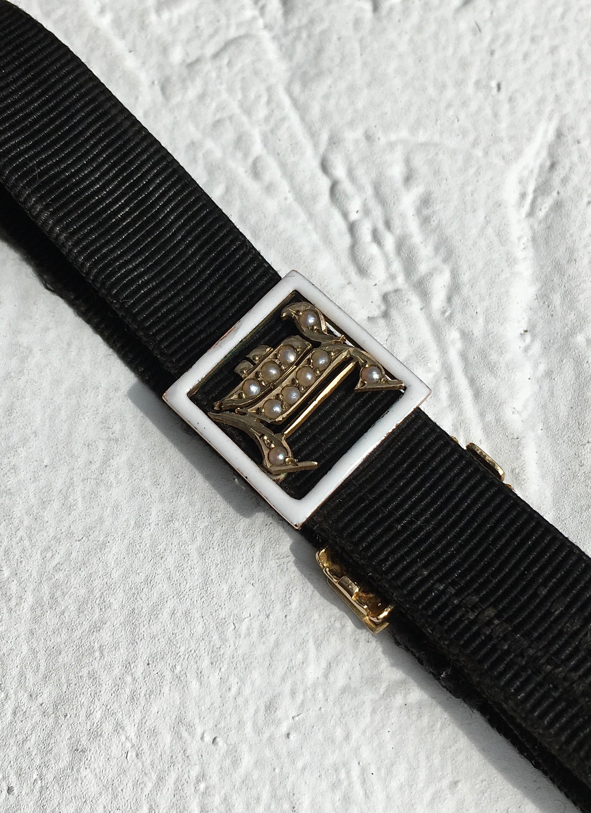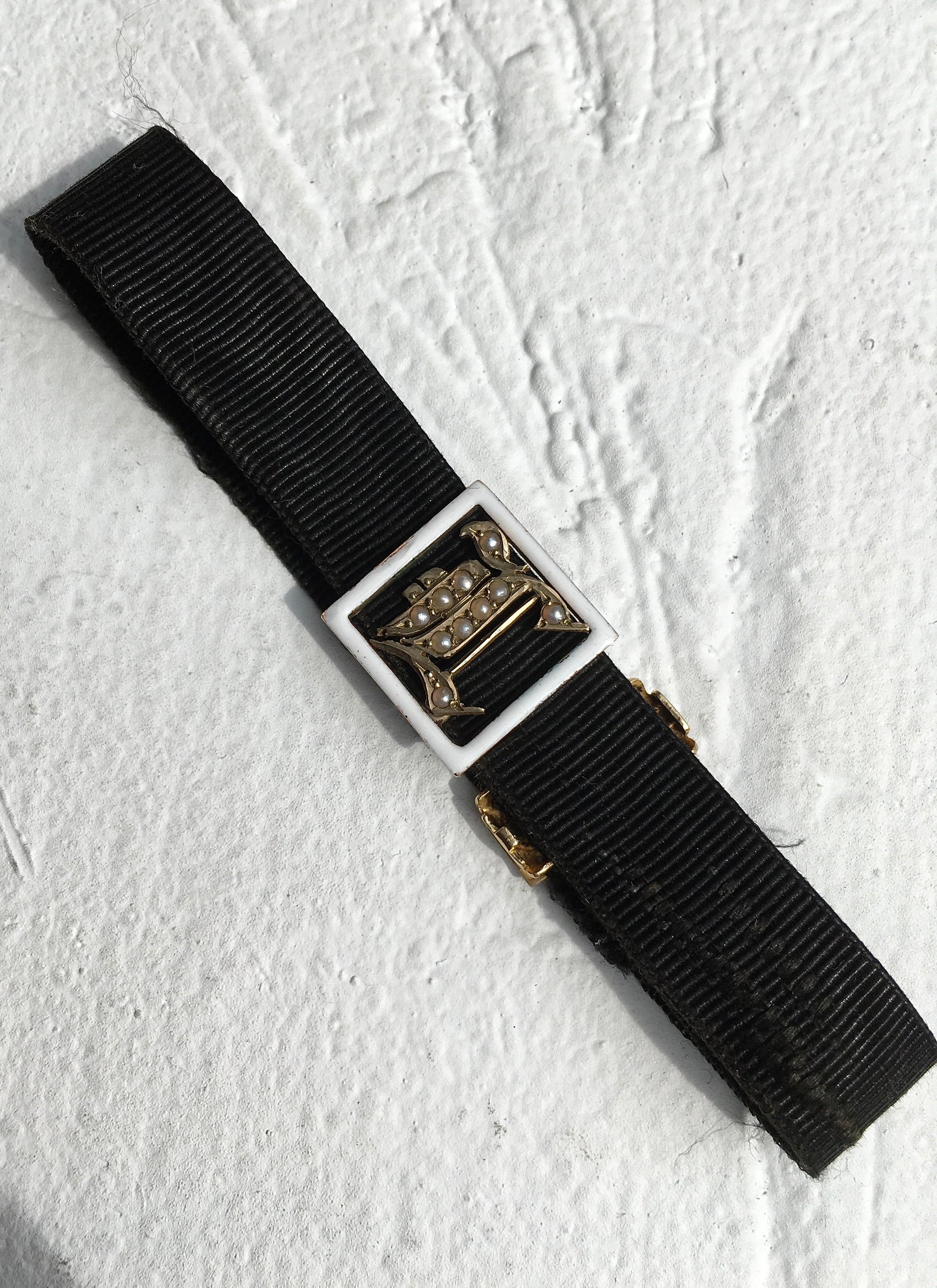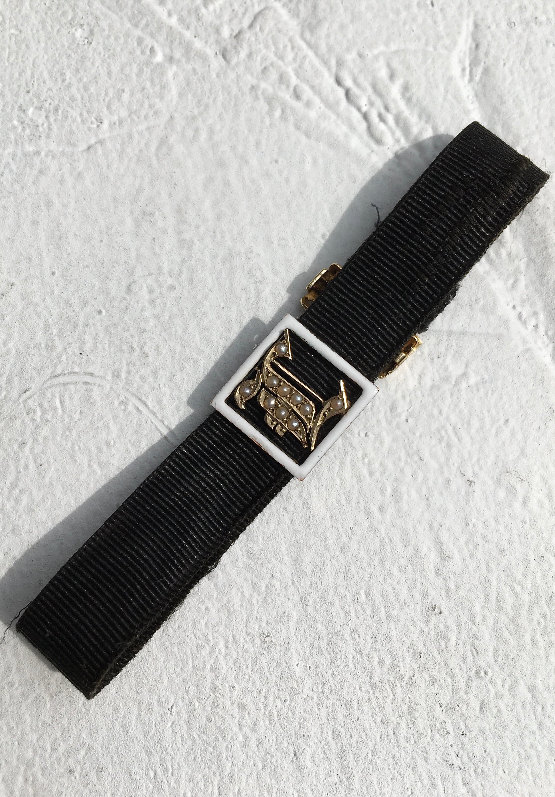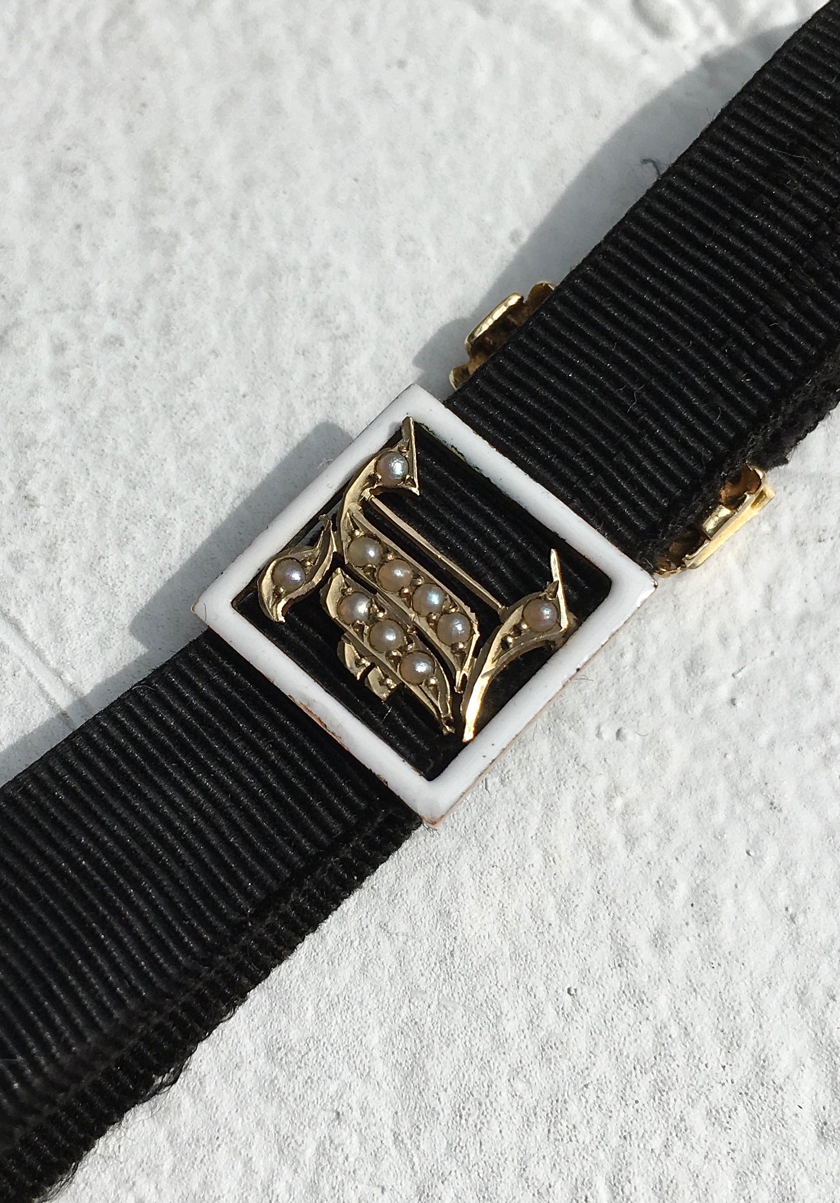 This stunning Victorian piece is a wonderful example. A 9 carat gold Gothic Script or Blackletter ‘L’, set with seed pearls and framed by a boarder of white enamel, is set on a black Grosgrain ribbon