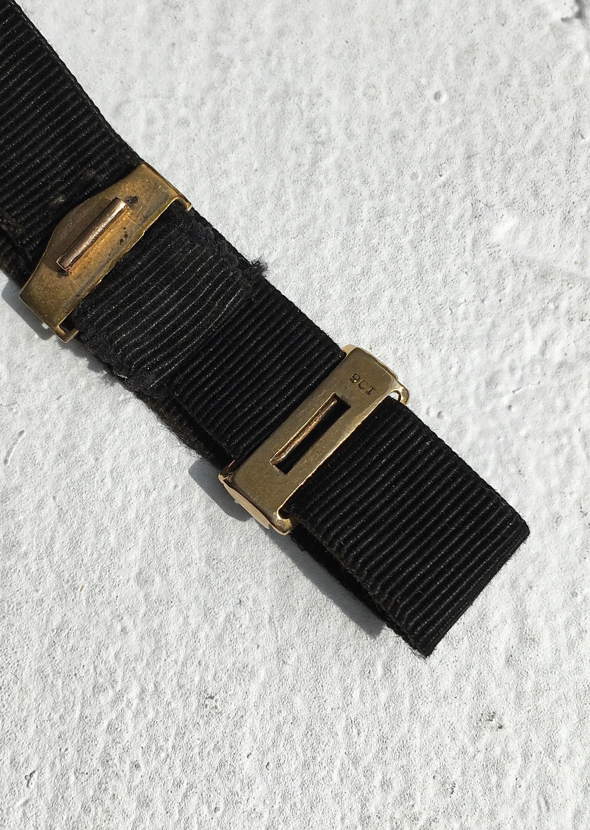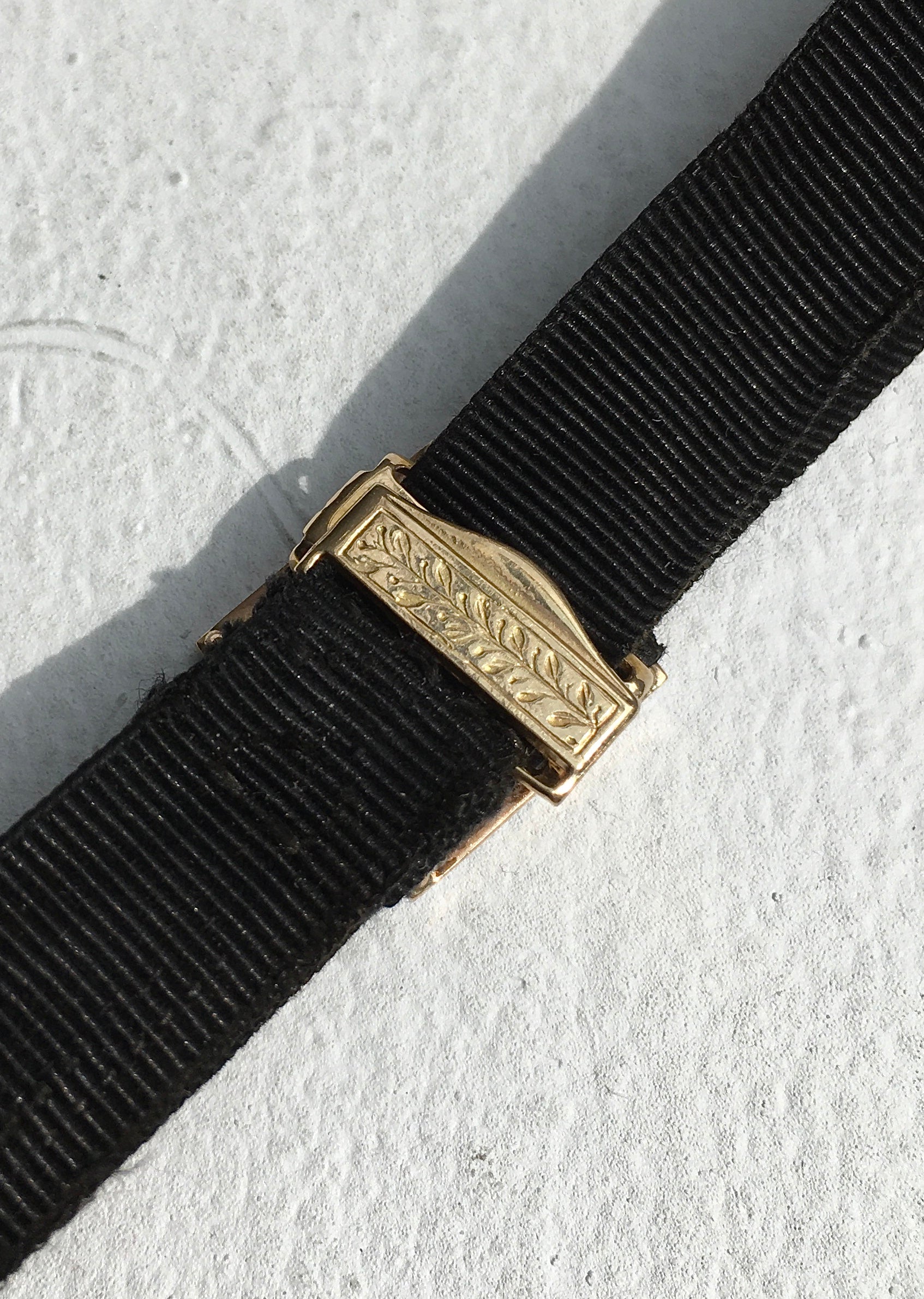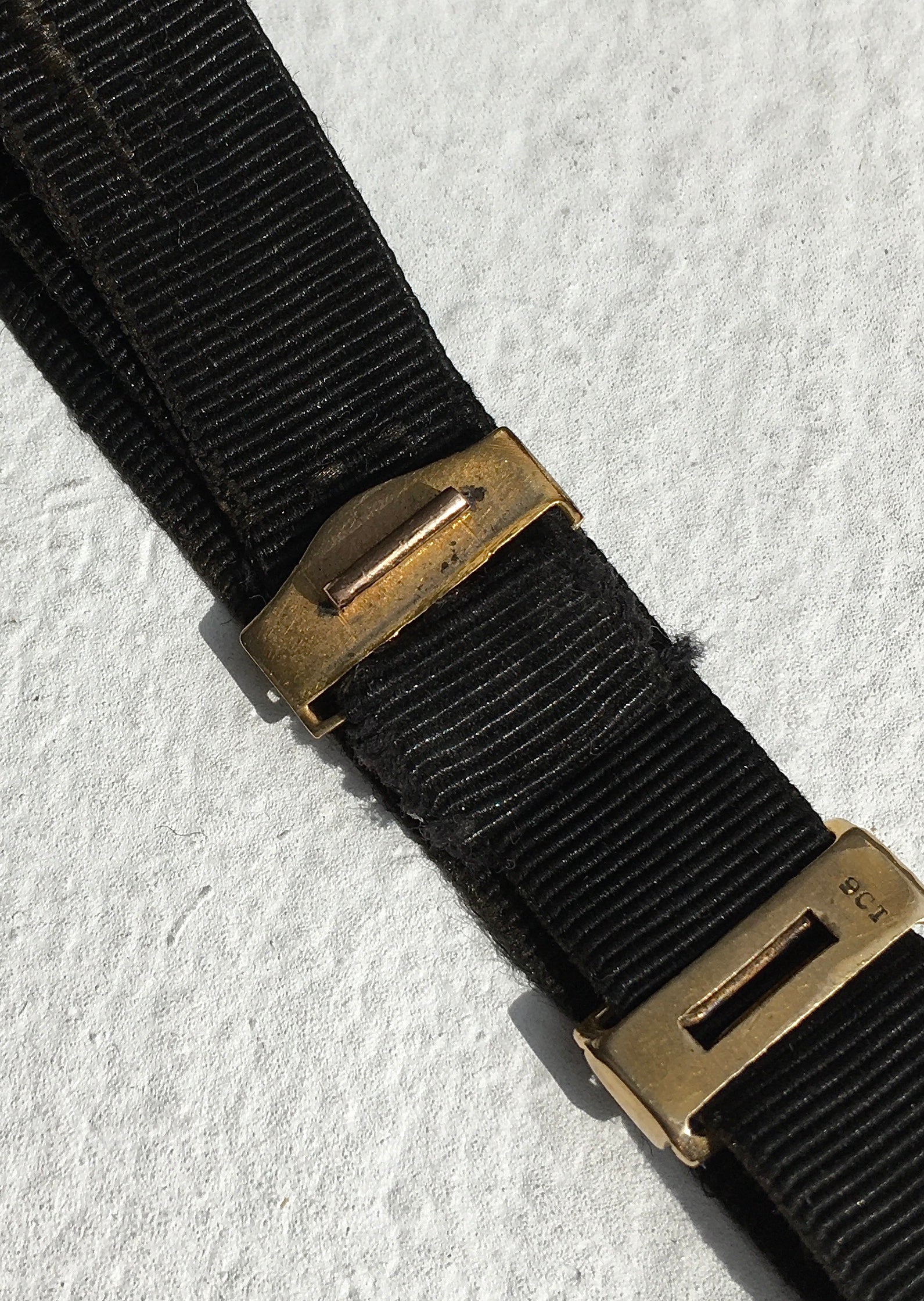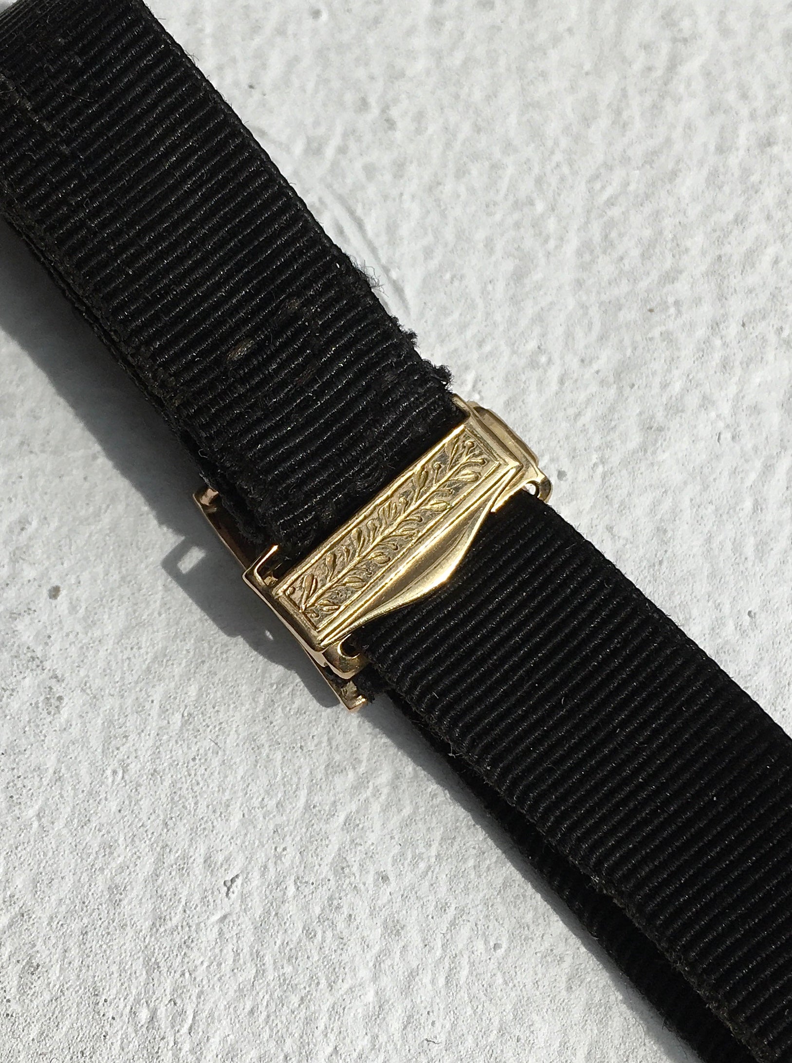 This stunning Victorian piece is a wonderful example. A 9 carat gold Gothic Script or Blackletter ‘L’, set with seed pearls and framed by a boarder of white enamel, is set on a black Grosgrain ribbon