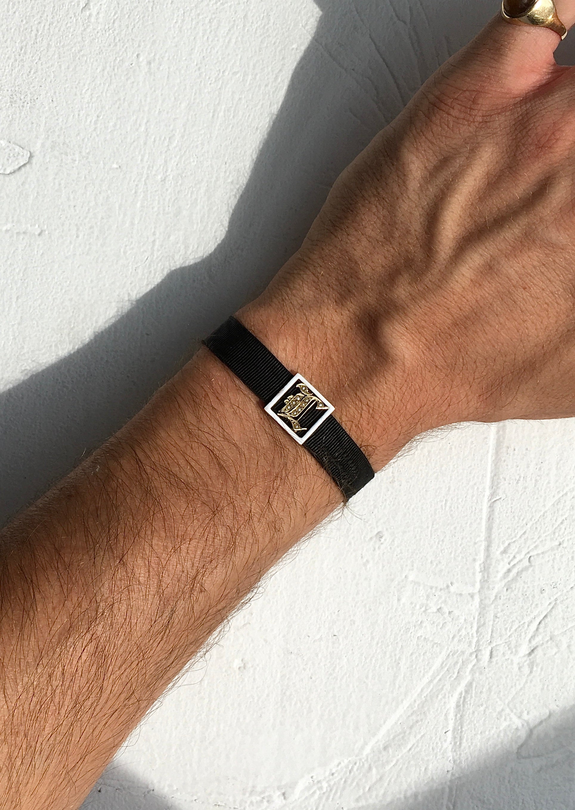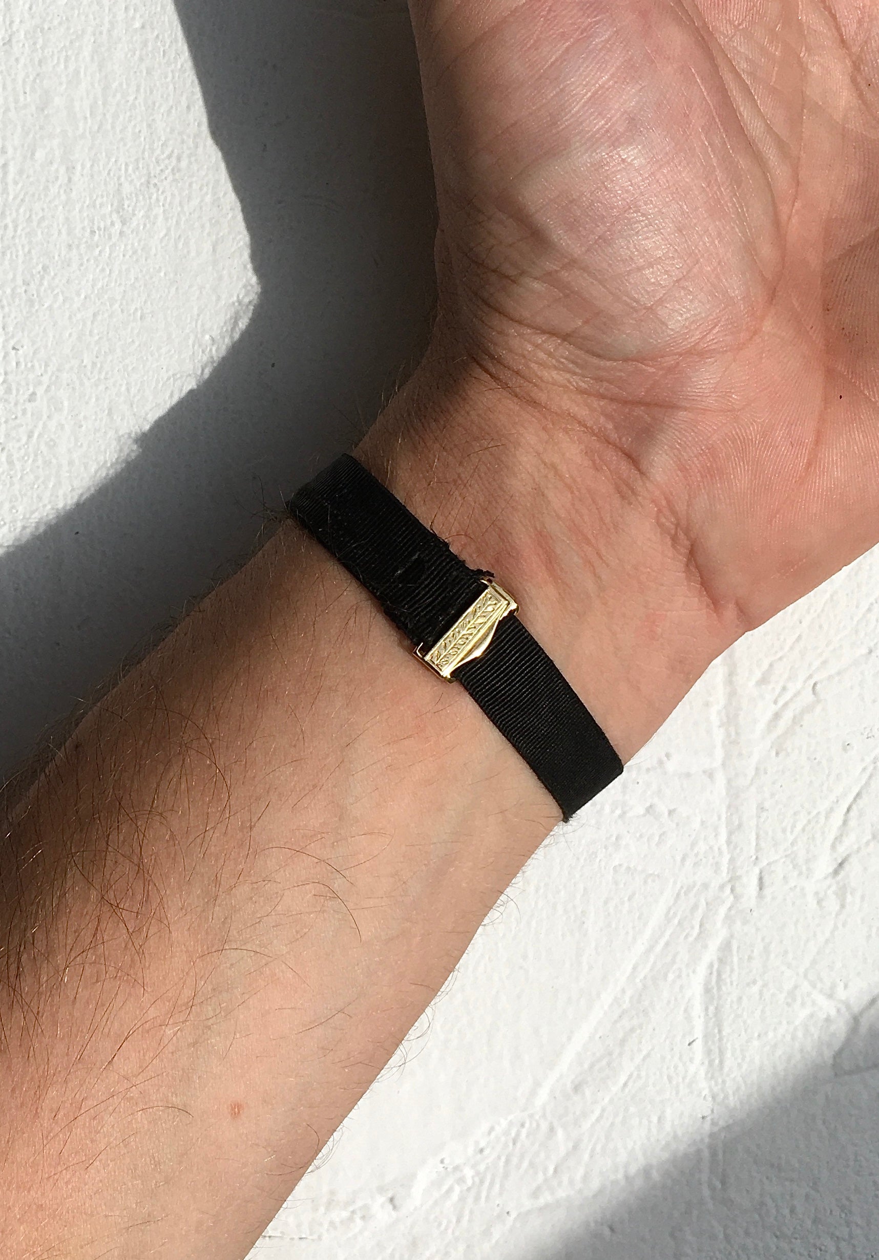The length of the ribbon can be adjusted and the bracelet fastened by a 9ct gold clasp