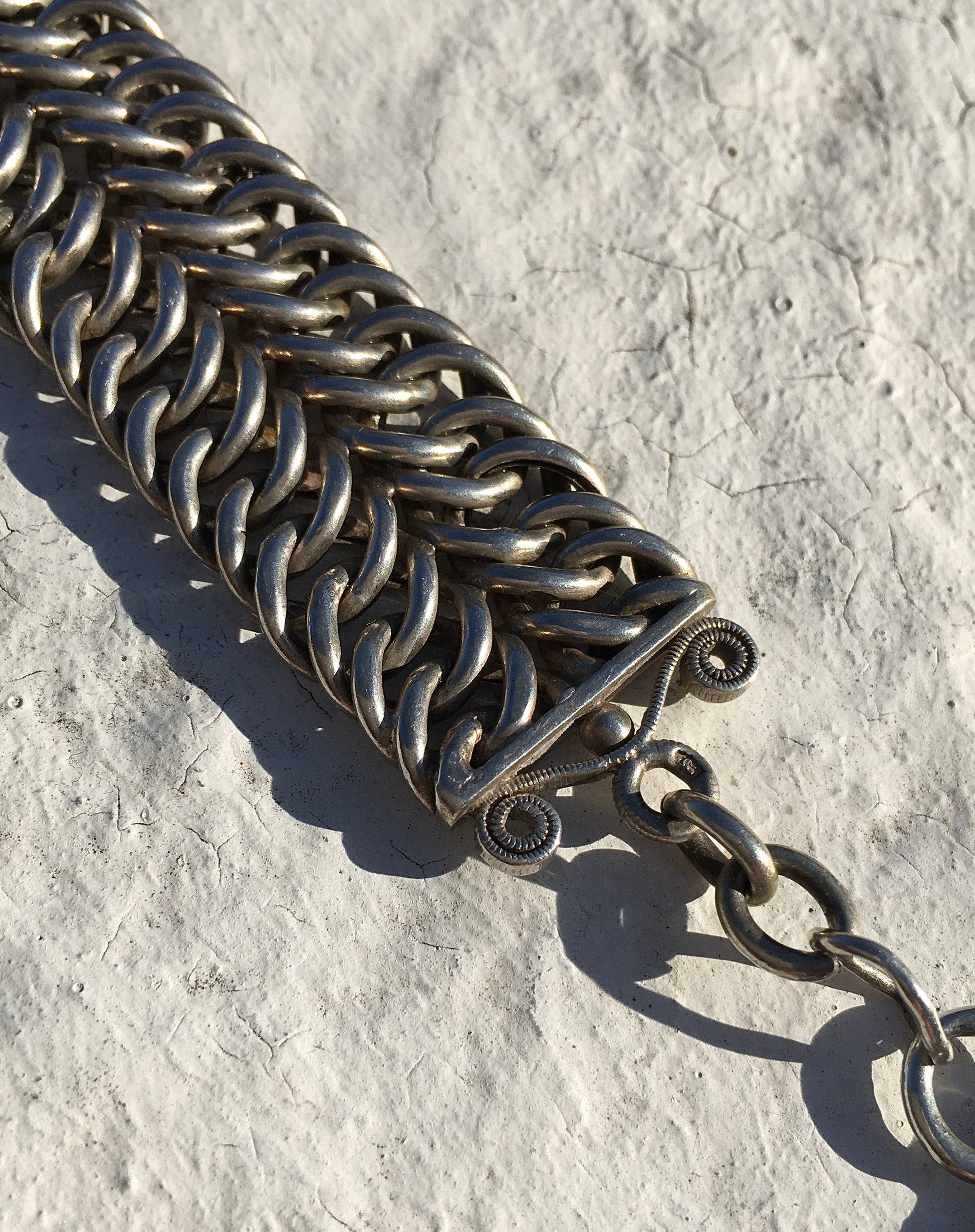 Wonderfully ornate, this masterfully formed double link silver fob chain is hallmarked in multiple places and fastens securely via a dog clip. It would have been worn from the fob pocket of a pair of breeches. Worn today it could be hung from a variety of places, including the belt loop of a pair of trousers