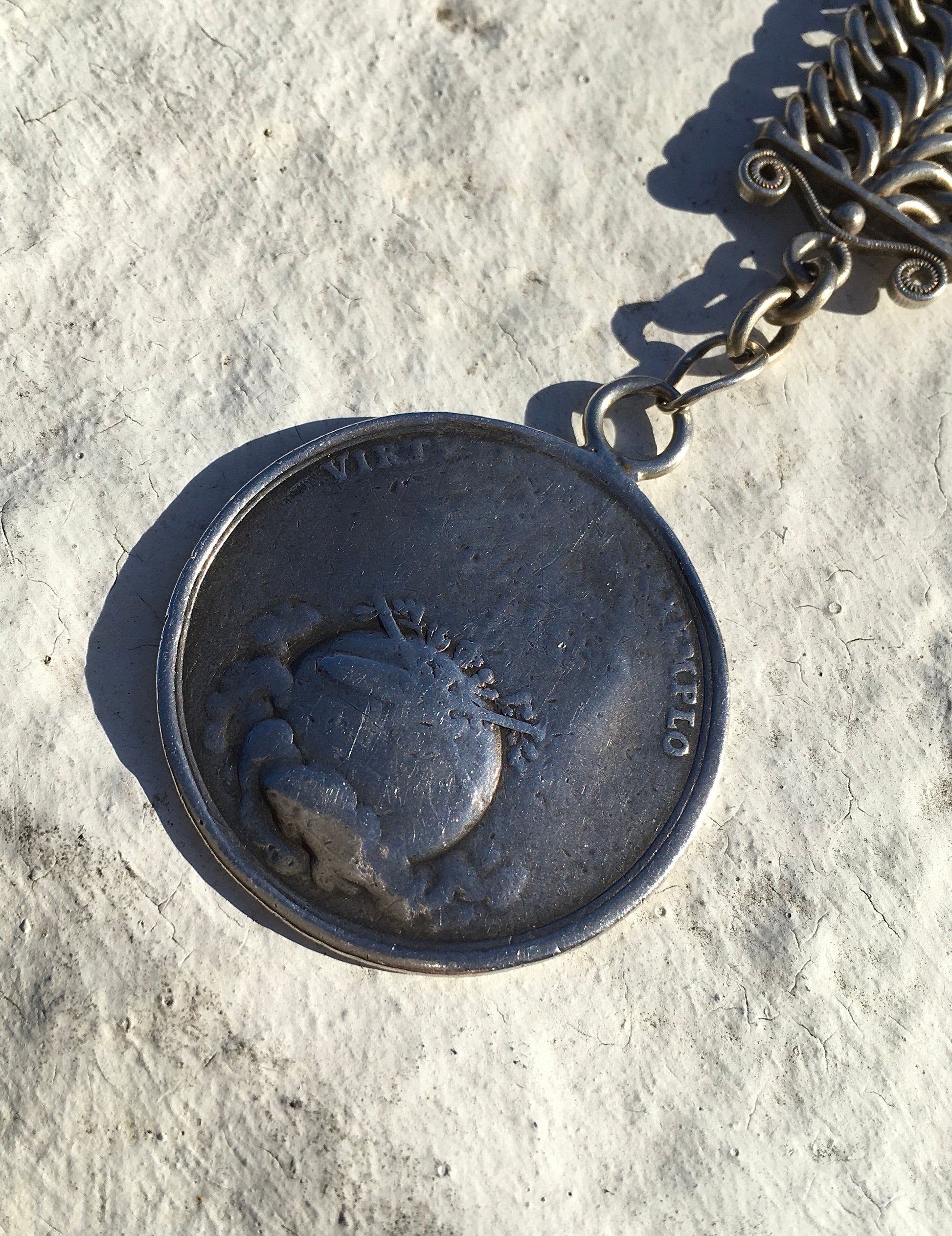 A gorgeous antique late 18th early 19th century decorative silver fob chain from which hangs an antique silver coin bearing the profile of the Holy Roman Emperor Joseph II, ruler of the Hapsburg monarchy from 1780 until his death ten years later