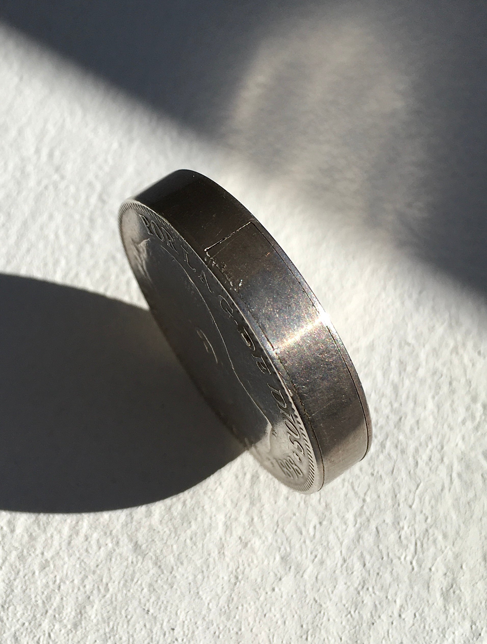 The bespoke hinged mechanism sits so flush between the two faces of the split coin that it’s hard to believe the piece was ever anything other than a lighter