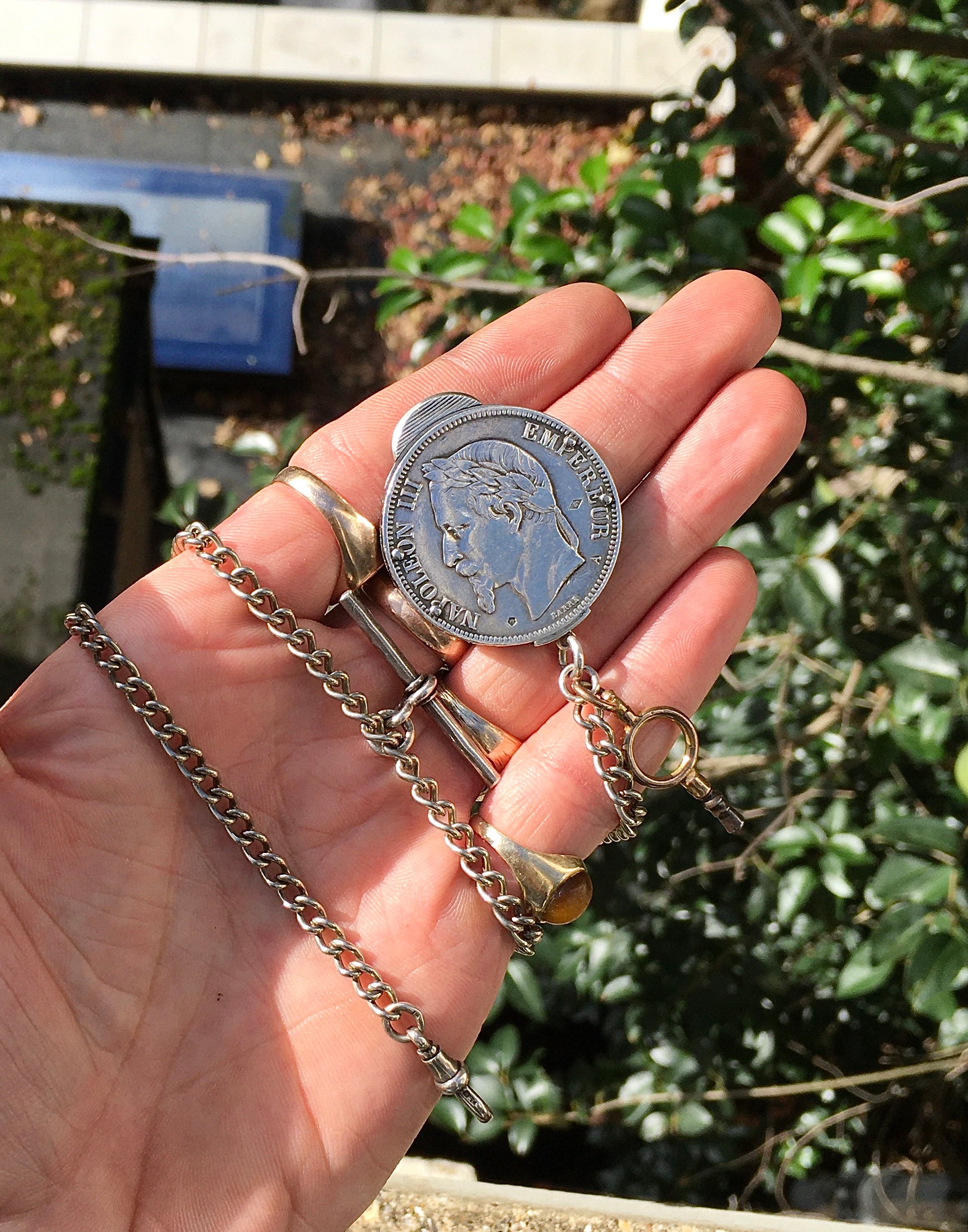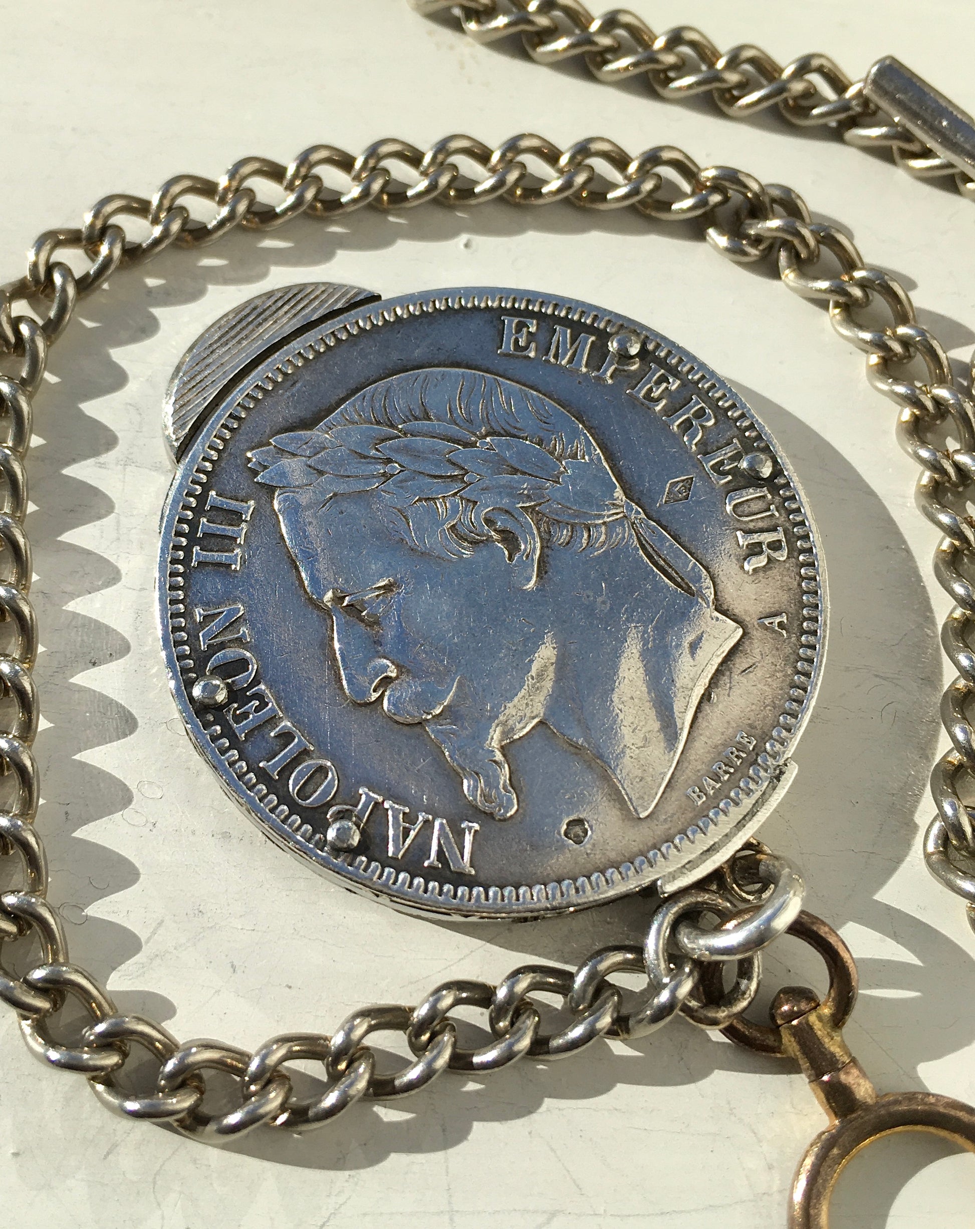 Setting it aside from a normal 5 Franc coin of a similar vintage, despite the insertion of a cutter, are the hallmarks. Pernet’s maker’s mark is stamped on both sides while the French ‘le crabe’ (crab) hallmark (used by Assay offices to mark silver jewellery and accessories of a 800/000 fineness and up from 1838 up until 1962) can be seen clearly stamped under Napoleon III’s chin