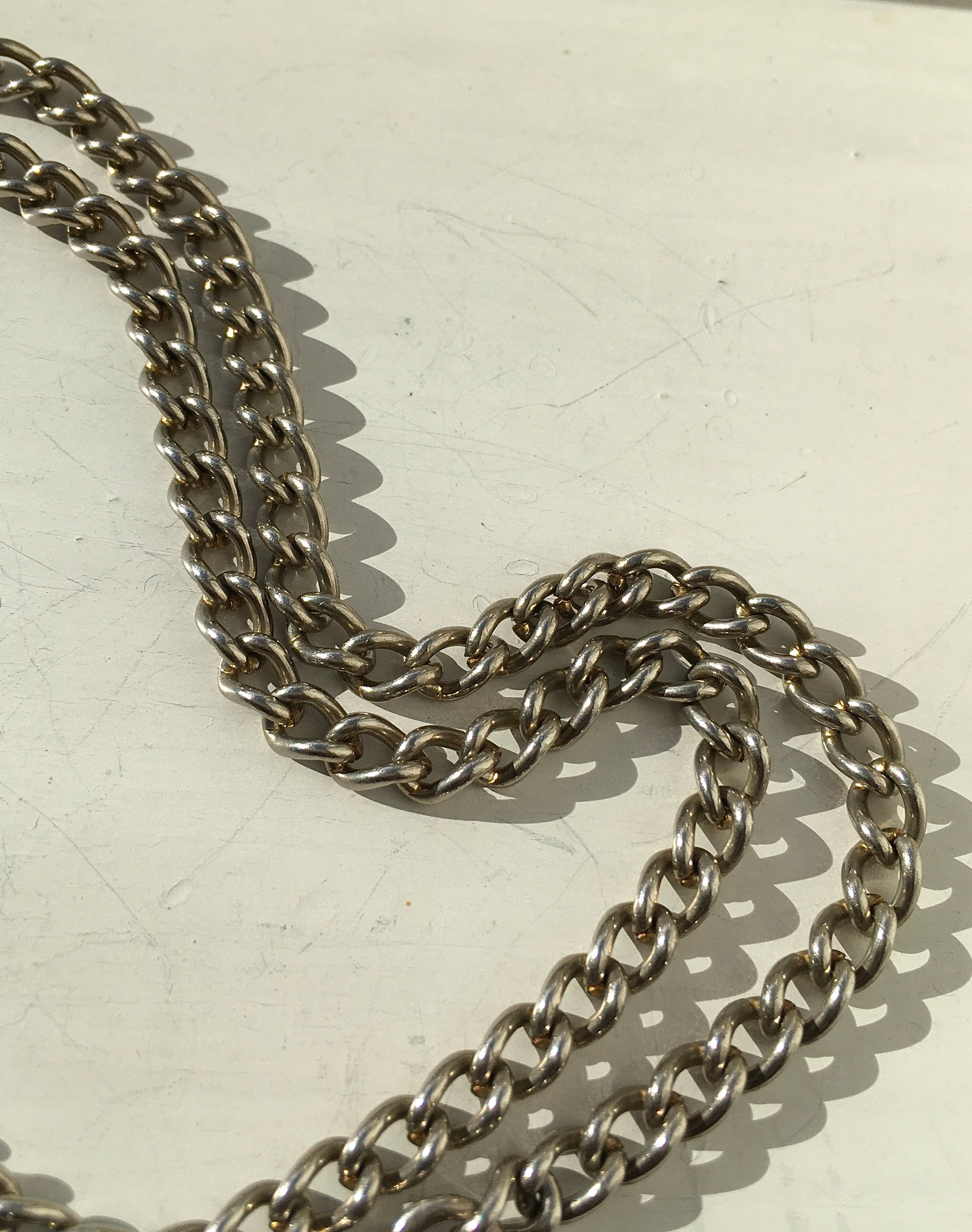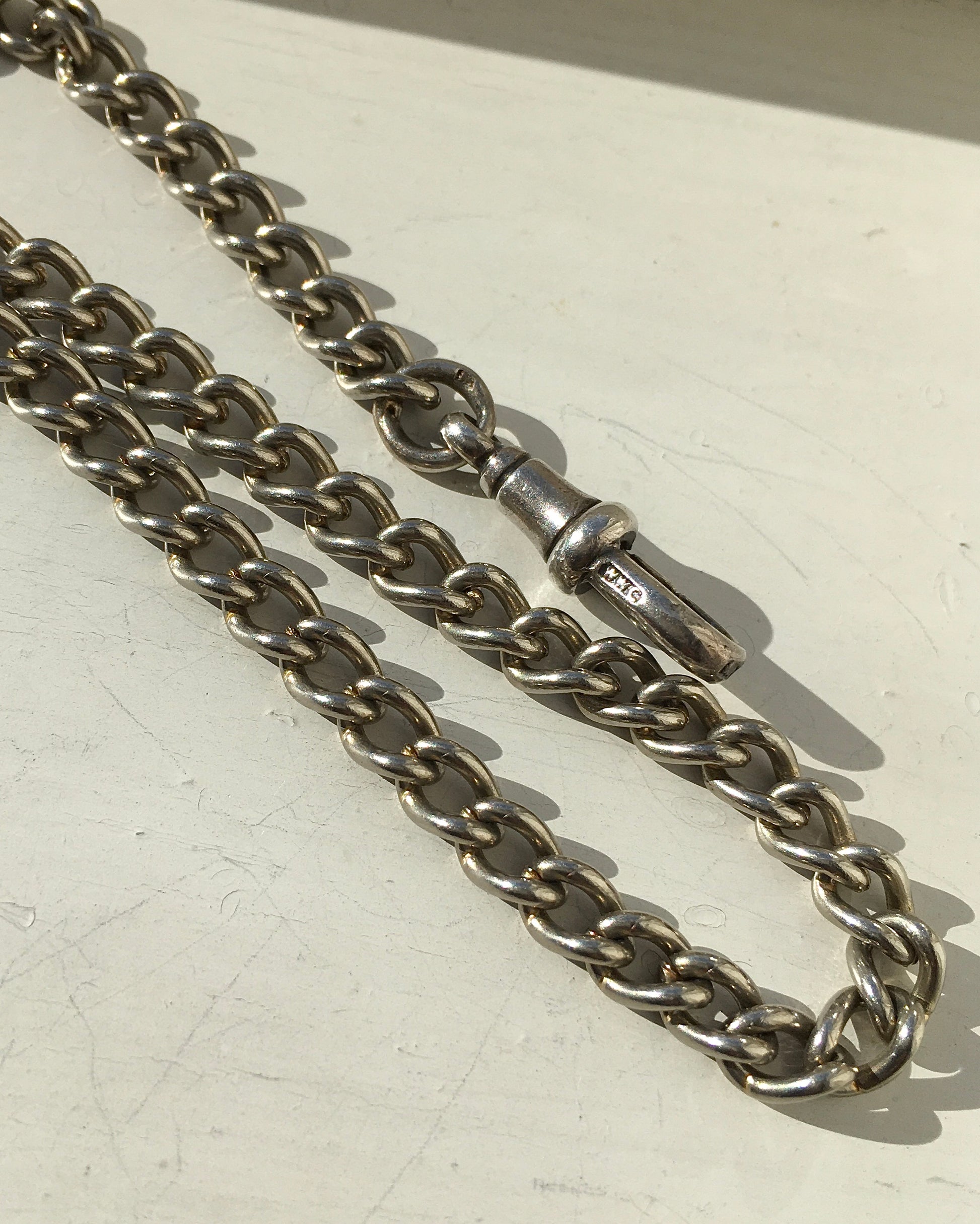Attached to the cutter’s bail is an antique fob watch key as well as an antique Sterling silver, curb link Albert chain complete with T bar (hallmarked England 1906) and swivel dog clip. This allows for the cutter to be worn through button holes of waistcoat or lapel of a jacket