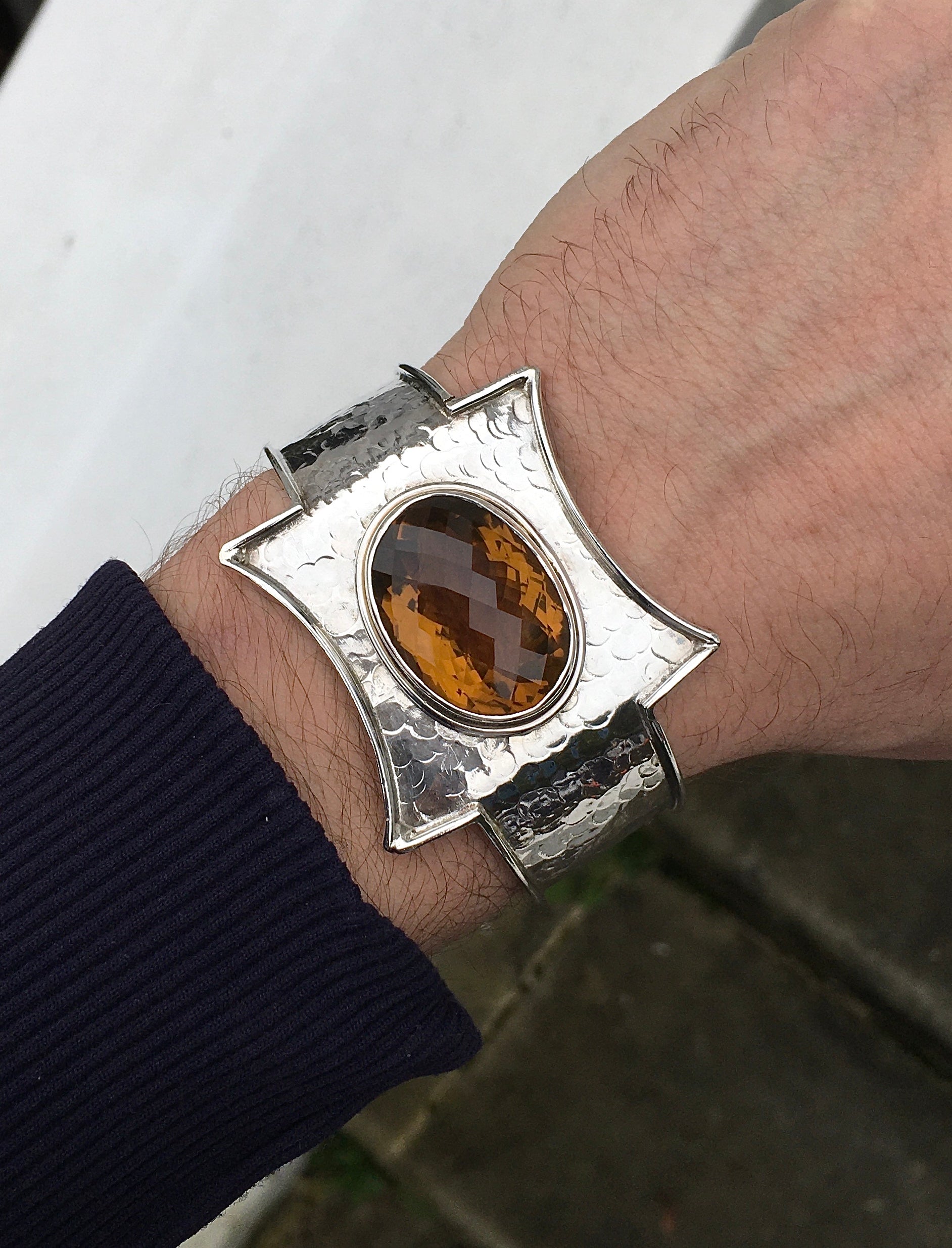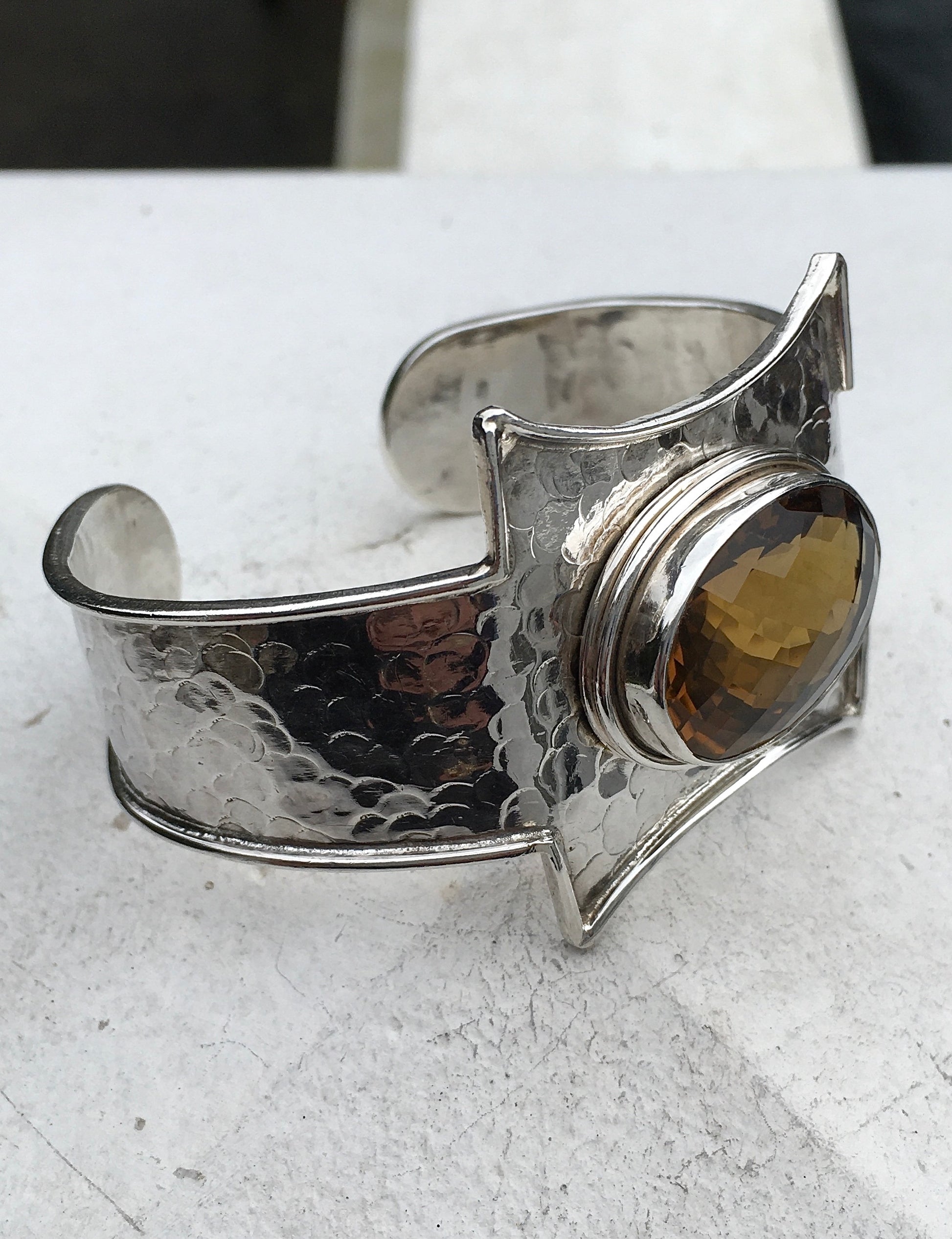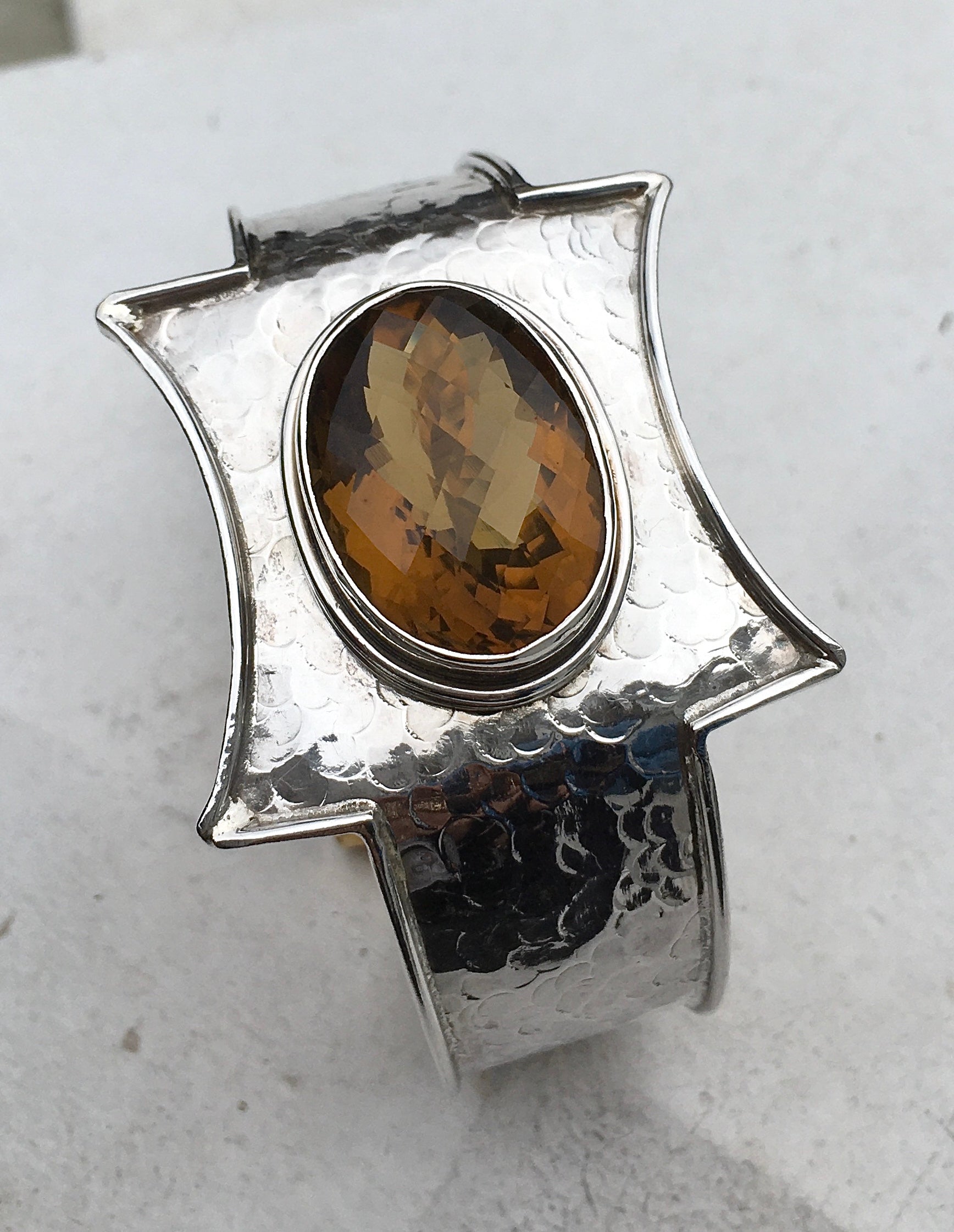 An eye-catching Sterling Silver hammered bangle featuring a large, faceted, bezel set Citrine