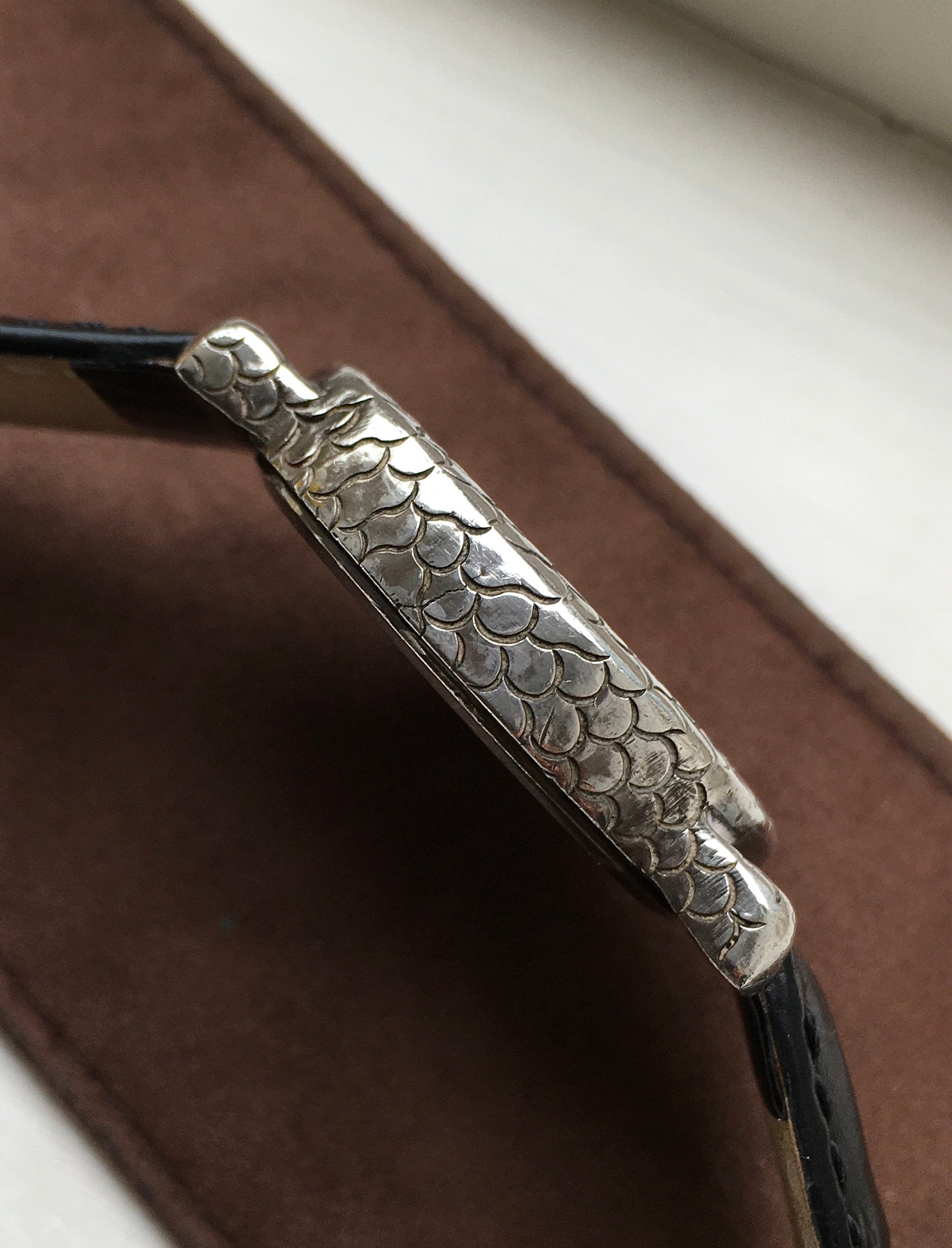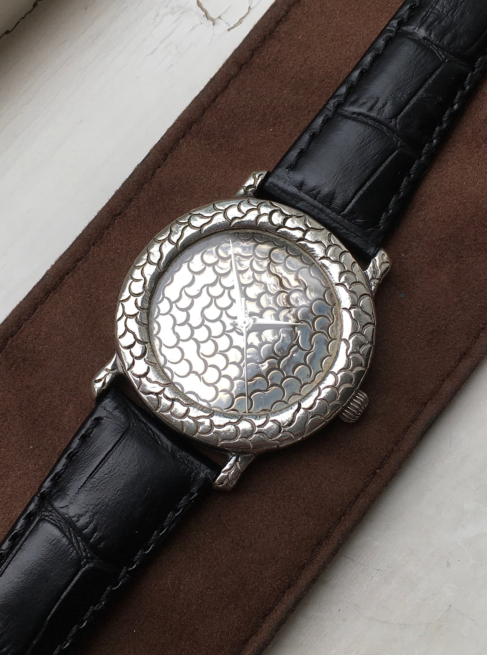The silver dial is decorated as if it were a continuation of the case with an engraved, scalelike finish . Telling the time are silvered Dauphine hands